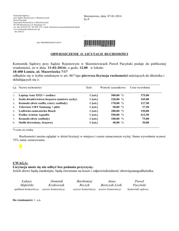 Komornik Sądowy przy Sądzie Rejonowym w Skierniewicach Paweł Pacyński Kancelaria Komornicza w Skierniewicach 96-100 Skierniewice ul. Reymonta 2A tel. /fax 46 8333176, 781 693 370 e-mail: [email protected] www.komornik-skierniewice.pl Km 504/12 Skierniewice, dnia 07-01-2014 Sz P . - *0020000568442* #łm *0020000568442*/0419/ OBWIESZCZENIE O LICYTACJI RUCHOMOŚCI Komornik Sądowy przy Sądzie Rejonowym w Skierniewicach Paweł Pacyński podaje do publicznej wiadomości, że w dniu 11-02-2014r. o godz. 12.00 w lokalu: 18-400 Łomża, ul. Mazowiecka 7/17 odbędzie się w trybie ustalonym w art. 867 kpc pierwsza licytacja ruchomości należących do dłużnika i składających się z: _______________________________________________________________________________________________________________________ Lp. Nazwa ruchomości Ilość Wartość szacunkowa Cena wywołania _________________________________________________________________________________________________________________________ 1. 2. 3. 4. 5. 6. 7. 8. Laptop Asus X52J + zasilacz Szafa dwudrzwiowa brązowa (matowe szyby) Komoda (dwie szafki, cztery szuflady) Telewizor CRT Samsung + pilot Lodówko-zamrażarka Bosch Pralka Ariston Aqualtis Komoda (dwie szuflady) Stolik drewniany, brązowy 1 [szt.] 1 [szt.] 1 [szt.] 1 [szt.] 1 [szt.] 1 [szt.] 1 [szt.] 1 [szt.] 500,00 220,00 170,00 50,00 200,00 550,00 100,00 40,00 *) *) *) *) *) *) *) *) 375,00 165,00 127,50 37,50 150,00 412,50 75,00 30,00 _______________________________________________________________________________________________________________________ *) cena za sztukę Ruchomości można oglądać w dzień licytacji w miejscu i czasie oznaczonym wyżej. Suma wywołania wynosi 75% sumy oszacowania. UWAGA: Licytacja może się nie odbyć bez podania przyczyny. Jeżeli drzwi będą zamknięte, będą otwierane na koszt i odpowiedzialność obowiązanegodłużnika. Łukasz Mąkolski aplikant komorniczy Do wiadomości: 1. a/a Dominik Krakowiak asesor komorniczy Bartłomiej Reczek Anna Bartczak-Lisik asesor komorniczy asesor komorniczy Paweł Pacyński komornik sądowy