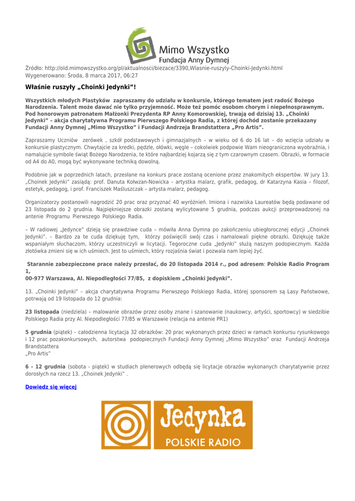 Źródło: http://old.mimowszystko.org/pl/aktualnosci/biezace/3390,Wlasnie-ruszyly-Choinki-Jedynki.html Wygenerowano: Środa, 8 marca 2017, 06:27 Właśnie ruszyły „Choinki Jedynki”! Wszystkich młodych Plastyków zapraszamy do udziału w konkursie, którego tematem jest radość Bożego Narodzenia. Talent może dawać nie tylko przyjemność. Może też pomóc osobom chorym i niepełnosprawnym. Pod honorowym patronatem Małżonki Prezydenta RP Anny Komorowskiej, trwają od dzisiaj 13. „Choinki Jedynki” – akcja charytatywna Programu Pierwszego Polskiego Radia, z której dochód zostanie przekazany Fundacji Anny Dymnej „Mimo Wszystko” i Fundacji Andrzeja Brandstattera „Pro Artis”. Zapraszamy Uczniów zerówek , szkół podstawowych i gimnazjalnych – w wieku od 6 do 16 lat – do wzięcia udziału w konkursie plastycznym. Chwytajcie za kredki, pędzle, ołówki, węgle – cokolwiek podpowie Wam nieograniczona wyobraźnia, i namalujcie symbole świąt Bożego Narodzenia, te które najbardziej kojarzą się z tym czarownym czasem. Obrazki, w formacie od A4 do A0, mogą być wykonywane techniką dowolną. Podobnie jak w poprzednich latach, przesłane na konkurs prace zostaną ocenione przez znakomitych ekspertów. W jury 13. „Choinek Jedynki” zasiądą: prof. Danuta Kołwzan-Nowicka – artystka malarz, grafik, pedagog, dr Katarzyna Kasia – filozof, estetyk, pedagog, i prof. Franciszek Maśluszczak – artysta malarz, pedagog. Organizatorzy postanowili nagrodzić 20 prac oraz przyznać 40 wyróżnień. Imiona i nazwiska Laureatów będą podawane od 23 listopada do 2 grudnia. Najpiękniejsze obrazki zostaną wylicytowane 5 grudnia, podczas aukcji przeprowadzonej na antenie Programu Pierwszego Polskiego Radia. – W radiowej „Jedynce” dzieją się prawdziwe cuda – mówiła Anna Dymna po zakończeniu ubiegłorocznej edycji „Choinek Jedynki”. – Bardzo za te cuda dziękuję tym, którzy poświęcili swój czas i namalowali piękne obrazki. Dziękuję także wspaniałym słuchaczom, którzy uczestniczyli w licytacji. Tegoroczne cuda „Jedynki” służą naszym podopiecznym. Każda złotówka zmieni się w ich uśmiech. Jest to uśmiech, który rozjaśnia świat i pozwala nam lepiej żyć. Starannie zabezpieczone prace należy przesłać, do 20 listopada 2014 r., pod adresem: Polskie Radio Program 1, 00-977 Warszawa, Al. Niepodległości 77/85, z dopiskiem „Choinki Jedynki”. 13. „Choinki Jedynki” – akcja charytatywna Programu Pierwszego Polskiego Radia, której sponsorem są Lasy Państwowe, potrwają od 19 listopada do 12 grudnia: 23 listopada (niedziela) – malowanie obrazów przez osoby znane i szanowanie (naukowcy, artyści, sportowcy) w siedzibie Polskiego Radia przy Al. Niepodległości 77/85 w Warszawie (relacja na antenie PR1) 5 grudnia (piątek) – całodzienna licytacja 32 obrazków: 20 prac wykonanych przez dzieci w ramach konkursu rysunkowego i 12 prac pozakonkursowych, autorstwa podopiecznych Fundacji Anny Dymnej „Mimo Wszystko” oraz Fundacji Andrzeja Brandstattera „Pro Artis” 6 - 12 grudnia (sobota - piątek) w studiach plenerowych odbędą się licytacje obrazów wykonanych charytatywnie przez dorosłych na rzecz 13. „Choinek Jedynki” . Dowiedz się więcej Tweet Galeria W ubiegłorocznych „Choinkach Jedynki” najwyżej wylicytowano pracę Adriana Wojciechowskiego – 4800 złotych, fot. Polskie Radio Logo tegorocznej akcji i aukcji