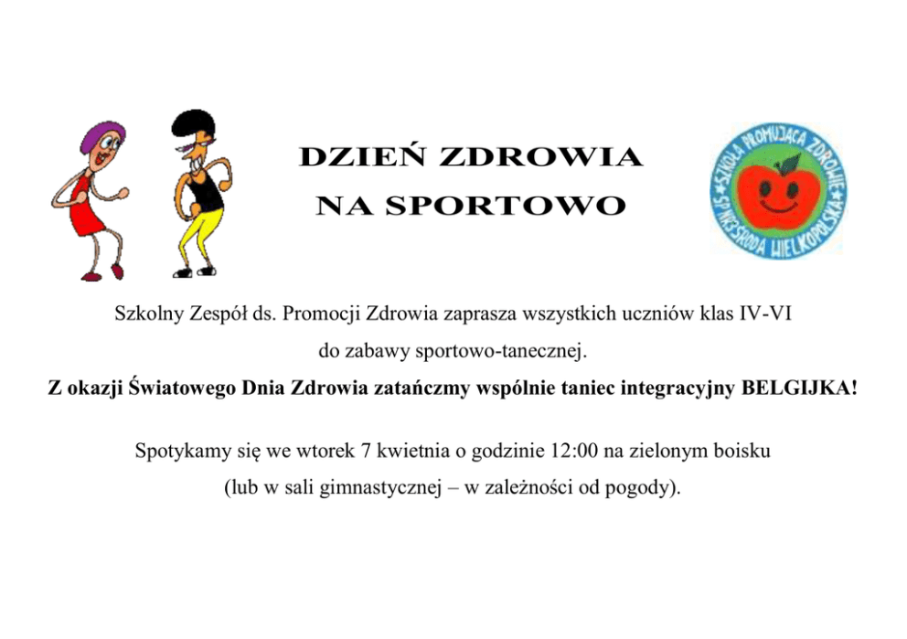 DZIEŃ ZDROWIA NA SPORTOWO Szkolny Zespół ds. Promocji Zdrowia zaprasza wszystkich uczniów klas IV-VI do zabawy sportowo-tanecznej. Z okazji Światowego Dnia Zdrowia zatańczmy wspólnie taniec integracyjny BELGIJKA! Spotykamy się we wtorek 7 kwietnia o godzinie 12:00 na zielonym boisku (lub w sali gimnastycznej – w zależności od pogody).