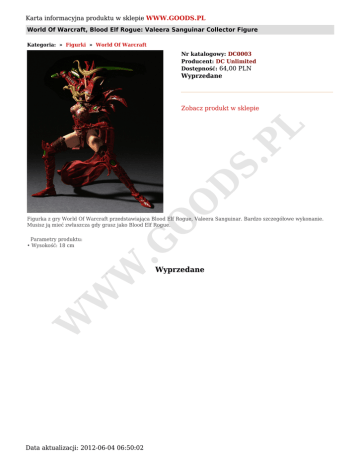 Karta informacyjna produktu w sklepie WWW.GOODS.PL World Of Warcraft, Blood Elf Rogue: Valeera Sanguinar Collector Figure Kategoria: » Figurki » World Of Warcraft Nr katalogowy: DC0003 Producent: DC Unlimited Dostępność: 64,00 PLN Wyprzedane O D S. PL Zobacz produkt w sklepie W .G Parametry produktu: • Wysokość: 18 cm O Figurka z gry World Of Warcraft przedstawiająca Blood Elf Rogue, Valeera Sanguinar. Bardzo szczegółowe wykonanie. Musisz ją mieć zwłaszcza gdy grasz jako Blood Elf Rogue. W W Wyprzedane Data aktualizacji: 2012-06-04 06:50:02