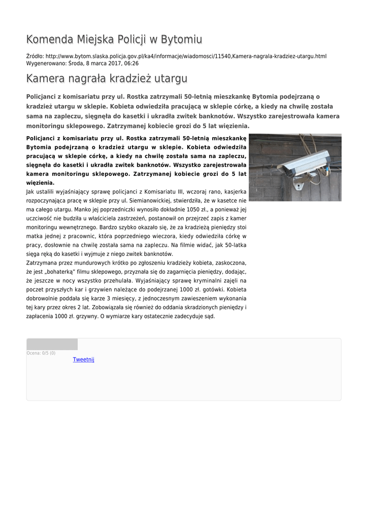 Komenda Miejska Policji w Bytomiu Źródło: http://www.bytom.slaska.policja.gov.pl/ka4/informacje/wiadomosci/11540,Kamera-nagrala-kradziez-utargu.html Wygenerowano: Środa, 8 marca 2017, 06:26 Kamera nagrała kradzież utargu Policjanci z komisariatu przy ul. Rostka zatrzymali 50-letnią mieszkankę Bytomia podejrzaną o kradzież utargu w sklepie. Kobieta odwiedziła pracującą w sklepie córkę, a kiedy na chwilę została sama na zapleczu, sięgnęła do kasetki i ukradła zwitek banknotów. Wszystko zarejestrowała kamera monitoringu sklepowego. Zatrzymanej kobiecie grozi do 5 lat więzienia. Policjanci z komisariatu przy ul. Rostka zatrzymali 50-letnią mieszkankę Bytomia podejrzaną o kradzież utargu w sklepie. Kobieta odwiedziła pracującą w sklepie córkę, a kiedy na chwilę została sama na zapleczu, sięgnęła do kasetki i ukradła zwitek banknotów. Wszystko zarejestrowała kamera monitoringu sklepowego. Zatrzymanej kobiecie grozi do 5 lat więzienia. Jak ustalili wyjaśniający sprawę policjanci z Komisariatu III, wczoraj rano, kasjerka rozpoczynająca pracę w sklepie przy ul. Siemianowickiej, stwierdziła, że w kasetce nie ma całego utargu. Manko jej poprzedniczki wynosiło dokładnie 1050 zł., a ponieważ jej uczciwość nie budziła u właściciela zastrzeżeń, postanowił on przejrzeć zapis z kamer monitoringu wewnętrznego. Bardzo szybko okazało się, że za kradzieżą pieniędzy stoi matka jednej z pracownic, która poprzedniego wieczora, kiedy odwiedziła córkę w pracy, dosłownie na chwilę została sama na zapleczu. Na filmie widać, jak 50-latka sięga ręką do kasetki i wyjmuje z niego zwitek banknotów. Zatrzymana przez mundurowych krótko po zgłoszeniu kradzieży kobieta, zaskoczona, że jest „bohaterką” filmu sklepowego, przyznała się do zagarnięcia pieniędzy, dodając, że jeszcze w nocy wszystko przehulała. Wyjaśniający sprawę kryminalni zajęli na poczet przyszłych kar i grzywien należące do podejrzanej 1000 zł. gotówki. Kobieta dobrowolnie poddała się karze 3 miesięcy, z jednoczesnym zawieszeniem wykonania tej kary przez okres 2 lat. Zobowiązała się również do oddania skradzionych pieniędzy i zapłacenia 1000 zł. grzywny. O wymiarze kary ostatecznie zadecyduje sąd. Ocena: 0/5 (0) Tweetnij