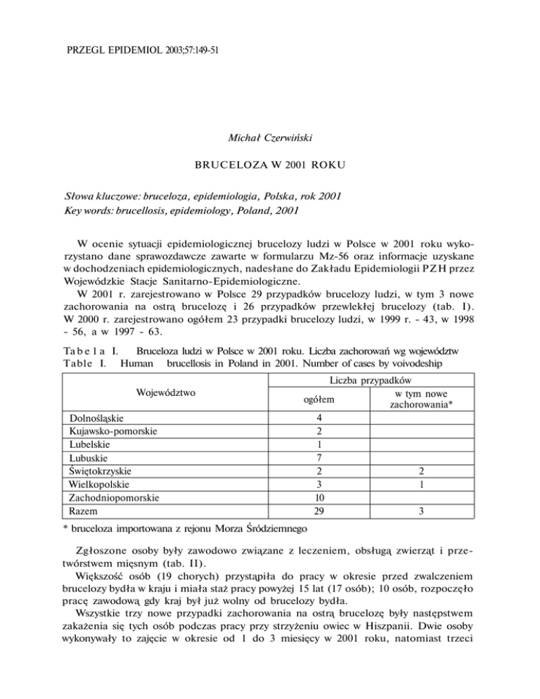 PRZEGL EPIDEMIOL 2003;57:149-51 Michał Czerwiński BRUCELOZA W 2001 ROKU Słowa kluczowe: bruceloza, epidemiologia, Polska, rok 2001 Key words: brucellosis, epidemiology, Poland, 2001 W ocenie sytuacji epidemiologicznej brucelozy ludzi w Polsce w 2001 roku wyko rzystano dane sprawozdawcze zawarte w formularzu Mz-56 oraz informacje uzyskane w dochodzeniach epidemiologicznych, nadesłane do Zakładu Epidemiologii PZH przez Wojewódzkie Stacje Sanitarno-Epidemiologiczne. W 2001 r. zarejestrowano w Polsce 29 przypadków brucelozy ludzi, w tym 3 nowe zachorowania na ostrą brucelozę i 26 przypadków przewlekłej brucelozy (tab. I). W 2000 r. zarejestrowano ogółem 23 przypadki brucelozy ludzi, w 1999 r. - 43, w 1998 - 56, a w 1997 - 63. Ta b e 1 a I. Bruceloza ludzi w Polsce w 2001 roku. Liczba zachorowań wg województw Table I. Human brucellosis in Poland in 2001. Number of cases by voivodeship Województwo Dolnośląskie Kujawsko-pomorskie Lubelskie Lubuskie Świętokrzyskie Wielkopolskie Zachodniopomorskie Razem Liczba przypadków w tym nowe ogółem zachorowania* 4 2 1 7 2 2 3 1 10 29 3 * bruceloza importowana z rejonu Morza Śródziemnego Zgłoszone osoby były zawodowo związane z leczeniem, obsługą zwierząt i prze twórstwem mięsnym (tab. II). Większość osób (19 chorych) przystąpiła do pracy w okresie przed zwalczeniem brucelozy bydła w kraju i miała staż pracy powyżej 15 lat (17 osób); 10 osób, rozpoczęło pracę zawodową gdy kraj był już wolny od brucelozy bydła. Wszystkie trzy nowe przypadki zachorowania na ostrą brucelozę były następstwem zakażenia się tych osób podczas pracy przy strzyżeniu owiec w Hiszpanii. Dwie osoby wykonywały to zajęcie w okresie od 1 do 3 miesięcy w 2001 roku, natomiast trzeci 150 Nr 1 M Czerwiński Ta b e 1 a I I . Bruceloza ludzi w Polsce w 2001 roku według zawodu, płci i daty zatrudnienia Ta b I e I I . Human brucellosis in Poland in 2001. Number of cases by sex, profession and time of professional activity Grupa zawodowa Służba weterynaryjna Służba zootechniczna Obsługa zwierząt Pracownicy zakładów mięsnych Inna* Razem M - mężczyźni K - kobiety Liczba zachorowań mężczyzn i kobiet ogółem Płeć Liczba osób zatrudnionych przed zwalczeniem brucelozy bydła M K M K M 6 1 2 2 2 M 5 7 M 1 19 1 29 9 4 8 * ekonomista (czasowo zastępował dyrektora ds. produkcji PGR) Ta b e 1 a I I I . Serologiczne podstawy rozpoznawania brucelozy u ludzi w Polsce w 2001 roku Table I I I . The serological state of chronicly ill human brucellosis cases registered in Poland in 2001 Grupa uzyskanych wyników Nie wykonano badań serologicznych Serologicznie ujemne Serologicznie wątpliwe Serologicznie dodatnie Bruceloza importowana Wyniki badań Liczba zbadanych osób - 3 OA(-) OWD (-) OA (-) OWD (-) OA (-) OWD (-) C (-) OA (+-) OA (+-) OWD (-) OA > 50 OWD (+) OA > 50 OWD (+) C (-) OA > 50 OWD (-) ELISA IgG (+-), IgM (-), IgA (+) OA > 50 OWD (+) ELISA IgG (+), IgM (+), IgA (-) Razem OA odczyn zlepny OWD odczyn wiązania dopełniacza C odczyn Coombsa 1 3 12 2 1 29 (+) dodatni (+-) wątpliwy (-) ujemny chory pracował na terenie Hiszpanii w latach 1996-97. Po powrocie do kraju u tych osób wystąpiła ostra lub podostra postać kliniczna brucelozy potwierdzona dodatnimi Nr 1 Bruceloza w 2001 r. 151 wynikami serologicznymi; surowica krwi dwóch osób zakażonych w 2001 roku reago wała dodatnio w odczynie zlepnym (OA) i wiązania dopełniacza (OWD), natomiast u trzeciej osoby został wykonany test ELISA, który wykazał obecność przeciwciał klasy IgM, IgG i IgA. W latach 1986 - 2001 zarejestrowano 40 przypadków brucelozy importowanych z rejonu Morza Śródziemnego. Rejestracja przewlekłej brucelozy wiąże się przeważnie ze sprawami roszczeń doty czących uznania choroby zawodowej. W 19 przypadkach przewlekłej brucelozy stwierdzono ujemne lub wątpliwe wyniki odczynów serologicznych (OA i OWD), a podejrzenie brucelozy podejmowano na podstawie wywiadu epidemiologicznego i klinicznego oraz aktualnie występujących objawów choroby. W dwóch przypadkach przewlekłej brucelozy stwierdzono dodatni OA w niskim rozcieńczeniu badanych surowic łącznie z dodatnim OWD, w jednym - jedynie dodatni O A, w jednym wykonano test ELISA, który wykazał obecność przeciwciał klasy IgA; na podstawie dochodzenia epidemiologicznego wykluczono w tych przypadkach moż liwość świeżego zakażenia pałeczką Brucella (tab. III). M Czerwiński HUMAN BRUCELLOSIS IN POLAND IN 2001 SUMMARY The registered 26 cases of human brucellosis in Poland comprise chronically ill professionals who in the past were involved for many years in the control of animal brucellosis. Three cases of acute infection were imported from Mediterranean region. Adres autora: Michał Czerwiński Zakład Epidemiologii Państwowego Zakładu Higieny ul. Chocimska 24, 00-791 Warszawa