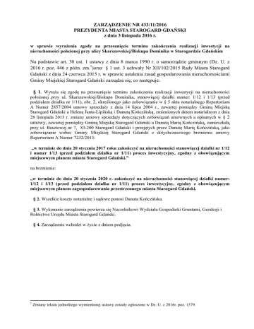 ZARZĄDZENIE NR 433/11/2016 PREZYDENTA MIASTA STAROGARD GDAŃSKI z dnia 3 listopada 2016 r. w sprawie wyrażenia zgody na przesunięcie terminu zakończenia realizacji inwestycji na nieruchomości położonej przy ulicy Skarszewskiej/Biskupa Dominika w Starogardzie Gdańskim Na podstawie art. 30 ust. 1 ustawy z dnia 8 marca 1990 r. o samorządzie gminnym (Dz. U. z 2016 r. poz. 446 z późn. zm.1)oraz § 1 ust. 3 uchwały Nr XII/102/2015 Rady Miasta Starogard Gdański z dnia 24 czerwca 2015 r. w sprawie ustalenia zasad gospodarowania nieruchomościami Gminy Miejskiej Starogard Gdański zarządza się, co następuje: § 1. Wyraża się zgodę na przesunięcie terminu zakończenia realizacji inwestycji na nieruchomości położonej przy ul. Skarszewskiej/Biskupa Dominika, stanowiącej działki numer: 1/12 i 1/13 (przed podziałem działka nr 1/11), obr. 2, określonego jako zobowiązanie w § 5 aktu notarialnego Repertorium A Numer 2857/2004 umowy sprzedaży z dnia 14 lipca 2004 r., zawartej pomiędzy Gminą Miejską Starogard Gdański a Heleną Janta-Lipińską i Danutą Kończińską, zmienionych aktem notarialnym z dnia 28 listopada 2013 r. zmiany umowy sprzedaży dotyczących zobowiązań umownych a opisanych w § 2 umowy, zawartej pomiędzy Gminą Miejską Starogard Gdański a Danutą Marią Kończińską, zamieszkałą przy ul. Basztowej nr 7, 83-200 Starogard Gdański i przejętych przez Danutę Marię Kończińską, jako zobowiązanie wobec Gminy Miejskiej Starogard Gdański z dotychczasowego brzmienia umowy Repertorium A Numer 7232/2013: „w terminie do dnia 20 stycznia 2017 roku zakończyć na nieruchomości stanowiącej działki nr 1/12 i numer 1/13 (przed podziałem działka nr 1/11) proces inwestycyjny, zgodny z obowiązującym miejscowym planem miasta Starogard Gdański.” na brzmienie: „w terminie do dnia 20 stycznia 2020 r. zakończyć na nieruchomości stanowiącej działki numer: 1/12 i 1/13 (przed podziałem działka nr 1/11) proces inwestycyjny, zgodny z obowiązującym miejscowym planem zagospodarowania przestrzennego miasta Starogard Gdański. § 2. Wszelkie koszty notarialne i sądowe ponosi Danuta Kończińska. § 3. Wykonanie zarządzenia powierza się Naczelnikowi Wydziału Gospodarki Gruntami, Geodezji i Rolnictwa Urzędu Miasta Starogard Gdański. § 4. Zarządzenie wchodzi w życie z dniem podjęcia. 1 Zmiany tekstu jednolitego wymienionej ustawy zostały ogłoszone w Dz. U. z 2016r. poz. 1579.