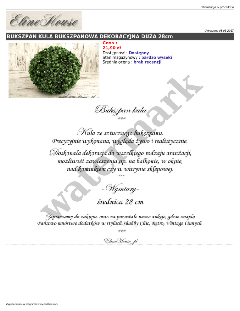 Informacje o produkcie Utworzono 08-03-2017 BUKSZPAN KULA BUKSZPANOWA DEKORACYJNA DUŻA 28cm Cena : 21,90 zł w at er m ar k Dostępność : Dostępny Stan magazynowy : bardzo wysoki Średnia ocena : brak recenzji Wygenerowano w programie www.oscGold.com