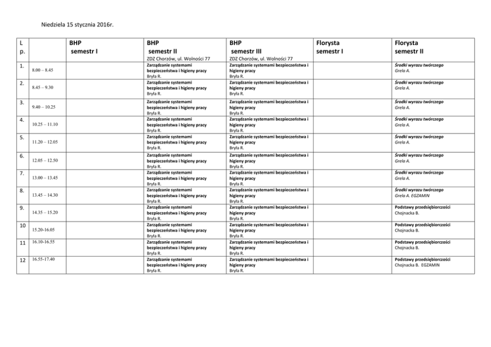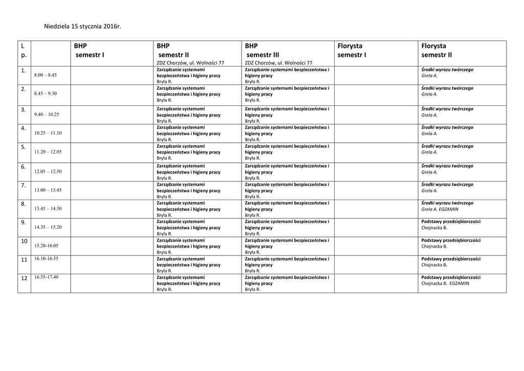 Niedziela 15 stycznia 2016r. L p. 1. 2. 3. 4. 5. 6. 7. 8. 9. 10 BHP semestr I 8.00 – 8.45 8.45 – 9.30 9.40 – 10.25 10.25 – 11.10 11.20 – 12.05 12.05 – 12.50 13.00 – 13.45 13.45 – 14.30 14.35 – 15.20 15.20-16.05 11 16.10-16.55 12 16.55-17.40 BHP semestr II BHP semestr III Florysta semestr I Florysta semestr II ZDZ Chorzów, ul. Wolności 77 ZDZ Chorzów, ul. Wolności 77 Zarządzanie systemami bezpieczeostwa i higieny pracy Bryła R. Zarządzanie systemami bezpieczeostwa i higieny pracy Bryła R. Zarządzanie systemami bezpieczeostwa i higieny pracy Bryła R. Zarządzanie systemami bezpieczeostwa i higieny pracy Bryła R. Środki wyrazu twórczego Grela A. Zarządzanie systemami bezpieczeostwa i higieny pracy Bryła R. Zarządzanie systemami bezpieczeostwa i higieny pracy Bryła R. Zarządzanie systemami bezpieczeostwa i higieny pracy Bryła R. Zarządzanie systemami bezpieczeostwa i higieny pracy Bryła R. Zarządzanie systemami bezpieczeostwa i higieny pracy Bryła R. Zarządzanie systemami bezpieczeostwa i higieny pracy Bryła R. Środki wyrazu twórczego Grela A. Zarządzanie systemami bezpieczeostwa i higieny pracy Bryła R. Zarządzanie systemami bezpieczeostwa i higieny pracy Bryła R. Zarządzanie systemami bezpieczeostwa i higieny pracy Bryła R. Zarządzanie systemami bezpieczeostwa i higieny pracy Bryła R. Zarządzanie systemami bezpieczeostwa i higieny pracy Bryła R. Zarządzanie systemami bezpieczeostwa i higieny pracy Bryła R. Zarządzanie systemami bezpieczeostwa i higieny pracy Bryła R. Zarządzanie systemami bezpieczeostwa i higieny pracy Bryła R. Zarządzanie systemami bezpieczeostwa i higieny pracy Bryła R. Zarządzanie systemami bezpieczeostwa i higieny pracy Bryła R. Zarządzanie systemami bezpieczeostwa i higieny pracy Bryła R. Zarządzanie systemami bezpieczeostwa i higieny pracy Bryła R. Zarządzanie systemami bezpieczeostwa i higieny pracy Bryła R. Zarządzanie systemami bezpieczeostwa i higieny pracy Bryła R. Środki wyrazu twórczego Grela A. Środki wyrazu twórczego Grela A. Środki wyrazu twórczego Grela A. Środki wyrazu twórczego Grela A. Środki wyrazu twórczego Grela A. Środki wyrazu twórczego Grela A. EGZAMIN Podstawy przedsiębiorczości Chojnacka B. Podstawy przedsiębiorczości Chojnacka B. Podstawy przedsiębiorczości Chojnacka B. Podstawy przedsiębiorczości Chojnacka B. EGZAMIN Niedziela 15 stycznia 2016r. L p. 1. 2. 3. 4. 5. 6. 7. 8. 9. 10 Animator kultury semestr I Bibliotekarz semestr I Animator kultury semestr III Bibliotekarz semestr III 8.00 – 8.45 Wiedza o nauce i literaturze niebeletrystycznej Pieniek Małgorzata Gromadzenie i udostępnianie zbiorów Cofałka Zofia 8.45 – 9.30 Wiedza o nauce i literaturze niebeletrystycznej Pieniek Małgorzata Gromadzenie i udostępnianie zbiorów Cofałka Zofia 9.40 – 10.25 Źródła informacji, działalnośd informacyjna Noras Michał Podstawy organizacji i kierowania Pieniek Małgorzata Gromadzenie i udostępnianie zbiorów Cofałka Zofia 10.25 – 11.10 Źródła informacji, działalnośd informacyjna Noras Michał Podstawy organizacji i kierowania Pieniek Małgorzata Opracowanie zbiorów Cofałka Zofia Wiedza o nauce i literaturze niebeletrystycznej Pieniek Małgorzata Podstawy wiedzy o filmie Omelan Elżbieta 12.05 – 12.50 Podstawy wiedzy o filmie Omelan Elżbieta 13.00 – 13.45 Podstawy wiedzy o filmie Omelan Elżbieta Wiedza o czytelnictwie Pieniek Małgorzata Podstawy wiedzy o filmie Omelan Elżbieta Źródła informacji, działalnośd informacyjna Noras Michał 13.45 – 14.30 Podstawy wiedzy o filmie Omelan Elżbieta Wiedza o czytelnictwie Pieniek Małgorzata Podstawy wiedzy o filmie Omelan Elżbieta Źródła informacji, działalnośd informacyjna Noras Michał 14.35 – 15.20 Podstawy wiedzy o filmie Omelan Elżbieta Podstawy wiedzy o filmie Omelan Elżbieta Technologie informacyjne Pieniek Małgorzata Psychologiczno-pedagogiczne podstawy animacji Halama Agata Wiedza o kulturze Kozioł Jacek Psychologiczno-pedagogiczne podstawy animacji Halama Agata Wiedza o kulturze Kozioł Jacek 15.20-16.05 11 16.10-16.55 12 16.55-17.40 Wiedza o czytelnictwie Pieniek Małgorzata Podstawy wiedzy o filmie Omelan Elżbieta Opracowanie zbiorów Cofałka Zofia 11.20 – 12.05 Podstawy wiedzy o filmie Omelan Elżbieta Opracowanie zbiorów Cofałka Zofia Technologie informacyjne Pieniek Małgorzata Komputeryzacja biblioteki Pieniek Małgorzata Komputeryzacja biblioteki Pieniek Małgorzata