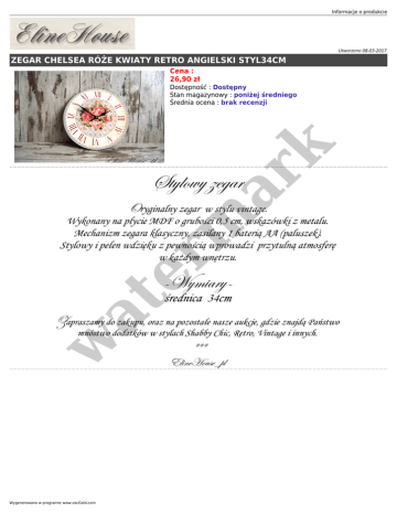 Informacje o produkcie Utworzono 08-03-2017 ZEGAR CHELSEA RÓŻE KWIATY RETRO ANGIELSKI STYL34CM Cena : 26,90 zł w at er m ar k Dostępność : Dostępny Stan magazynowy : poniżej średniego Średnia ocena : brak recenzji Wygenerowano w programie www.oscGold.com