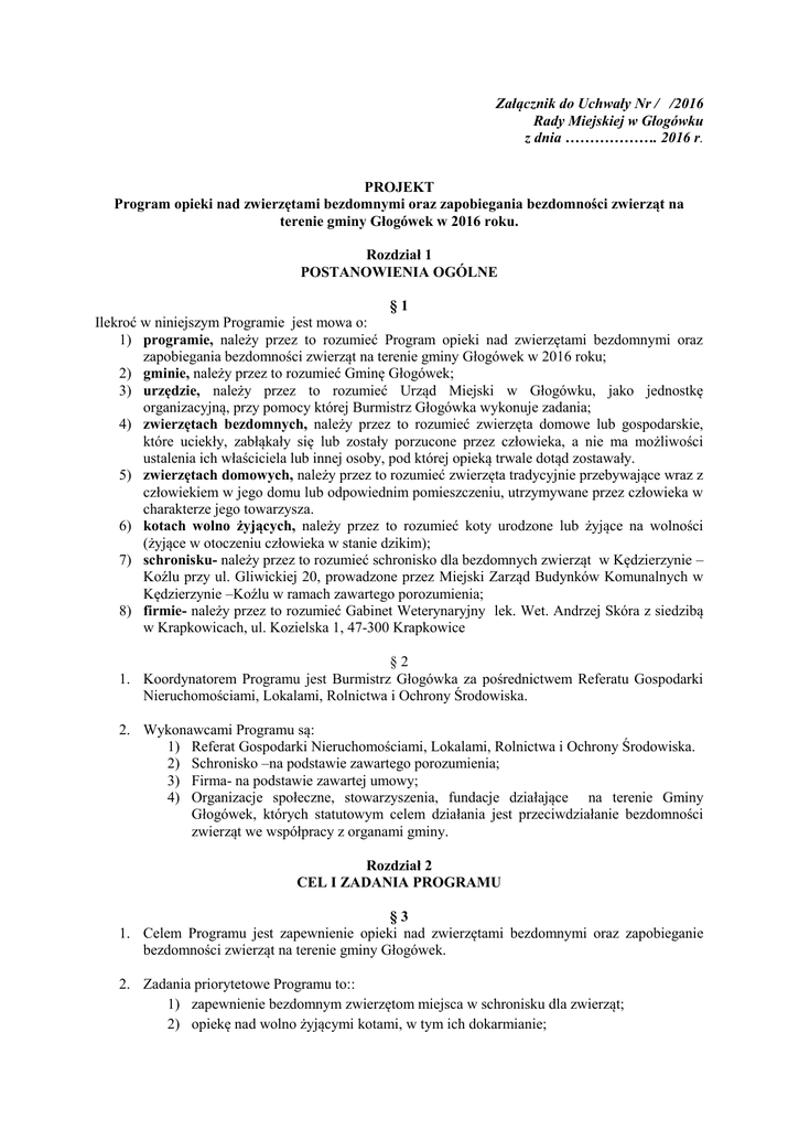 Załącznik do Uchwały Nr / /2016 Rady Miejskiej w Głogówku z dnia ………………. 2016 r. PROJEKT Program opieki nad zwierzętami bezdomnymi oraz zapobiegania bezdomności zwierząt na terenie gminy Głogówek w 2016 roku. Rozdział 1 POSTANOWIENIA OGÓLNE §1 Ilekroć w niniejszym Programie jest mowa o: 1) programie, należy przez to rozumieć Program opieki nad zwierzętami bezdomnymi oraz zapobiegania bezdomności zwierząt na terenie gminy Głogówek w 2016 roku; 2) gminie, należy przez to rozumieć Gminę Głogówek; 3) urzędzie, należy przez to rozumieć Urząd Miejski w Głogówku, jako jednostkę organizacyjną, przy pomocy której Burmistrz Głogówka wykonuje zadania; 4) zwierzętach bezdomnych, należy przez to rozumieć zwierzęta domowe lub gospodarskie, które uciekły, zabłąkały się lub zostały porzucone przez człowieka, a nie ma możliwości ustalenia ich właściciela lub innej osoby, pod której opieką trwale dotąd zostawały. 5) zwierzętach domowych, należy przez to rozumieć zwierzęta tradycyjnie przebywające wraz z człowiekiem w jego domu lub odpowiednim pomieszczeniu, utrzymywane przez człowieka w charakterze jego towarzysza. 6) kotach wolno żyjących, należy przez to rozumieć koty urodzone lub żyjące na wolności (żyjące w otoczeniu człowieka w stanie dzikim); 7) schronisku- należy przez to rozumieć schronisko dla bezdomnych zwierząt w Kędzierzynie – Koźlu przy ul. Gliwickiej 20, prowadzone przez Miejski Zarząd Budynków Komunalnych w Kędzierzynie –Koźlu w ramach zawartego porozumienia; 8) firmie- należy przez to rozumieć Gabinet Weterynaryjny lek. Wet. Andrzej Skóra z siedzibą w Krapkowicach, ul. Kozielska 1, 47-300 Krapkowice §2 1. Koordynatorem Programu jest Burmistrz Głogówka za pośrednictwem Referatu Gospodarki Nieruchomościami, Lokalami, Rolnictwa i Ochrony Środowiska. 2. Wykonawcami Programu są: 1) Referat Gospodarki Nieruchomościami, Lokalami, Rolnictwa i Ochrony Środowiska. 2) Schronisko –na podstawie zawartego porozumienia; 3) Firma- na podstawie zawartej umowy; 4) Organizacje społeczne, stowarzyszenia, fundacje działające na terenie Gminy Głogówek, których statutowym celem działania jest przeciwdziałanie bezdomności zwierząt we współpracy z organami gminy. Rozdział 2 CEL I ZADANIA PROGRAMU §3 1. Celem Programu jest zapewnienie opieki nad zwierzętami bezdomnymi oraz zapobieganie bezdomności zwierząt na terenie gminy Głogówek. 2. Zadania priorytetowe Programu to:: 1) zapewnienie bezdomnym zwierzętom miejsca w schronisku dla zwierząt; 2) opiekę nad wolno żyjącymi kotami, w tym ich dokarmianie; 3) odławianie bezdomnych zwierząt; 4) obligatoryjna sterylizacja albo kastracja bezdomnych zwierząt w schronisku dla zwierząt; 5) poszukiwanie właścicieli dla bezdomnych zwierząt; 6) usypianie ślepych miotów; 7) wskazanie gospodarstwa rolnego w celu zapewnienia miejsca dla zwierząt gospodarskich; 8) zapewnienie całodobowej opieki weterynaryjnej w przypadkach zdarzeń drogowych z udziałem zwierząt. Rozdział 3 OPIEKA NAD ZWIERZĘTAMI §4 Zapewnienie bezdomnym zwierzętom odłowionym z terenu gminy Głogówek miejsca w schronisku dla zwierząt realizowane będzie we współpracy z urzędem (Referatem Gospodarki Nieruchomościami, Lokalami, Rolnictwa i Ochrony Środowiska) przez: 1) Schronisko dla bezdomnych zwierząt w Kędzierzynie-Koźlu – w ramach zawartego porozumienia. 2) Gabinet Weterynaryjny , lek. wet. Andrzej Skóra– w ramach zawartej umowy. 3) Gospodarstwo rolne, zapewniające miejsce i odpowiednie warunki bytowe dla zwierząt gospodarskich spełniające standardy sanitarne i weterynaryjne, o których mowa w ustawie z dnia 11 marca 2004 r. o ochronie zdrowia zwierząt oraz zwalczaniu chorób zakaźnych (tekst jednolity: 2015 r. poz. 266, 470) wskazane przez Burmistrza Głogówka na podstawie art.7 ust. 1 pkt 2 ustawy z dnia 21 sierpnia 1997 r. o ochronie zwierząt. §5 Sprawowanie opieki nad kotami wolno żyjącymi w tym ich dokarmianie realizowane będzie przez powierzenie realizacji tych zadań Gabinetowi Weterynaryjnemu, lek. wet. Andrzej Skóra poprzez: a) ustalenie miejsc (w tym obiektów budowlanych), w których przebywają koty wolno żyjące; b) stworzenie kotom wolno żyjącym warunków bytowania w miejscu ich dotychczasowego schronienia; c) zapewnienie ich dokarmiania, §6 Odławianie bezdomnych zwierząt z terenu gminy Głogówek, co do których nie ma możliwości ustalenia ich właściciela lub innej osoby, pod której opieką trwale dotąd pozostawały i będzie miało charakter: 1) stały, w odniesieniu do pojedynczych zgłoszeń z terenu gminy o błąkających się bezdomnych zwierzętach w szczególności chorych lub powodujących zagrożenie bezpieczeństwa i porządku publicznego; 2) okresowych, na określonych obszarach gminy lub w odniesieniu do grup bezdomnych zwierząt, w razie stwierdzenia takiej konieczności przez Powiatowego Lekarza Weterynarii lub Burmistrza Głogówka, na podstawie informacji uzyskanych od mieszkańców . §7 Ograniczanie populacji bezdomnych zwierząt, poprzez ich sterylizację i kastrację realizowane będzie przez schronisko na zasadach ustalonych z jednostkami prowadzącymi schronisko lub Gabinet Weterynaryjny , lek. wet. Andrzej Skóra poprzez obligatoryjne przeprowadzanie zabiegów sterylizacji i kastracji zwierząt odłowionych z terenu Gminy z wyjątkiem zwierząt, u których istnieją przeciwwskazania do wykonania tych zabiegów, z uwagi na stan zdrowia lub wiek. §8 Poszukiwanie nowych właścicieli dla bezdomnych zwierząt realizowane będzie przez Schronisko oraz Gabinet Weterynaryjny , lek. wet. Andrzej Skóra , poprzez prowadzenie działań zmierzających do pozyskiwania nowych właścicieli i oddawania do adopcji bezdomnych zwierząt osobom zainteresowanym i zdolnym zapewnić im należyte warunki bytowania. §9 Usypianie ślepych miotów, zgodnie z art. 11a ust. 2 pkt 6 ustawy o ochronie zwierząt z d