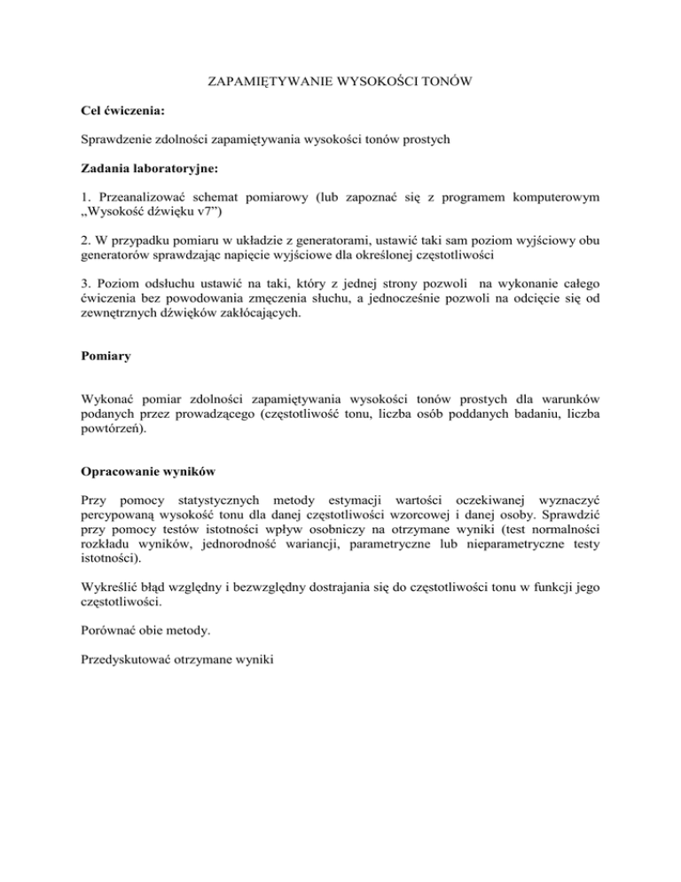 ZAPAMIĘTYWANIE WYSOKOŚCI TONÓW Cel ćwiczenia: Sprawdzenie zdolności zapamiętywania wysokości tonów prostych Zadania laboratoryjne: 1. Przeanalizować schemat pomiarowy (lub zapoznać się z programem komputerowym „Wysokość dźwięku v7”) 2. W przypadku pomiaru w układzie z generatorami, ustawić taki sam poziom wyjściowy obu generatorów sprawdzając napięcie wyjściowe dla określonej częstotliwości 3. Poziom odsłuchu ustawić na taki, który z jednej strony pozwoli na wykonanie całego ćwiczenia bez powodowania zmęczenia słuchu, a jednocześnie pozwoli na odcięcie się od zewnętrznych dźwięków zakłócających. Pomiary Wykonać pomiar zdolności zapamiętywania wysokości tonów prostych dla warunków podanych przez prowadzącego (częstotliwość tonu, liczba osób poddanych badaniu, liczba powtórzeń). Opracowanie wyników Przy pomocy statystycznych metody estymacji wartości oczekiwanej wyznaczyć percypowaną wysokość tonu dla danej częstotliwości wzorcowej i danej osoby. Sprawdzić przy pomocy testów istotności wpływ osobniczy na otrzymane wyniki (test normalności rozkładu wyników, jednorodność wariancji, parametryczne lub nieparametryczne testy istotności). Wykreślić błąd względny i bezwzględny dostrajania się do częstotliwości tonu w funkcji jego częstotliwości. Porównać obie metody. Przedyskutować otrzymane wyniki