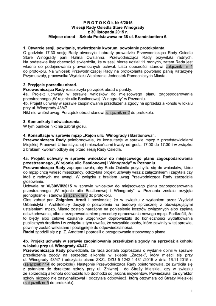 P R O T O K Ó Ł Nr 6/2015 VI sesji Rady Osiedla Stare Winogrady z 30 listopada 2015 r. Miejsce obrad – Szkoła Podstawowa nr 38 ul. Brandstaettera 6. 1. Otwarcie sesji, powitanie, stwierdzenie kworum, powołanie protokolanta. O godzinie 17.30 sesję Rady otworzyła i obrady prowadziła Przewodnicząca Rady Osiedla Stare Winogrady pani Halina Owsianna. Przewodnicząca Rady przywitała radnych. Na podstawie listy obecności stwierdziła, że w sesji bierze udział 11 radnych, zatem Rada jest władna do podejmowania prawomocnych uchwał. Lista obecności stanowi załącznik nr 1 do protokołu. Na wniosek Przewodniczącej Rady na protokolanta powołano panią Katarzynę Przymuszałę, pracownika Wydziału Wspierania Jednostek Pomocniczych Miasta. 2. Przyjęcie porządku obrad. Przewodnicząca Rady rozszerzyła porządek obrad o punkty: 4a. Projekt uchwały w sprawie wniosków do miejscowego planu zagospodarowania przestrzennego „W rejonie ulic Bastionowej i Winogrady” w Poznaniu. 4b. Projekt uchwały w sprawie zaopiniowania przedłużenia zgody na sprzedaż alkoholu w lokalu przy ul. Winogrady 43/47. Nikt nie wniósł uwag. Porządek obrad stanowi załącznik nr 2 do protokołu. 3. Komunikaty i oświadczenia. W tym punkcie nikt nie zabrał głosu. 4. Konsultacje w sprawie mpzp „Rejon ulic Winogrady i Bastionowa”. Przewodnicząca Rady poinformowała, że konsultacje w sprawie mpzp z przedstawicielami Miejskiej Pracowni Urbanistycznej i mieszkańcami trwały od godz. 17.00 do 17.30 i w związku z brakiem kworum odbyły się przed sesją Rady Osiedla. 4a. Projekt uchwały w sprawie wniosków do miejscowego planu zagospodarowania przestrzennego „W rejonie ulic Bastionowej i Winogrady” w Poznaniu. Przewodnicząca Rady zaproponowała, aby Rada Osiedla przychyliła się do wniosków, które do mpzp chcą wnieść mieszkańcy, odczytała projekt uchwały wraz z załącznikiem i zapytała czy ktoś z radnych ma uwagi. W związku z brakiem uwag Przewodnicząca Rady zarządziła głosowanie. Uchwała nr VI/30/VII/2015 w sprawie wniosków do miejscowego planu zagospodarowania przestrzennego „W rejonie ulic Bastionowej i Winogrady” w Poznaniu została przyjęta jednogłośnie i stanowi załącznik nr 3 do protokołu. Głos zabrał pan Zbigniew Arndt i powiedział, że w związku z wydaniem przez Wydział Urbanistyki i Architektury decyzji o pozwoleniu na budowę sprzecznej z obowiązującymi ustaleniami mpzp, Miasto zostało narażone na poniesienie kosztów związanych albo zapłatą odszkodowania, albo z przeprowadzeniem procedury opracowania nowego mpzp. Podkreślił, że to błędy albo celowe działanie urzędników doprowadziło do konieczności wydatkowania publicznych środków i w związku z tym uważa, że wszystkie osoby, które zawiniły w tej sprawie, powinny zostać wskazane i pociągnięte do odpowiedzialności. Radni zgodzili się z p. Z. Arndtem i poprosili o przygotowanie stosownego pisma. 4b. Projekt uchwały w sprawie zaopiniowania przedłużenia zgody na sprzedaż alkoholu w lokalu przy ul. Winogrady 43/47. Przewodnicząca Rady powiedziała, że rada została poproszona o wydanie opinii w sprawie przedłużenia zgody na sprzedaż alkoholu w sklepie „Żaczek”, który mieści się przy ul. Winogrady 43/47 i odczytała pismo ZKZL DZU 5-1242-1-431-/2015 z dnia 16.11.2015 r. (załącznik nr 4 do protokołu). Następnie Przewodnicząca Rady poinformowała, że zwróciła się z pytaniem do dyrektora szkoły przy ul. Żniwnej i do Straży Miejskiej, czy w związku ze sprzedażą alkoholu dochodziło lub dochodzi do jakichś incydentów. Powiedziała, że dyrektor szkoły niczego nie zasygnalizował i odczytała odpowiedź, którą otrzymała od Straży Miejskiej (załącznik nr 5 do protokołu). 1 W związku z powyższym zaproponowała, aby podjąć uchwałę. Przewodnicząca Rady odczytała projekt uchwały sprawie zaopiniowania przedłużenia zgody na sprzedaż alkoholu w lokalu przy ul. Winogrady 43/47 i zapytała, czy ktoś ma uwagi. W związku z brakiem uwag, zarządziła głosowanie. Uchwała nr VI/31/VII/2015 w sprawie zaopiniowania przedłużenia zgody na sprzedaż alkoholu w lokalu przy ul. Winogrady 43/47 została przyjęta jednogłośnie i stanowi załącznik nr 6 do protokołu. 5. Projekt uchwały w sprawie przyznania diet dla członków organów Osiedla. Przewodnicząca Rady odczytała projekt uchwały wraz z uzasadnieniem i zarządziła głosowanie. Uchwała nr VI/32/VII/2015 w sprawie przyznania diet dla członków organów Osiedla została przyjęta jednogłośnie i stanowi załącznik nr 7 do protokołu. 6. Omówienie spraw bieżących. Przewodnicząca Rady zwróciła się do członków komisji Porządku i Bezpieczeństwa z prośbą o sprawdzenie, w których miejscach na osiedlu jest bałagan, żeby można było podjąć odpowiednie działania. 7. Wolne głosy i wnioski. Głos zabrały następujące osoby i poruszyły sprawy: Pani Maria Jurczyszyn zwróciła uwagę na brzydki wygląd parkingu przy Cytadeli. Radni ustalili, że w przyszłości rozważą posadzenie krzewów oddzielających teren Cytadeli od parkingu. Pan Zygmunt Woźny powiedział, że jeśli w przyszłości wpłynie wniosek o przedłużenie zgody na sprzedaż alkoholu w kioskach przy pętli tramwajowej na ul. Przełajowej, to nie należy jej udzielić, ze względu na bliską odległość od szkoły, zanieczyszczanie moczem okolicy i zaczepianie przechodniów przez osoby spożywające przy kioskach alkohol. Radni zgodzili się z p. Woźnym. Pani Małgorzata Ptak-Adamczewska powiedziała, że na ul. Gronowej przy markecie Biedronka zostały posadzone drzewa, ale nadal nie jest sprzątany chodnik. Odpowiadając Przewodnicząca Rady poprosiła o wykonanie zdjęć w celu podjęcia dalszej interwencji. Pani Alicja Świtała zapytała kiedy będzie remontowany chodnik na ul. Pasieka. Przewodnicząca Rady odpowiedziała, że w przyszłym roku. Pan Janusz Wolski zgłosił konieczność ponowie