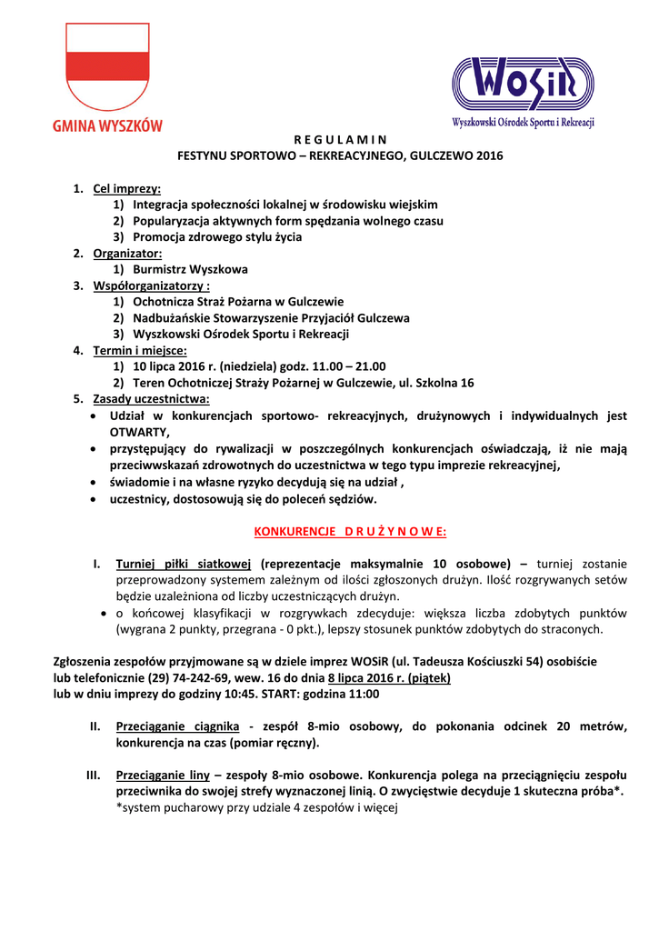 REGULAMIN FESTYNU SPORTOWO – REKREACYJNEGO, GULCZEWO 2016 1. Cel imprezy: 1) Integracja społeczności lokalnej w środowisku wiejskim 2) Popularyzacja aktywnych form spędzania wolnego czasu 3) Promocja zdrowego stylu życia 2. Organizator: 1) Burmistrz Wyszkowa 3. Współorganizatorzy : 1) Ochotnicza Straż Pożarna w Gulczewie 2) Nadbużańskie Stowarzyszenie Przyjaciół Gulczewa 3) Wyszkowski Ośrodek Sportu i Rekreacji 4. Termin i miejsce: 1) 10 lipca 2016 r. (niedziela) godz. 11.00 – 21.00 2) Teren Ochotniczej Straży Pożarnej w Gulczewie, ul. Szkolna 16 5. Zasady uczestnictwa: Udział w konkurencjach sportowo- rekreacyjnych, drużynowych i indywidualnych jest OTWARTY, przystępujący do rywalizacji w poszczególnych konkurencjach oświadczają, iż nie mają przeciwwskazań zdrowotnych do uczestnictwa w tego typu imprezie rekreacyjnej, świadomie i na własne ryzyko decydują się na udział , uczestnicy, dostosowują się do poleceń sędziów. KONKURENCJE D R U Ż Y N O W E: I. Turniej piłki siatkowej (reprezentacje maksymalnie 10 osobowe) – turniej zostanie przeprowadzony systemem zależnym od ilości zgłoszonych drużyn. Ilość rozgrywanych setów będzie uzależniona od liczby uczestniczących drużyn. o końcowej klasyfikacji w rozgrywkach zdecyduje: większa liczba zdobytych punktów (wygrana 2 punkty, przegrana - 0 pkt.), lepszy stosunek punktów zdobytych do straconych. Zgłoszenia zespołów przyjmowane są w dziele imprez WOSiR (ul. Tadeusza Kościuszki 54) osobiście lub telefonicznie (29) 74-242-69, wew. 16 do dnia 8 lipca 2016 r. (piątek) lub w dniu imprezy do godziny 10:45. START: godzina 11:00 II. Przeciąganie ciągnika - zespół 8-mio osobowy, do pokonania odcinek 20 metrów, konkurencja na czas (pomiar ręczny). III. Przeciąganie liny – zespoły 8-mio osobowe. Konkurencja polega na przeciągnięciu zespołu przeciwnika do swojej strefy wyznaczonej linią. O zwycięstwie decyduje 1 skuteczna próba*. *system pucharowy przy udziale 4 zespołów i więcej KONKURENCJE I N D Y W I D U A L N E : UWAGA!!! ROZPOCZĘCIE KONKURENCJI INDYWIDUALNYCH OD GODZ. 15.00 IV. Konkurencja dla Sołtysów – NIESPODZIANKA V. Bieg z wężem – konkurencja dla dzieci (przygotowana przez OSP Gulczewo) VI. Waga płaczu - (konkurencja przygotowana przez OSP Gulczewo) VII. Piramida - (konkurencja przygotowana przez OSP w Gulczewo) VIII. Konkurencja dla Pań - tor przeszkód 6. Nagrody: w konkurencjach indywidualnych i drużynowych puchary za miejsca I-III oraz nagrody rzeczowe (konkurencje I, V, VI) dopuszcza się dodatkowe nagrody ufundowane przez sponsorów. 7. Postanowienia końcowe: Zawodnicy zobowiązani są do przestrzegania elementarnych zasad kultury i szacunku. Za znieważenie sędziego, innego zawodnika lub kibiców, sędziemu przysługuje prawo dyskwalifikacji zawodnika lub drużyny. Zawodnicy biorący udział w konkurencjach indywidualnych i drużynowych zobowiązani są do posiadanie na sobie koszulek. Przystępujący do udziału w poszczególnych konkurencjach, zawodnik(-czka) akceptuje niniejszy regulamin i wyraża zgodę na nieodpłatne wykorzystanie jego (jej) wizerunku utrwalonego w formie fotografii lub zapisu wideo oraz udziela Organizatorom nieodpłatnej licencji na wykorzystanie go na wszystkich polach eksploatacji w tym: utrwalenia i rozpowszechniania w dowolnej formie oraz wprowadzanie do pamięci komputera. Wykorzystania do promocji i organizacji imprez Organizatorów, na promocyjnych materiałach drukowanych, w prasie, na stronach internetowych. Uczestnik(-czka) wyraża także zgodę na przetwarzanie jego danych osobowych dla potrzeb związanych z organizacją i promocją imprez Organizatorów . W sprawach spornych i nie ujętych w niniejszym regulaminie, „rozstrzygający głos” należy do organizatorów.