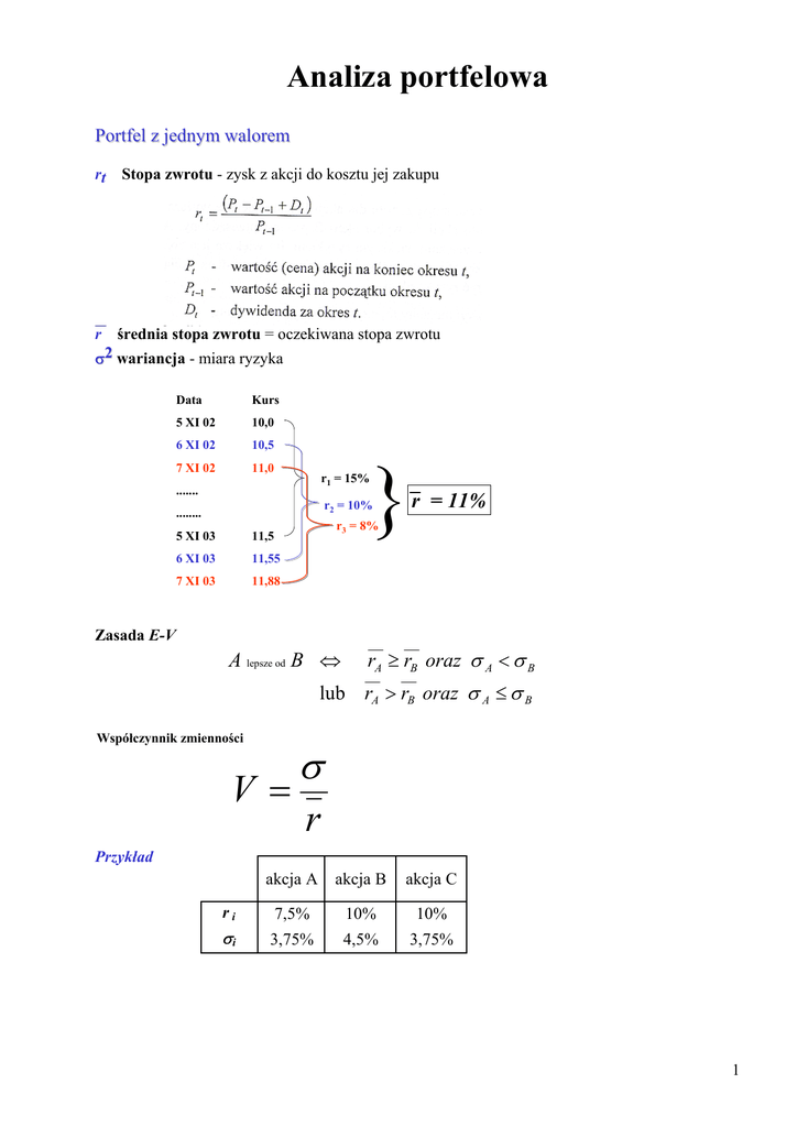 Analiza portfelowa Portfel z jednym walorem rt Stopa zwrotu - zysk z akcji do kosztu jej zakupu r średnia stopa zwrotu = oczekiwana stopa zwrotu σ2 wariancja - miara ryzyka Data Kurs 5 XI 02 10,0 6 XI 02 10,5 7 XI 02 11,0 r1 = 15% ....... } r2 = 10% ........ r = 11% r3 = 8% 5 XI 03 11,5 6 XI 03 11,55 7 XI 03 11,88 Zasada E-V A lepsze od B ⇔ rA ≥ rB oraz σ A < σ B lub rA > rB oraz σ A ≤ σ B Współczynnik zmienności σ V= r Przykład akcja A akcja B akcja C ri 7,5% 10% 10% σi 3,75% 4,5% 3,75% 1 Portfel z dwoma walorami rP - stopa zwrotu z portfela akcji ri - stopa zwrotu z i-tej akcji xi - udział i-tej akcji w portfelu n rP = ∑ xi ⋅ ri i =1 σ P2 = x A2σ A2 + xB2σ B2 + 2 x A xB cov( A, B ) σBρ σ P2 = x A2σ A2 + xB2σ B2 + 2 x A xB σ cov( , BAB) A A σP - odchylenie standardowe portfela akcji ρAB - współczynnik korelacji stóp zwrotu akcji A i B Przykład Dokonać analizy pakietu skłądającego się z dwóch akcji przy różnych wartościach współczynnika korelacji (1, 0, -1). Akcje Udział w pakiecie xi A 1/3 B 2/3 Stopa zwrotu ri 20% 10% Odchylenie standardowe σi 25% 12,5% 2 Współczynnik korelacji a ryzyko portfela 25% 20% σ 15% 10% 5% 0% 0 0,2 0,4 ρ=−1 ρ=0 0,6 X1 ρ=0,5 0,8 1 ρ=1 Portfel z wieloma walorami r g f D e C B A σ 3 Modele Markowitz’a r D g σp ≤σ* f e r* rP → max C B h A σ∗ σ r D g r* rP ≥ r * f e σ p → min C B h A σ∗ σ Portfel z walorem bez ryzyka r Linia rynku kapitałowego (CML) r D M M C rF B rF A } Premia za ryzyko } Cena czasu σ σ4 ri = rF + β i ⋅ (rM − rF ) ri - stopa zwrotu z i-tej akcji rF - stopa walorów pozbawionych ryzyka (cena czasu)rM - stopa zwrotu z portfela rynkowego βi - udział i-tego parametru w ogólnym ryzyku (wariancji) portfela rynkowego (cena ryzyka) Model jednowskaźnikowy Sharpe’a Założenia: • Podział ryzyka na systematyczne (rynkowe) i specyficzne (związane z danym walorem) • Wszystkie walory są liniowo związane z pewnym indeksem • Miara ryzyka akcji - współczynnik β. Zastępuje kowariancje dla poszczególnych par - procesy sądowe - strajki - udane, nieudane programy marketingowe - powodzenia , porażki w uzyskaniu dużych kontraktów ryzyko niesystematyczne ryzyko systematyczne - wojna, - inflacja, - recesja, - wysokie stopy procentowe r M rF 0 1 β β = 1 zmienność dochodu z akcji taka sama jak zmienność pakietu β < 1 akcje mniej wrażliwe na zmiany ogólnej sytuacji gospodarczej β > 1 ryzyko akcji większe niż pakietu rynkowego 5 Linia charakterystyczna akcji ri = α i + β i ⋅ rM + ei rM - stopa zwrotu z portfela rynkowego ri - stopa zwrotu z i-tej akcji α,β - parametry ei - składnik resztowy (ryzyko niesystematyczne) rˆi = α i + β i ⋅ r M rˆPEPSI = 0,06 + 0,92 ⋅ rM σi ρ σ M iM α i = ri − β i ⋅ rM βi = Szacowanie parametrów n β P = ∑ β i ⋅ xi Ryzyko portfela i =1 Przykład Ustalić linie charakterystyczne dla poszczególnych akcji i utworzonego z nich portfela. akcja A akcja B portfel M Udział w pakiecie xi 1/2 1/2 Stopa zwrotu ri 20% 10% 20% σi ρ iM 25% 12,5% 20% 0,80 -0,80 Odchylenie standardowe Korelacja z rynkiem 6