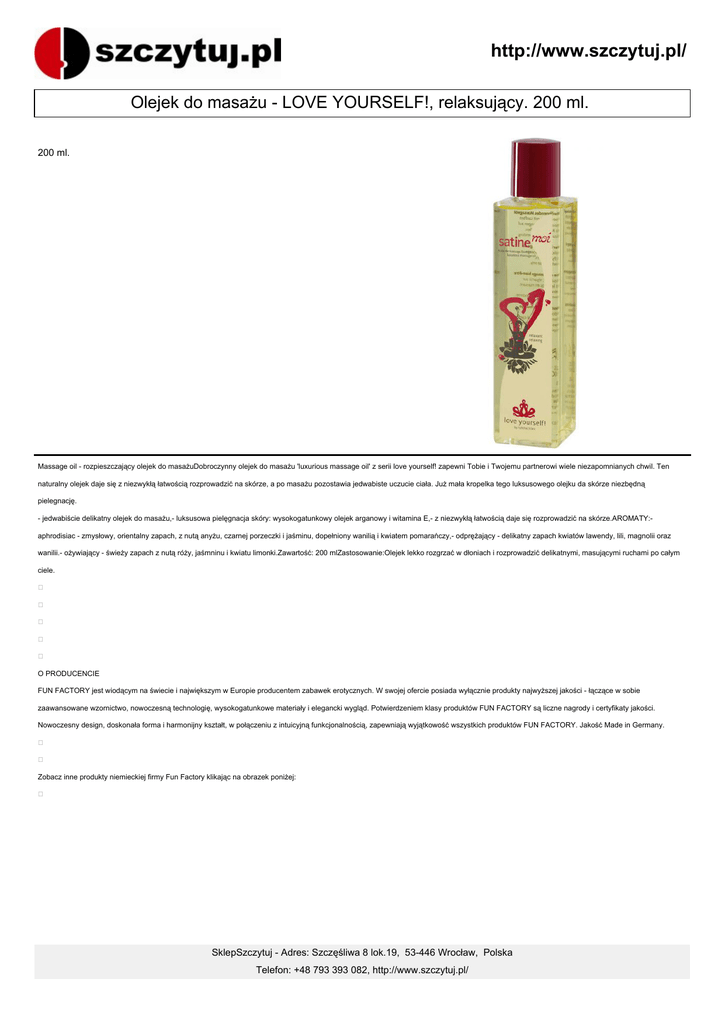 http://www.szczytuj.pl/ Olejek do masażu - LOVE YOURSELF!, relaksujący. 200 ml. 200 ml. Massage oil - rozpieszczający olejek do masażuDobroczynny olejek do masażu 'luxurious massage oil' z serii love yourself! zapewni Tobie i Twojemu partnerowi wiele niezapomnianych chwil. Ten naturalny olejek daje się z niezwykłą łatwością rozprowadzić na skórze, a po masażu pozostawia jedwabiste uczucie ciała. Już mała kropelka tego luksusowego olejku da skórze niezbędną pielegnację. - jedwabiście delikatny olejek do masażu,- luksusowa pielęgnacja skóry: wysokogatunkowy olejek arganowy i witamina E,- z niezwykłą łatwością daje się rozprowadzić na skórze.AROMATY:aphrodisiac - zmysłowy, orientalny zapach, z nutą anyżu, czarnej porzeczki i jaśminu, dopełniony wanilią i kwiatem pomarańczy,- odprężający - delikatny zapach kwiatów lawendy, lili, magnolii oraz wanilii.- ożywiający - świeży zapach z nutą róży, jaśmninu i kwiatu limonki.Zawartość: 200 mlZastosowanie:Olejek lekko rozgrzać w dłoniach i rozprowadzić delikatnymi, masującymi ruchami po całym ciele. O PRODUCENCIE FUN FACTORY jest wiodącym na świecie i największym w Europie producentem zabawek erotycznych. W swojej ofercie posiada wyłącznie produkty najwyższej jakości - łączące w sobie zaawansowane wzornictwo, nowoczesną technologię, wysokogatunkowe materiały i elegancki wygląd. Potwierdzeniem klasy produktów FUN FACTORY są liczne nagrody i certyfikaty jakości. Nowoczesny design, doskonała forma i harmonijny kształt, w połączeniu z intuicyjną funkcjonalnością, zapewniają wyjątkowość wszystkich produktów FUN FACTORY. Jakość Made in Germany. Zobacz inne produkty niemieckiej firmy Fun Factory klikając na obrazek poniżej: SklepSzczytuj - Adres: Szczęśliwa 8 lok.19, 53-446 Wrocław, Polska Telefon: +48 793 393 082, http://www.szczytuj.pl/ http://www.szczytuj.pl/ SklepSzczytuj - Adres: Szczęśliwa 8 lok.19, 53-446 Wrocław, Polska Telefon: +48 793 393 082, http://www.szczytuj.pl/