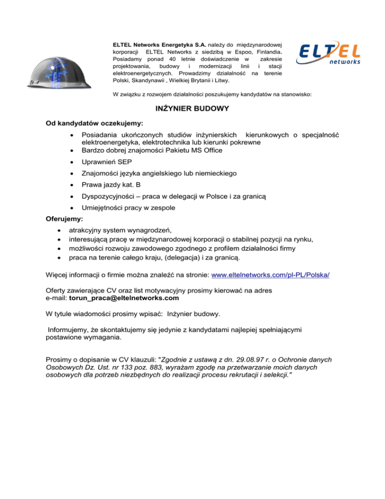 ELTEL Networks Energetyka S.A. należy do międzynarodowej korporacji ELTEL Networks z siedzibą w Espoo, Finlandia. Posiadamy ponad 40 letnie doświadczenie w zakresie projektowania, budowy i modernizacji linii i stacji elektroenergetycznych. Prowadzimy działalność na terenie Polski, Skandynawii , Wielkiej Brytanii i Litwy. W związku z rozwojem działalności poszukujemy kandydatów na stanowisko: INŻYNIER BUDOWY Od kandydatów oczekujemy: Posiadania ukończonych studiów inżynierskich kierunkowych o specjalność elektroenergetyka, elektrotechnika lub kierunki pokrewne Bardzo dobrej znajomości Pakietu MS Office Uprawnień SEP Znajomości języka angielskiego lub niemieckiego Prawa jazdy kat. B Dyspozycyjności – praca w delegacji w Polsce i za granicą Umiejętności pracy w zespole Oferujemy: atrakcyjny system wynagrodzeń, interesującą pracę w międzynarodowej korporacji o stabilnej pozycji na rynku, możliwości rozwoju zawodowego zgodnego z profilem działalności firmy praca na terenie całego kraju, (delegacja) i za granicą. Więcej informacji o firmie można znaleźć na stronie: www.eltelnetworks.com/pl-PL/Polska/ Oferty zawierające CV oraz list motywacyjny prosimy kierować na adres e-mail: [email protected] W tytule wiadomości prosimy wpisać: Inżynier budowy. Informujemy, że skontaktujemy się jedynie z kandydatami najlepiej spełniającymi postawione wymagania. Prosimy o dopisanie w CV klauzuli: "Zgodnie z ustawą z dn. 29.08.97 r. o Ochronie danych Osobowych Dz. Ust. nr 133 poz. 883, wyrażam zgodę na przetwarzanie moich danych osobowych dla potrzeb niezbędnych do realizacji procesu rekrutacji i selekcji."