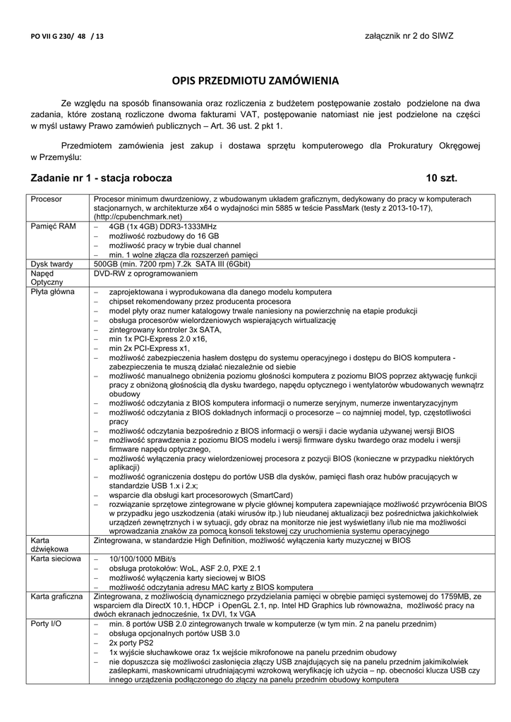 załącznik nr 2 do SIWZ PO VII G 230/ 48 / 13 OPIS PRZEDMIOTU ZAMÓWIENIA Ze względu na sposób finansowania oraz rozliczenia z budŜetem postępowanie zostało podzielone na dwa zadania, które zostaną rozliczone dwoma fakturami VAT, postępowanie natomiast nie jest podzielone na części w myśl ustawy Prawo zamówień publicznych – Art. 36 ust. 2 pkt 1. Przedmiotem zamówienia jest zakup i dostawa sprzętu komputerowego dla Prokuratury Okręgowej w Przemyślu: Zadanie nr 1 - stacja robocza Procesor Pamięć RAM Dysk twardy Napęd Optyczny Płyta główna Karta dźwiękowa Karta sieciowa Karta graficzna Porty I/O 10 szt. Procesor minimum dwurdzeniowy, z wbudowanym układem graficznym, dedykowany do pracy w komputerach stacjonarnych, w architekturze x64 o wydajności min 5885 w teście PassMark (testy z 2013-10-17), (http://cpubenchmark.net) − 4GB (1x 4GB) DDR3-1333MHz − moŜliwość rozbudowy do 16 GB − moŜliwość pracy w trybie dual channel − min. 1 wolne złącza dla rozszerzeń pamięci 500GB (min. 7200 rpm) 7.2k SATA III (6Gbit) DVD-RW z oprogramowaniem − − − − − − − − zaprojektowana i wyprodukowana dla danego modelu komputera chipset rekomendowany przez producenta procesora model płyty oraz numer katalogowy trwale naniesiony na powierzchnię na etapie produkcji obsługa procesorów wielordzeniowych wspierających wirtualizację zintegrowany kontroler 3x SATA, min 1x PCI-Express 2.0 x16, min 2x PCI-Express x1, moŜliwość zabezpieczenia hasłem dostępu do systemu operacyjnego i dostępu do BIOS komputera zabezpieczenia te muszą działać niezaleŜnie od siebie − moŜliwość manualnego obniŜenia poziomu głośności komputera z poziomu BIOS poprzez aktywację funkcji pracy z obniŜoną głośnością dla dysku twardego, napędu optycznego i wentylatorów wbudowanych wewnątrz obudowy − moŜliwość odczytania z BIOS komputera informacji o numerze seryjnym, numerze inwentaryzacyjnym − moŜliwość odczytania z BIOS dokładnych informacji o procesorze – co najmniej model, typ, częstotliwości pracy − moŜliwość odczytania bezpośrednio z BIOS informacji o wersji i dacie wydania uŜywanej wersji BIOS − moŜliwość sprawdzenia z poziomu BIOS modelu i wersji firmware dysku twardego oraz modelu i wersji firmware napędu optycznego, − moŜliwość wyłączenia pracy wielordzeniowej procesora z pozycji BIOS (konieczne w przypadku niektórych aplikacji) − moŜliwość ograniczenia dostępu do portów USB dla dysków, pamięci flash oraz hubów pracujących w standardzie USB 1.x i 2.x; − wsparcie dla obsługi kart procesorowych (SmartCard) − rozwiązanie sprzętowe zintegrowane w płycie głównej komputera zapewniające moŜliwość przywrócenia BIOS w przypadku jego uszkodzenia (ataki wirusów itp.) lub nieudanej aktualizacji bez pośrednictwa jakichkolwiek urządzeń zewnętrznych i w sytuacji, gdy obraz na monitorze nie jest wyświetlany i/lub nie ma moŜliwości wprowadzania znaków za pomocą konsoli tekstowej czy uruchomienia systemu operacyjnego Zintegrowana, w standardzie High Definition, moŜliwość wyłączenia karty muzycznej w BIOS − 10/100/1000 MBit/s − obsługa protokołów: WoL, ASF 2.0, PXE 2.1 − moŜliwość wyłączenia karty sieciowej w BIOS − moŜliwość odczytania adresu MAC karty z BIOS komputera Zintegrowana, z moŜliwością dynamicznego przydzielania pamięci w obrębie pamięci systemowej do 1759MB, ze wsparciem dla DirectX 10.1, HDCP i OpenGL 2.1, np. Intel HD Graphics lub równowaŜna, moŜliwość pracy na dwóch ekranach jednocześnie, 1x DVI, 1x VGA − min. 8 portów USB 2.0 zintegrowanych trwale w komputerze (w tym min. 2 na panelu przednim) − obsługa opcjonalnych portów USB 3.0 − 2x porty PS2 − 1x wyjście słuchawkowe oraz 1x wejście mikrofonowe na panelu przednim obudowy − nie dopuszcza się moŜliwości zasłonięcia złączy USB znajdujących się na panelu przednim jakimikolwiek zaślepkami, maskownicami utrudniającymi wzrokową weryfikację ich uŜycia – np. obecności klucza USB czy innego urządzenia podłączonego do złączy na panelu przednim obudowy komputera System operacyjny Pakiet biurowy − porty USB z zasilaniem prądowym umoŜliwiającym ładowanie urządzeń zewnętrznych Licencja dla Windows 8 Professional z prawami do instalacji Windows 7 Professional w polskiej wersji językowej. Preinstalowany fabrycznie na dysku twardym Windows 7 Professional w polskiej wersji językowej - Dostarczony nośnik Windows 7 Professional OEM w polskiej wersji językowej - płyta przygotowana przez producenta komputera do automatycznej instalacji na danej jednostce (system wraz ze sterownikami), pozwalający na ponowną instalację systemu 32bit i 64bit niewymagającą wpisywania klucza rejestracyjnego lub rejestracji poprzez Internet czy telefon. Kompleksowy pakiet oprogramowania biurowego: Microsoft Office 2013 PL dla UŜyt. Domowych i Małych Firm lub równowaŜny. Parametry równowaŜności: Pakiet biurowy musi spełniać następujące wymagania poprzez wbudowane mechanizmy, bez uŜycia dodatkowych aplikacji: wymagania odnośnie interfejsu uŜytkownika: • pełna polska wersja językowa interfejsu uŜytkownika, • prostota i intuicyjność obsługi, pozwalająca na pracę osobom nieposiadającym umiejętności technicznych, • moŜliwość zintegrowania uwierzytelniania uŜytkowników z usługą katalogową (Active Directory lub funkcjonalnie równowaŜną) - uŜytkownik raz zalogowany z poziomu systemu operacyjnego stacji roboczej ma być automatycznie rozpoznawany we wszystkich modułach oferowanego rozwiązania bez potrzeby oddzielnego monitowania go o ponowne uwierzytelnienie się. oprogramowanie musi umoŜliwiać tworzenie i edycję dokumentów elektronicznych w ustalonym formacie, który spełnia następujące warunki: • posiada kompletny i publicznie dostępny opis formatu, • ma zdefiniowany układ informacji w postaci XML (standard uniwersalnego • form
