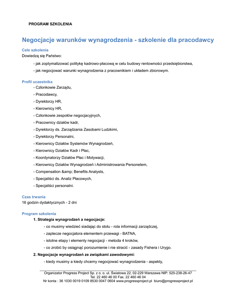 PROGRAM SZKOLENIA Negocjacje warunków wynagrodzenia - szkolenie dla pracodawcy Cele szkolenia Dowiedzą się Państwo: - jak zoptymalizować politykę kadrowo-płacową w celu budowy rentowności przedsiębiorstwa, - jak negocjować warunki wynagrodzenia z pracownikiem i układem zbiorowym. Profil uczestnika - Członkowie Zarządu, - Pracodawcy, - Dyrektorzy HR, - Kierownicy HR, - Członkowie zespołów negocjacyjnych, - Pracownicy działów kadr, - Dyrektorzy ds. Zarządzania Zasobami Ludzkimi, - Dyrektorzy Personalni, - Kierownicy Działów Systemów Wynagrodzeń, - Kierownicy Działów Kadr i Płac, - Koordynatorzy Działów Płac i Motywacji, - Kierownicy Działów Wynagrodzeń i Administrowania Personelem, - Compensation & Benefits Analysts, - Specjaliści ds. Analiz Płacowych, - Specjaliści personalni. Czas trwania 16 godzin dydaktycznych - 2 dni Program szkolenia 1. Strategia wynagrodzeń a negocjacje: - co musimy wiedzieć siadając do stołu - rola informacji zarządczej, - zaplecze negocjatora elementem przewagi - BATNA, - istotne etapy i elementy negocjacji - metoda 4 kroków, - co zrobić by osiągnąć porozumienie i nie stracić - zasady Fishera i Urygo. 2. Negocjacje wynagrodzeń ze związkami zawodowymi: - kiedy musimy a kiedy chcemy negocjować wynagrodzenia - aspekty, _________________________________________________________________________________ Organizator Progress Project Sp. z o. o. ul. Światowa 22, 02-229 Warszawa NIP: 525-238-26-47 Tel. 22 460 46 00 Fax. 22 460 46 04 Nr konta : 36 1030 0019 0109 8530 0047 0604 www.progressproject.pl [email protected] PROGRAM SZKOLENIA - negocjować ze związkami zawodowymi i nie zwariować, - spory zbiorowe zmorą pracodawców- jak sobie z nimi radzić, - jak negocjować, by nie doprowadzać do sporów - znacznie konsultacji. 3. Wpływ negocjacyjny wielokanałowy: - kanał merytoryczny (wpływ składni zdania i architektury treści), - kanał werbalny - tonalny (wpływ emisji głosu), - ekspresja ciała (negocjacyjny wpływ kodów mowy ciała), - "protezy" (wpływ zjawisk barwnych, dźwięków, oświetlenia i kształtów), - ćwiczenia symulacyjne. 4. Strategie negocjacyjne: - Low Boll (strategie w fazie przygotowawczej), - Wojna Pozorów (strategia otwarcia - wejścia w dialog), - strategie zespołowe w sekwencji 2:1, 3:1, - aktyka "Konia Trojańskiego" (sekwencja negocjacji zespołowych w dowolnym limicie uczestników np. negocjacje 5:5 lub 10:10), - ćwiczenia mentalne (przygotowanie taktyki, prezentacja planu negocjacyjnego i jego weryfikacja). Harmonogram Harmonogram Rejestracja uczestników Zajęcia Przerwa Zajęcia Obiad Zajęcia Przerwa Zajęcia Dzień 1 9:45 - 10:00 10:00 - 11:00 11:00 - 11:15 11:15 - 13:00 13:00 - 13:45 13:45 - 15:00 15:00 - 15:10 15:10 - 17:00 Dzień 2 9:00 - 11:00 11:00 - 11:15 11:15 - 13:00 13:00 - 13:45 13:45 - 15:00 15:00 - 15:10 15:10 - 16:00 Koszt inwestycji W celu poznania szczegółów, zapraszamy do kontaktu. Informacje dodatkowe W przypadku zainteresowania jednym szkoleniem większej liczby osób (powyżej 3-4) z jednej firmy jesteśmy w stanie zorganizować dodatkowe terminy w dogodnej lokalizacji przy założeniu, że szkolenie będzie zaplanowane z co najmniej półtora miesięcznym wyprzedzeniem. Każdy temat możemy również przygotować według Państwa wymagań oraz potrzeb firmy w formie szkolenia dedykowanego, wyjazdu integracyjnego lub doradztwa. Zapraszamy do kontaktu, _________________________________________________________________________________ Organizator Progress Project Sp. z o. o. ul. Światowa 22, 02-229 Warszawa NIP: 525-238-26-47 Tel. 22 460 46 00 Fax. 22 460 46 04 Nr konta : 36 1030 0019 0109 8530 0047 0604 www.progressproject.pl [email protected] PROGRAM SZKOLENIA Progress Project sp. z o.o. ul. Światowa 22 02-229 Warszawa Tel. 22 460 46 00 Fax. 22 460 46 04 e-mail: [email protected] www.progressproject.pl _________________________________________________________________________________ Organizator Progress Project Sp. z o. o. ul. Światowa 22, 02-229 Warszawa NIP: 525-238-26-47 Tel. 22 460 46 00 Fax. 22 460 46 04 Nr konta : 36 1030 0019 0109 8530 0047 0604 www.progressproject.pl [email protected]