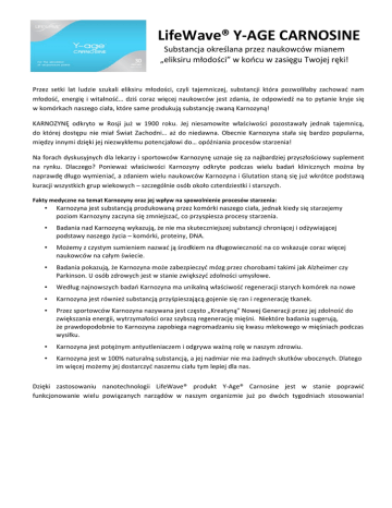 LifeWave® Y-‐AGE CARNOSINE Substancja określana przez naukowców mianem „eliksiru młodości” w końcu w zasięgu Twojej ręki! Przez setki lat ludzie szukali eliksiru młodości, czyli tajemniczej, substancji która pozwoliłaby zachować nam młodość, energię i witalność… dziś coraz więcej naukowców jest zdania, że odpowiedź na to pytanie kryje się w komórkach naszego ciała, które same produkują substancję zwaną Karnozyną! KARNOZYNĘ odkryto w Rosji już w 1900 roku. Jej niesamowite właściwości pozostawały jednak tajemnicą, do której dostępu nie miał Świat Zachodni… aż do niedawna. Obecnie Karnozyna stała się bardzo popularna, między innymi dzięki jej niezwykłemu potencjałowi do… opóźniania procesów starzenia! Na forach dyskusyjnych dla lekarzy i sportowców Karnozynę uznaje się za najbardziej przyszłościowy suplement na rynku. Dlaczego? Ponieważ właściwości Karnozyny odkryte podczas wielu badań klinicznych można by naprawdę długo wymieniać, a zdaniem wielu naukowców Karnozyna i Glutation staną się już wkrótce podstawą kuracji wszystkich grup wiekowych – szczególnie osób około czterdziestki i starszych. Fakty medyczne na temat Karnozyny oraz jej wpływ na spowolnienie procesów starzenia: • Karnozyna jest substancją produkowaną przez komórki naszego ciała, jednak kiedy się starzejemy poziom Karnozyny zaczyna się zmniejszać, co przyspiesza procesy starzenia. • Badania nad Karnozyną wykazują, że nie ma skuteczniejszej substancji chroniącej i odżywiającej podstawy naszego życia – komórki, proteiny, DNA. • Możemy z czystym sumieniem nazwać ją środkiem na długowieczność na co wskazuje coraz więcej naukowców na całym świecie. • Badania pokazują, że Karnozyna może zabezpieczyć mózg przez chorobami takimi jak Alzheimer czy Parkinson. U osób zdrowych jest w stanie zwiększyć zdolności umysłowe. • Według najnowszych badań Karnozyna ma unikalną właściwość regeneracji starych komórek na nowe • Karnozyna jest również substancją przyśpieszającą gojenie się ran i regenerację tkanek. • Przez sportowców Karnozyna nazywana jest często „Kreatyną” Nowej Generacji przez jej zdolność do zwiększania energii, wytrzymałości oraz szybszą regenerację mięśni. Niektóre badania sugerują, że prawdopodobnie to Karnozyna zapobiega nagromadzaniu się kwasu mlekowego w mięśniach podczas wysiłku. • Karnozyna jest potężnym antyutleniaczem i odgrywa ważną rolę w naszym zdrowiu. • Karnozyna jest w 100% naturalną substancją, a jej nadmiar nie ma żadnych skutków ubocznych. Dlatego im więcej możemy jej dostarczyć naszemu ciału tym lepiej dla nas. Dzięki zastosowaniu nanotechnologii LifeWave® produkt Y-‐Age® Carnosine jest w stanie poprawić funkcjonowanie wielu powiązanych narządów w naszym organizmie już po dwóch tygodniach stosowania! INSTRUKCJA OBSŁUGI Y-‐AGE® CARNOSINE Umieść jeden produkt Y-‐AGE® CARNOSINE na swoim ciele w miejscu wskazanym poniżej. Używaj go przez co najmniej trzy dni w tygodniu (np. poniedziałek, środa, piątek). Należy umieścić go na suchej i czystej skórze z samego rana. Może być noszony aż do 12 godzin. Ponieważ Karnozyna jest znana z silnych właściwości detoksykacyjnych pamiętaj aby pić minimum 2 litry wody podczas używania tego produktu! Zapytaj również Konsultanta LifeWave® o zaawansowane zastosowanie produktów LifeWave®. GŁÓWNY REGULATOR PRZEDNI 17 (GRP 17) punkt znajduje się na Ten mostku – dokładnie w centrum klatki piersiowej. GŁÓWNY REGULATOR TYLNI 2 (GRT 2) Ten punkt znajduje się u podstawy kręgosłupa, tuż powyżej kości ogonowej. GŁÓWNY REGULATOR TYLNI 1 4 ( GRT 14) Ten p unkt z najduje s ię u podstawy z tyłu szyi, gdzie wystaje 7 k rąg szyjny gdy przyciągniesz podbródek do klatki piersiowej. SERCE 7 (S 7) Ten punkt jest na zgięciu prawego nadgarstka, jedną szerokość palca od środka w kierunku małego palca. JELITO GRUBE 4 (JG 4) Ten punkt znajduje się na prawej dłoni na połączeniu kości kciuka z palcem wskazującym. GŁÓWNY REGULATOR PRZEDNI 6 (GRP 6) Ten punkt znajduje się 3 szerokości palców poniżej pępka. NAJCZĘŚCIEJ ZADAWANE PYTANIA 1) Jak działa produkt Y-‐Age® Carnosine, jeżeli nic nie wnika do ciała? Produkty LifeWave® są stworzone dzięki nowatorskiej nanotechnologii, która delikatnie stymuluje punkty akupunktury, aby poprawić przepływ energii w ciele. Jest to podobne do sposobu, w jaki światło słoneczne zwiększa poziom witaminy D produkowanej przez nasze ciało. Odbywa się to bez żadnych igieł czy suplementów. 2) Ile nanoplastrów mogę nałożyć w tym samym czasie? Jeden nanoplaster tego samego rodzaju na ogół wystarczy, aby osiągnąć efekt. Jeśli chcemy przyspieszyć efekty możemy połączyć różne rodzaje plastrów stosując je w tym samym czasie np. Glutathione (odtruwanie z toksyn), Ice Wave (redukcja bólu) czy Silent Nights (bardziej regeneracyjny sen). 3) Jak bezpieczny jest produkt Y-‐Age® Carnosine? Akupunktura jest używana od ponad pięciu tysięcy lat, jako sposób na poprawę jakości życia i uśmierzania bólu. Udowodniliśmy, że nasze produkty są bezpieczne. Jeżeli jednak kiedykolwiek poczujesz dyskomfort zdejmij nanoplaster i wypij więcej wody. 4) Czy jakiekolwiek lekarstwa, środki stymulujące znajdujące się w tych produktach mogą przeniknąć do ciała? Nie. Produkty LifeWave® NIE ZAWIERAJĄ żadnych szkodliwych leków ani stymulantów. Zostały stworzone dzięki nowatorskiej nano-‐ technologii, która delikatnie stymuluje punkty akupunktury, aby popawić przepływ energii w ciele. Bez użycia igieł czy magnesów. 5) Czy produkty LifeWave® Y-‐Age® Carnosine były niezależnie badane? Tak, badania kliniczne krwi i moczu udowadniają, że produkt Y-‐Age® Carnosine poprawia funkcjonowanie wielu narządów w organizmie. 6) Co poczuję podczas noszenia Y-‐Age
