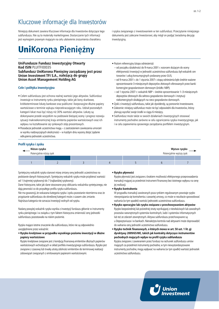 str. 1-2 Kluczowe informacje dla Inwestorów Niniejszy dokument zawiera Kluczowe informacje dla Inwestorów dotyczące tego subfunduszu. Nie są to materiały marketingowe. Dostarczanie tych informacji jest wymogiem prawnym mającym na celu ułatwienie zrozumienia charakteru i ryzyka związanego z inwestowaniem w ten subfundusz. Przeczytanie niniejszego dokumentu jest zalecane Inwestorowi, aby mógł on podjąć świadomą decyzję inwestycyjną. UniKorona Pieniężny UniFundusze Fundusz Inwestycyjny Otwarty Kod ISIN PLUITFI00035 Subfundusz UniKorona Pieniężny zarządzany jest przez Union Investment TFI S.A., należącą do grupy Union Asset Management Holding AG • Poziom referencyjny (stopa odniesienia): – o d początku działalności do 9 marca 2001 r. wzorcem służącym do oceny efektywności inwestycji w jednostki uczestnictwa subfunduszu był wskaźnik cen towarów i usług konsumpcyjnych podawany przez GUS; – o d 9 marca 2001 r. do 1 stycznia 2007 r. stopą odniesienia było średnie ważone oprocentowanie 3-miesięcznych depozytów złotowych oferowanych przez banki komercyjne gospodarstwom domowym (źródło: NBP); – o d 1 stycznia 2007 r.: wskaźnik NBP – średnie oprocentowanie 1–3-miesięcznych depozytów złotowych dla sektora gospodarstw domowych i instytucji niekomercyjnych działających na rzecz gospodarstw domowych. • Zyski z inwestycji subfunduszu, takie jak dywidendy, są ponownie inwestowane. • Zalecenie: niniejszy subfundusz może nie być odpowiedni dla Inwestorów, którzy planują wycofać swoje środki w ciągu 6 miesięcy. • Subfundusz może także w swoich działaniach inwestycyjnych stosować instrumenty pochodne zarówno w celu ograniczenia ryzyka inwestycyjnego, jak i w celu zapewnienia sprawnego zarządzania portfelem inwestycyjnym. Cele i polityka inwestycyjna • Celem subfunduszu jest ochrona realnej wartości jego aktywów. Subfundusz inwestuje w instrumenty rynku pieniężnego, takie jak bony skarbowe, krótkoterminowe lokaty bankowe oraz publiczne i korporacyjne dłużne papiery wartościowe o terminie wykupu nieprzekraczającym roku. Udział pozostałych kategorii lokat musi być niższy niż 30% wartości aktywów. Lokaty są dokonywane przede wszystkim na podstawie bieżącej oceny i prognoz rozwoju sytuacji makroekonomicznej kraju emitenta papierów wartościowych oraz ich wpływu na kształtowanie się rynkowych stóp procentowych. • Posiadacze jednostek uczestnictwa mogą – z zastrzeżeniem zawieszenia umorzeń w wyniku nadzwyczajnych okoliczności – w każdym dniu wyceny złożyć żądanie odkupienia jednostek uczestnictwa. Profil ryzyka i zysku Niższe ryzyko Wyższe ryzyko Potencjalnie niższy zysk Potencjalnie wyższy zysk 1 2 3 Syntetyczny wskaźnik ryzyka stanowi miarę zmiany ceny jednostki uczestnictwa na podstawie danych historycznych. Syntetyczny wskaźnik ryzyka może przybierać wartości od 1 (najmniej ryzykowny) do 7 (najbardziej ryzykowny). Dane historyczne, takie jak dane stosowane przy obliczaniu wskaźnika syntetycznego, nie dają pewności co do przyszłego profilu ryzyka subfunduszu. Nie ma gwarancji, że wskazana kategoria ryzyka i zysku pozostanie niezmienna oraz że przypisanie subfunduszu do określonej kategorii może z czasem ulec zmianie. Najniższa kategoria nie oznacza inwestycji wolnych od ryzyka. Nadany powyżej wskaźnik ryzyka wynika z inwestycji funduszu głównie w instrumenty rynku pieniężnego i w związku z tym faktem historyczna zmienność ceny jednostki subfunduszu pozostawała na niskim poziomie. Ryzyka mające istotne znaczenie dla subfunduszu, które nie są odpowiednio uwzględnione przez wskaźnik: • Ryzyko kredytowe w przypadku wysokiego poziomu inwestycji w dłużne papiery wartościowe Ryzyko kredytowe związane jest z kondycją finansową emitentów dłużnych papierów wartościowych wchodzących w skład portfela inwestycyjnego subfunduszu. Ryzyko jest związane z czasową lub trwałą utratą zdolności emitentów do terminowej realizacji zobowiązań związanych z emitowanymi papierami wartościowymi. 4 5 6 7 • Ryzyko płynności Ryzyko płynności jest związane z brakiem możliwości efektywnego przeprowadzenia transakcji mającej za przedmiot instrument finansowy bez istotnego wpływu na cenę jej realizacji. • Ryzyko kontrahenta W przypadku transakcji zawieranych poza rynkiem regulowanym powstaje ryzyko niewywiązania się kontrahenta z zawartej umowy, co może w rezultacie spowodować wahania (w tym spadek) wartości jednostek uczestnictwa subfunduszu. • Ryzyko operacyjne lub ryzyko związane z przechowywaniem aktywów Ryzyko bezpośredniej lub pośredniej straty wynikającej z niewłaściwych lub zawodnych procesów wewnętrznych systemów kontrolnych, ludzi i systemów informatycznych lub też ze zdarzeń zewnętrznych. Aktywa subfunduszu przechowywane są u Depozytariusza i w bankach. Nienależyta kontrola nad aktywami może doprowadzić do wahania ceny jednostki uczestnictwa subfunduszu. • Ryzyko technik finansowych, o których mowa w art. 50 ust. 1 lit. g) dyrektywy 2009/65/WE, takich jak kontrakty dotyczące instrumentów pochodnych mających wpływ na profil ryzyka subfunduszu Ryzyka związane z zawieraniem przez fundusz na rachunek subfunduszu umów mających za przedmiot instrumenty pochodne, w tym niewystandaryzowane instrumenty pochodne, mogą wpływać na wahania (w tym spadki) wartości jednostek uczestnictwa subfunduszu. str. 2-2 Kluczowe informacje dla Inwestorów UniKorona Pieniężny Opłaty • Opłaty ponoszone przez Inwestora służą pokryciu kosztów związanych z działalnością subfunduszu, w tym kosztów dystrybucji i kosztów wprowadzenia do obrotu. • Opłaty te zmniejszają potencjalny wzrost inwestycji. • Opłaty za nabycie i umorzenie jednostek uczestnictwa podawane są w wysokości maksymalnej. W niektórych przypadkach Inwestor może płacić niższą opłatę. Informacje dotyczące bieżącej wysokości opłat mo