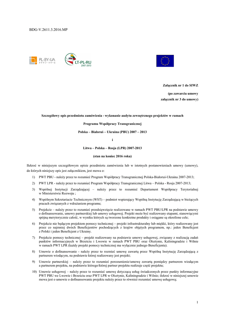 BDG-V.2611.3.2016.MP Załącznik nr 1 do SIWZ (po zawarciu umowy załącznik nr 3 do umowy) Szczegółowy opis przedmiotu zamówienia - wykonanie audytu zewnętrznego projektów w ramach Programu Współpracy Transgranicznej Polska – Białoruś – Ukraina (PBU) 2007 – 2013 i Litwa – Polska – Rosja (LPR) 2007-2013 (stan na koniec 2016 roku) Ilekroć w niniejszym szczegółowym opisie przedmiotu zamówienia lub w istotnych postanowieniach umowy (umowy), do których niniejszy opis jest załącznikiem, jest mowa o: 1) PWT PBU - należy przez to rozumieć Program Współpracy Transgranicznej Polska-Białoruś-Ukraina 2007-2013; 2) PWT LPR - należy przez to rozumieć Program Współpracy Transgranicznej Litwa – Polska - Rosja 2007-2013; 3) Wspólnej Instytucji Zarządzającej – należy przez to rozumieć Departament Współpracy Terytorialnej w Ministerstwie Rozwoju ; 4) Wspólnym Sekretariacie Technicznym (WST) – podmiot wspierający Wspólną Instytucję Zarządzającą w bieżących pracach związanych z wdrażaniem programu; 5) Projekcie – należy przez to rozumieć przedsięwzięcie realizowane w ramach PWT PBU/LPR na podstawie umowy o dofinansowanie, umowy partnerskiej lub umowy usługowej. Projekt może być realizowany etapami, stanowiącymi spójną merytorycznie całość, w wyniku których są tworzone konkretne produkty i osiągane są określone cele; 6) Projekcie nie będącym projektem pomocy technicznej – projekt infrastrukturalny lub miękki, który realizowany jest przez co najmniej dwóch Beneficjentów pochodzących z krajów objętych programem, np.: jeden Beneficjent z Polski i jeden Beneficjent z Ukrainy. 7) Projekcie pomocy technicznej – projekt realizowany na podstawie umowy usługowej, związany z realizacją zadań punktów informacyjnych w Brześciu i Lwowie w ramach PWT PBU oraz Olsztynie, Kaliningradzie i Wilnie w ramach PWT LPR (każdy projekt pomocy technicznej ma wyłącznie jednego Beneficjenta). 8) Umowie o dofinansowanie - należy przez to rozmieć umowę zawartą przez Wspólną Instytucję Zarządzającą z partnerem wiodącym, na podstawie której realizowany jest projekt; 9) Umowie partnerskiej – należy przez to rozumieć porozumienie/umowę zawartą pomiędzy partnerem wiodącym a partnerem projektu, na podstawie którego/której partner projektu realizuje część projektu; 10) Umowie usługowej – należy przez to rozumieć umowę dotyczącą usług świadczonych przez punkty informacyjne PWT PBU we Lwowie i Brześciu oraz PWT LPR w Olsztynie, Kaliningradzie i Wilnie; ilekroć w niniejszej umowie mowa jest o umowie o dofinansowanie projektu należy przez to również rozumieć umowę usługową; 1 11) Partnerze projektu – należy przez to rozumieć Beneficjenta uczestniczącego w realizacji projektu, z którym partner wiodący zawarł umowę partnerską; 12) Partnerze wiodącym – należy przez to rozumieć Beneficjenta, będącego sygnatariuszem umowy o dofinansowanie/umowy usługowej ze Wspólną Instytucją Zarządzającą, który ponosi całkowitą odpowiedzialność prawną i finansową za wdrożenie projektu przed tą instytucją; 13) Beneficjencie – należy przez to rozumieć partnera wiodącego lub partnera projektu realizującego projekt współfinansowany z PWT PBU/LPR; 14) Biegły rewident – należy przez to rozumieć podmiot, zatrudniony przez Beneficjenta, i potwierdzający kwalifikowalność wydatków Beneficjenta zgodnie z zasadami PWT PBU/LPR; weryfikujący 15) Wykonawcy – należy przez to rozumieć podmiot realizujący usługę będącą przedmiotem zamówienia publicznego (audyt), o której mowa w pkt II niniejszego szczegółowego opisu przedmiotu zamówienia (SOPZ); 16) Zakresie audytu – należy przez to rozumieć zakres audytu określony w SOPZ; 17) Audycie na miejscu – należy przez to rozumieć audyt prowadzony oddzielnie dla każdego Beneficjenta realizującego projekt (w siedzibie tego Beneficjenta oraz w miejscach realizacji projektu przez tego Beneficjenta). Audyt na miejscu obejmuje m.in. badanie faktyczności, prawidłowości i kwalifikowalności wydatków poniesionych i przedstawionych do refundacji przez danego Beneficjenta; 18) Zespole Kontrolującym – należy przez to rozumieć minimum dwu osobowy zespół przeprowadzający audyt na miejscu, składający się z Kierownika Zespołu Kontrolującego i członka Zespołu Kontrolującego; na czele Zespołu stoi Kierownik Zespołu Kontrolującego; 19) Kierowniku zespołu kontrolującego – należy przez to rozumieć osobę powołaną przez Wykonawcę w skład Zespołu Kontrolującego, odpowiedzialną przed Wykonawcą za przebieg audytu na miejscu, kontakty Zespołu Kontrolującego z Beneficjentem oraz przygotowanie Sprawozdania z audytu na miejscu; 20) Koordynatorze audytu - należy przez to rozumieć osobę odpowiedzialną za prawidłową i terminową realizację zamówienia, utrzymanie w trakcie wykonywania zamówienia międzynarodowych standardów audytu oraz przygotowanie i podpisanie Raportów końcowych. 21) Obserwatorze – należy przez to rozumieć osobę wskazaną przez Zamawiającego, obecną w trakcie audytu na miejscu, która ocenia realizację umowy w zakresie prowadzenia audytu na miejscu przez Zespół Kontrolujący, posiadająca bieżący dostęp do badanych dokumentów oraz dokumentów wytworzonych przez Zespół Kontrolujący w ramach przeprowadzanego audytu na miejscu; 22) Wydatku kwalifikowalnym – należy przez to rozumieć wydatek lub koszt kwalifikujący się do refundacji ze środków przeznaczonych na realizację PWT PBU/LPR na podstawie umowy o dofinansowanie, umowy partnerskiej, aktów prawa krajowego, wspólnotowego oraz dokumentów programowych; 23) Wydatku niekwalifikowalnym – należy przez to rozumieć wydatek lub koszt niekwalifikujący się do refundacji ze środków przeznaczonych na realizację PWT PBU/LPR na podstawie umowy o dofinansowanie, umowy partnerskiej, aktów prawa krajowego, wspólnoto