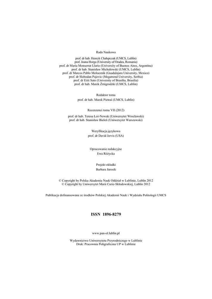 Rada Naukowa prof. dr hab. Henryk Chałupczak (UMCS, Lublin) prof. Joana Horga (University of Oradea, Romania) prof. dr Maria Monserrat Llario (University of Buenos Aires, Argentina) prof. dr hab. Stanisław Michałowski (UMCS, Lublin) prof. dr Marcos Pablo Moloeznik (Guadalajara University, Mexico) prof. dr Slobodan Pajovic (Megatrend University, Serbia) prof. dr Eiiti Sato (University of Brasilia, Brasilia) prof. dr hab. Marek Żmigrodzki (UMCS, Lublin) Redaktor tomu prof. dr hab. Marek Pietraś (UMCS, Lublin) Recenzenci tomu VII (2012) prof. dr hab. Teresa Łoś-Nowak (Uniwersytet Wrocławski) prof. dr hab. Stanisław Bieleń (Uniwersytet Warszawski) Weryfikacja językowa prof. dr David Jervis (USA) Opracowanie redakcyjne Ewa Różycka Projekt okładki Barbara Jarosik © Copyright by Polska Akademia Nauk Oddział w Lublinie, Lublin 2012 © Copyright by Uniwersytet Marii Curie-Skłodowskiej, Lublin 2012 Publikacja dofinansowana ze środków Polskiej Akademii Nauk i Wydziału Politologii UMCS ISSN 1896-8279 www.pan-ol.lublin.pl Wydawnictwo Uniwersytetu Przyrodniczego w Lublinie Druk: Pracownia Poligraficzna UP w Lublinie TEKA KOMISJI POLITOLOGII I STOSUNKÓW MIĘDZYNARODOWYCH COMMISSION OF POLITICAL SCIENCE AND INTERNATIONAL AFFAIRS POLSKA AKADEMIA NAUK ODDZIAŁ W LUBLINIE UNIWERSYTET MARII CURIE-SKŁODOWSKIEJ TEKA KOMISJI POLITOLOGII I STOSUNKÓW MIĘDZYNARODOWYCH Tom VII Lublin 2012 POLISH ACADEMY OF SCIENCES BRANCH IN LUBLIN MARIA CURIE-SKŁODOWSKA UNIVERSITY TEKA COMMISSION OF POLITICAL SCIENCE AND INTERNATIONAL AFFAIRS Volume VII Lublin 2012