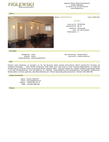 Agencja Obrotu Nieruchomościami Łukasz Figlewski ul. Rolna 7/7a, 61-533 Poznań www.figlewski.pl Oferta oferta: LW/002/05/2012 cena: 2500 PLN wynajem cena za m2 : 29.00 PLN powierzchnia : 85 m2 dzielnica : Winogrady ulica : Os. Na murawie liczba pokoi : 3 Szczegóły dostępność : zaraz budulec : beton rodzaj parkingu : parking podziemny stan techniczny : bardzo dobry typ kuchni : aneks kuchenny Opis Okazja! Lokal Użytkowy na wynajem na Os. Na Murawie blisko Urzędu Komunikacji! 85m2 powierzchni biurowej lub usługowo-handlowej. Cena bardzo atrakcyjna 2500 netto plus tylko prąd co dwa miesiące.Wyposażenie na zdjęciach również jest w cenie,ale można na życzenie klienta opróżnić lokal. Lokal ten składa się z dwóch osobnych gabinetów (jeden z nich jest klimatyzowany) oraz sali głównej, wc i łazienki. Rozprowadzona sieć komputerowa, internetowa, telefoniczna. Bardzo dobry na biura, gabinety, placówkę bankową itd. Oferta naprawdę godna polecenia! Kontakt: 600 388 558 Osoba kontaktowa Agent: Łukasz Figlewski Email: [email protected] Telefon: +48 61 831 31 71 GSM: +48 600 388 558 Zdjęcia