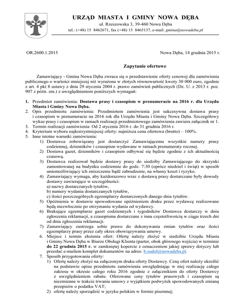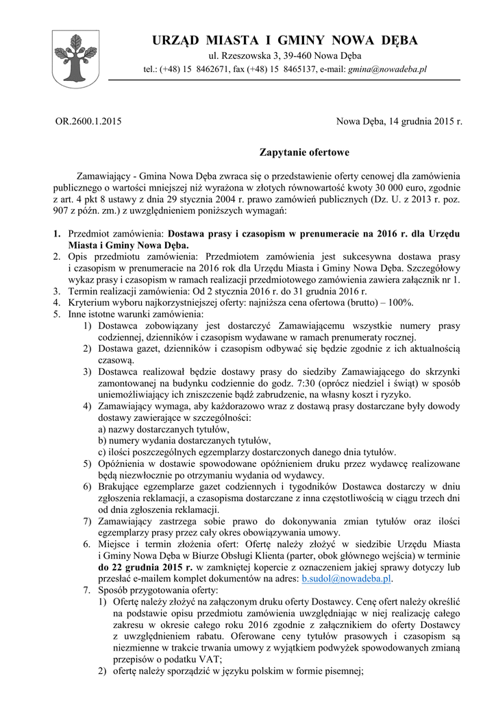URZĄD MIASTA I GMINY NOWA DĘBA ul. Rzeszowska 3, 39-460 Nowa Dęba tel.: (+48) 15 8462671, fax (+48) 15 8465137, e-mail: [email protected] OR.2600.1.2015 Nowa Dęba, 14 grudnia 2015 r. Zapytanie ofertowe Zamawiający - Gmina Nowa Dęba zwraca się o przedstawienie oferty cenowej dla zamówienia publicznego o wartości mniejszej niż wyrażona w złotych równowartość kwoty 30 000 euro, zgodnie z art. 4 pkt 8 ustawy z dnia 29 stycznia 2004 r. prawo zamówień publicznych (Dz. U. z 2013 r. poz. 907 z późn. zm.) z uwzględnieniem poniższych wymagań: 1. Przedmiot zamówienia: Dostawa prasy i czasopism w prenumeracie na 2016 r. dla Urzędu Miasta i Gminy Nowa Dęba. 2. Opis przedmiotu zamówienia: Przedmiotem zamówienia jest sukcesywna dostawa prasy i czasopism w prenumeracie na 2016 rok dla Urzędu Miasta i Gminy Nowa Dęba. Szczegółowy wykaz prasy i czasopism w ramach realizacji przedmiotowego zamówienia zawiera załącznik nr 1. 3. Termin realizacji zamówienia: Od 2 stycznia 2016 r. do 31 grudnia 2016 r. 4. Kryterium wyboru najkorzystniejszej oferty: najniższa cena ofertowa (brutto) – 100%. 5. Inne istotne warunki zamówienia: 1) Dostawca zobowiązany jest dostarczyć Zamawiającemu wszystkie numery prasy codziennej, dzienników i czasopism wydawane w ramach prenumeraty rocznej. 2) Dostawa gazet, dzienników i czasopism odbywać się będzie zgodnie z ich aktualnością czasową. 3) Dostawca realizował będzie dostawy prasy do siedziby Zamawiającego do skrzynki zamontowanej na budynku codziennie do godz. 7:30 (oprócz niedziel i świąt) w sposób uniemożliwiający ich zniszczenie bądź zabrudzenie, na własny koszt i ryzyko. 4) Zamawiający wymaga, aby każdorazowo wraz z dostawą prasy dostarczane były dowody dostawy zawierające w szczególności: a) nazwy dostarczanych tytułów, b) numery wydania dostarczanych tytułów, c) ilości poszczególnych egzemplarzy dostarczonych danego dnia tytułów. 5) Opóźnienia w dostawie spowodowane opóźnieniem druku przez wydawcę realizowane będą niezwłocznie po otrzymaniu wydania od wydawcy. 6) Brakujące egzemplarze gazet codziennych i tygodników Dostawca dostarczy w dniu zgłoszenia reklamacji, a czasopisma dostarczane z inna częstotliwością w ciągu trzech dni od dnia zgłoszenia reklamacji. 7) Zamawiający zastrzega sobie prawo do dokonywania zmian tytułów oraz ilości egzemplarzy prasy przez cały okres obowiązywania umowy. 6. Miejsce i termin złożenia ofert: Ofertę należy złożyć w siedzibie Urzędu Miasta i Gminy Nowa Dęba w Biurze Obsługi Klienta (parter, obok głównego wejścia) w terminie do 22 grudnia 2015 r. w zamkniętej kopercie z oznaczeniem jakiej sprawy dotyczy lub przesłać e-mailem komplet dokumentów na adres: [email protected]. 7. Sposób przygotowania oferty: 1) Ofertę należy złożyć na załączonym druku oferty Dostawcy. Cenę ofert należy określić na podstawie opisu przedmiotu zamówienia uwzględniając w niej realizację całego zakresu w okresie całego roku 2016 zgodnie z załącznikiem do oferty Dostawcy z uwzględnieniem rabatu. Oferowane ceny tytułów prasowych i czasopism są niezmienne w trakcie trwania umowy z wyjątkiem podwyżek spowodowanych zmianą przepisów o podatku VAT; 2) ofertę należy sporządzić w języku polskim w formie pisemnej; 3) oferta winna być podpisana przez osobę upoważnioną. 8. Osoba uprawniona do kontaktu: Barbara Sudoł, tel. 15 846 26 71 w. 214, adres e-mail: [email protected], fax: 15 846 51 37. 9. Załączniki: 1) Wykaz tytułów prasowych – zał. nr 1; 2) Formularz ofertowy – zał. nr 2; 3) Projekt umowy – zał. nr 3. Niniejsze zapytanie ofertowe nie stanowi zobowiązania Gminy Nowa Dęba do zawarcia umowy. Otrzymują: 1x adresat 1x a\a __________________________ Przygotowała: B. Sudoł, tel. w. 214