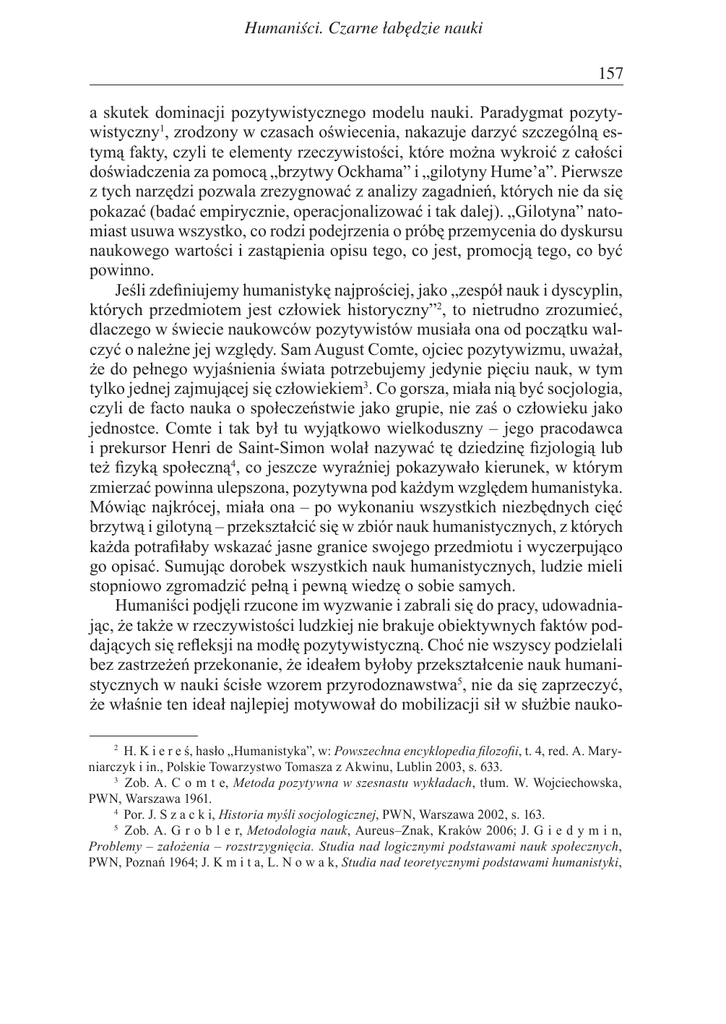 Humaniści. Czarne łabędzie nauki 157 a skutek dominacji pozytywistycznego modelu nauki. Paradygmat pozytywistyczny1, zrodzony w czasach oświecenia, nakazuje darzyć szczególną estymą fakty, czyli te elementy rzeczywistości, które można wykroić z całości doświadczenia za pomocą „brzytwy Ockhama” i „gilotyny Hume’a”. Pierwsze z tych narzędzi pozwala zrezygnować z analizy zagadnień, których nie da się pokazać (badać empirycznie, operacjonalizować i tak dalej). „Gilotyna” natomiast usuwa wszystko, co rodzi podejrzenia o próbę przemycenia do dyskursu naukowego wartości i zastąpienia opisu tego, co jest, promocją tego, co być powinno. Jeśli zdefiniujemy humanistykę najprościej, jako „zespół nauk i dyscyplin, których przedmiotem jest człowiek historyczny”2, to nietrudno zrozumieć, dlaczego w świecie naukowców pozytywistów musiała ona od początku walczyć o należne jej względy. Sam August Comte, ojciec pozytywizmu, uważał, że do pełnego wyjaśnienia świata potrzebujemy jedynie pięciu nauk, w tym tylko jednej zajmującej się człowiekiem3. Co gorsza, miała nią być socjologia, czyli de facto nauka o społeczeństwie jako grupie, nie zaś o człowieku jako jednostce. Comte i tak był tu wyjątkowo wielkoduszny – jego pracodawca i prekursor Henri de Saint-Simon wolał nazywać tę dziedzinę fizjologią lub też fizyką społeczną4, co jeszcze wyraźniej pokazywało kierunek, w którym zmierzać powinna ulepszona, pozytywna pod każdym względem humanistyka. Mówiąc najkrócej, miała ona – po wykonaniu wszystkich niezbędnych cięć brzytwą i gilotyną – przekształcić się w zbiór nauk humanistycznych, z których każda potrafiłaby wskazać jasne granice swojego przedmiotu i wyczerpująco go opisać. Sumując dorobek wszystkich nauk humanistycznych, ludzie mieli stopniowo zgromadzić pełną i pewną wiedzę o sobie samych. Humaniści podjęli rzucone im wyzwanie i zabrali się do pracy, udowadniając, że także w rzeczywistości ludzkiej nie brakuje obiektywnych faktów poddających się refleksji na modłę pozytywistyczną. Choć nie wszyscy podzielali bez zastrzeżeń przekonanie, że ideałem byłoby przekształcenie nauk humanistycznych w nauki ścisłe wzorem przyrodoznawstwa5, nie da się zaprzeczyć, że właśnie ten ideał najlepiej motywował do mobilizacji sił w służbie naukoH. K i e r e ś, hasło „Humanistyka”, w: Powszechna encyklopedia filozofii, t. 4, red. A. Maryniarczyk i in., Polskie Towarzystwo Tomasza z Akwinu, Lublin 2003, s. 633. 3 Zob. A. C o m t e, Metoda pozytywna w szesnastu wykładach, tłum. W. Wojciechowska, PWN, Warszawa 1961. 4 Por. J. S z a c k i, Historia myśli socjologicznej, PWN, Warszawa 2002, s. 163. 5 Zob. A. G r o b l e r, Metodologia nauk, Aureus–Znak, Kraków 2006; J. G i e d y m i n, Problemy – założenia – rozstrzygnięcia. Studia nad logicznymi podstawami nauk społecznych, PWN, Poznań 1964; J. K m i t a, L. N o w a k, Studia nad teoretycznymi podstawami humanistyki, 2 158 Iwona BARWICKA-TYLEK wego postępu. Niebywały rozrost dyscyplin poświęconych poszczególnym aspektom funkcjonowania człowieka dowodził zresztą słuszności tego stanowiska. Humanistyka wypracowała rzetelną metodologię badań, konstruując narzędzia umożliwiające doświadczalną weryfikację stawianych hipotez (jak wywiad standaryzowany, ankieta czy eksperyment naturalny, a nawet laboratoryjny), i zaczęła wykorzystywać język matematyczny do opracowywania wyników swoich dociekań, stosując metody statystyczne. Efekty okazały się imponujące. Nie sposób dziś wymienić wszystkich nauk szczegółowych, które ogrodziły własne poletko badawcze na gruncie humanistyki i podjęły się jego uprawy, by z czasem przedstawić owoce swej pracy – wiedzę o konkretnym fragmencie ludzkiego świata. Owoce te, dodane do innych podobnych dokonań, miały stać się wiedzą o człowieku i jego wytworach: obiektywną, prawdziwą, pewną i użyteczną, czyli wiedzą zasługującą na miano Nauki przez duże, pozytywne i pozytywistyczne N. I właśnie teraz, kiedy nauki humanistyczne mogą wreszcie całkiem zasadnie ogłosić swój sukces, polegający na spełnieniu wyznaczonych przez pozytywizm standardów, okazuje się, że nikt się nie kwapi, by sukces ten oklaskiwać. Jakbyśmy uczestniczyli w zawodach, które nie budzą już większego zainteresowania, bo tak kibice, jak sędziowie i pozostali uczestnicy, stracili zainteresowanie rozgrywką. W czasie gdy humaniści pracowali ciężko, nadrabiając brak naukowego obiektywizmu w refleksji humanistycznej, same nauki przyrodnicze zaczęły porzucać otwarcie pozytywistyczne założenia. Przodowała w tej reorientacji fizyka, wcześniej stawiana za godny naśladowania wzór nauki ścisłej. Jej odkrycia, takie jak teoria względności Einsteina, zasady termodynamiki i zjawisko entropii, zasada nieoznaczoności Heisenberga, mechanika kwantowa i wiele, wiele innych sprawiły, że zamiast poszukujących pewności naśladowców Isaaca Newtona fizycy zaczęli przypominać raczej grupę „tańczących mistrzów Wu-Li”7. „Jeśli ktoś nie jest w pierwszej chwili przerażony teorią kwantów, to przecież niemożliwe, żeby ją zrozumiał”8, twierdził Niels Bohr, trafnie przeczuwając możliwe konsekwencje nowych odkryć dla drogiego nam Uniwersytet im. Adama Mickiewicza, Poznań 1968; R. R o r t y, Filozofia a zwierciadło natury, tłum. M. Szczubiałka, Fundacja Aletheia–Wydawnictwo Spacja, Warszawa 1994. 6 Przed negatywnymi konsekwencjami bezrefleksyjnego „unaukowiania” całej humanistyki ostrzegali nawet zwolennicy poglądu o jedności metodologii naukowej, na przykład Thomas Nagel. Zob. T. N a g e l, Jak to jest być nietoperzem?, w: tenże, Pytania ostateczne, Fundacja Aletheia, Warszawa1997, s. 203-219. 7 Zob. G. Z u k a v, Tańczący Mistrzowie Wu-Li. Spojrzenie na nową fizykę, tłum. T. Hornowski Rebis, Poznań 