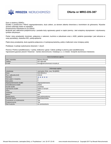 Oferta nr MRO-DS-387 Dom w dzielnicy ZDRÓJ. Działka o powierzchni 700m2 zagospodarowana, dużo zieleni, za domem altanka drewniana z kominkiem do grilowania. Wysokie drzewa osłaniają widok na sąsiadów. Powierzchnia mieszkalna to ok.230m2. Budynek jest całkowicie podpiwniczony i posiada duży ogrzewany garaż w części piwnicy. Jest ocieplony styropianem i otynkowany tynkiem akrylowym. Parter: duży przedpokój +kominek, połączony z salonem, kuchnia w zabudowie wraz z AGD, jadalnia (pozostaje i jest wliczona w cenę sprzedaży), łazienka+WC, pokój-spiżarnia Piętro:duży przedpokój, duża sypialnia połączona z 2-pokojową łazienką, pokój z balkonem oraz mniejszy pokój Poddasze: 2 pokoje wykończone drewnem + strych Piwnica: Pralnia wykafelkowana, 1-pokój, kotłownia i garaż. Całośc podłogi w piwnicy jest wykafelkowana. Ogrzewanie gazowe piecem Viessman - bardzo ekonomiczne. Instalacja c.o. w miedzi. Grzejniki aluminiowo-miedziane. Dane kontaktowe agenta Imię i nazwisko Telefon E-mail Bożena Mrozek 501-494-409 [email protected] Informacje ogólne Lokalizacja Cena Pow. całkowita [m2] Standard Ilość pięter w budynku Ilość pokoi Zagospodarowanie działki Ukształtowanie działki Kształt działki Ogrodzenie działki Okna Instalacje Balkon Rodzaj domu Pokrycie dachu Pozwolenie na użytkowanie Podpiwniczenie Stan budynku Jastrzębie-Zdrój, (woj. ŚLĄSKIE) 530 000,00 zł 230,00 2 7 Zagospodarowana płaska prostokąt siatka w ramach PCV nowe jest dom jednorodzinny blachodachówka Tak Tak do zamieszkania Mrozek Nieruchomości, Jastrzębie-Zdrój, ul. Przykładowa 1, tel. 32 471 23 45 www.mrozek-nieruchomosci.pl Copyright 2017 by Mrozek Nieruchomości