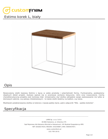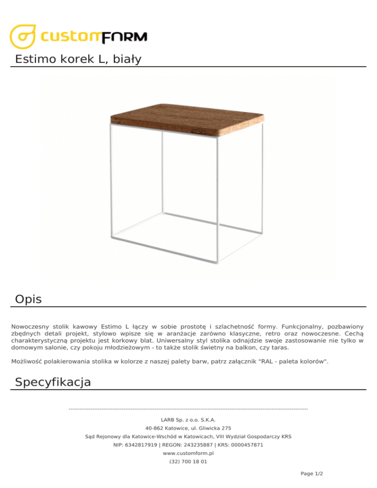Estimo korek L, biały Opis Nowoczesny stolik kawowy Estimo L łączy w sobie prostotę i szlachetność formy. Funkcjonalny, pozbawiony zbędnych detali projekt, stylowo wpisze się w aranżacje zarówno klasyczne, retro oraz nowoczesne. Cechą charakterystyczną projektu jest korkowy blat. Uniwersalny styl stolika odnajdzie swoje zastosowanie nie tylko w domowym salonie, czy pokoju młodzieżowym - to także stolik świetny na balkon, czy taras. Możliwość polakierowania stolika w kolorze z naszej palety barw, patrz załącznik "RAL - paleta kolorów". Specyfikacja ----------------------------------------------------------------------------------------------------------------------------------LARB Sp. z o.o. S.K.A. 40-862 Katowice, ul. Gliwicka 275 Sąd Rejonowy dla Katowice-Wschód w Katowicach, VIII Wydział Gospodarczy KRS NIP: 6342817919 | REGON: 243235887 | KRS: 0000457871 www.customform.pl (32) 700 18 01 Page 1/2 Wysokość 58 cm Szerokość 37 cm Długość 53 cm Podstawa metal malowany proszkowo Blat korek Dodatkowe zdjęcia ----------------------------------------------------------------------------------------------------------------------------------LARB Sp. z o.o. S.K.A. 40-862 Katowice, ul. Gliwicka 275 Sąd Rejonowy dla Katowice-Wschód w Katowicach, VIII Wydział Gospodarczy KRS NIP: 6342817919 | REGON: 243235887 | KRS: 0000457871 www.customform.pl (32) 700 18 01 Page 2/2 Powered by TCPDF (www.tcpdf.org)