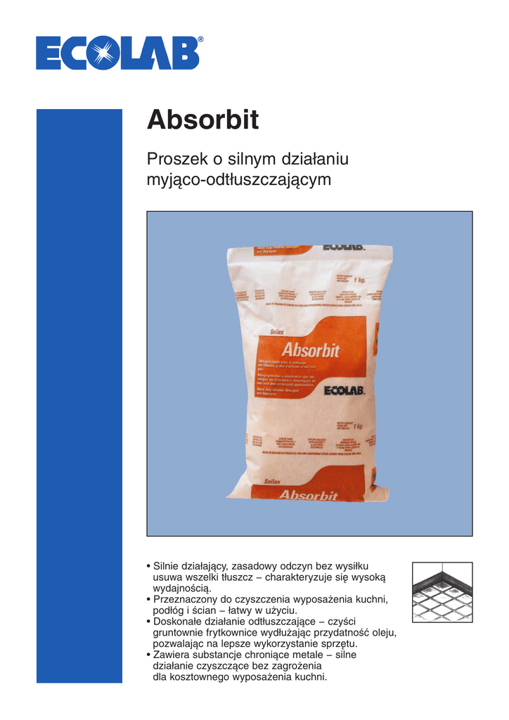 Absorbit Proszek o silnym działaniu myjąco-odtłuszczającym • Silnie działający, zasadowy odczyn bez wysiłku usuwa wszelki tłuszcz − charakteryzuje się wysoką wydajnością. • Przeznaczony do czyszczenia wyposażenia kuchni, podłóg i ścian − łatwy w użyciu. • Doskonałe działanie odtłuszczające − czyści gruntownie frytkownice wydłużając przydatność oleju, pozwalając na lepsze wykorzystanie sprzętu. • Zawiera substancje chroniące metale − silne działanie czyszczące bez zagrożenia dla kosztownego wyposażenia kuchni. Absorbit Proszek o silnym działaniu myjąco-odtłuszczającym Działanie produktu: Myjąco − odtłuszczające, posiada działanie ochronne dla metali kolorowych i lekkich. Stosowanie: Sposób użycia: Czyszczenie frytkownic: 1. Wylać zużyty olej. 2. Przygotować w wiadrze roztwór Absorbitu w proporcji od 15 g/l ciepłej wody (przy normalnym zabrudzeniu) do 50 g/l (przy szczególnie silnym zabrudzeniu). 3. Wlać roztwór do frytkownicy i podgrzać do 90oC na 20 min. 4. Wylać roztwór czyszczący do kubła, a po ostudzeniu do ścieku. 5. Spłukać czyszczoną powierzchnię ciepłą wodą. Czyszczenie filtrów wyciągów nadkuchennych / blach piekarniczych: 1. Przygotować w wiadrze roztwór Absorbitu w proporcji od 15 g/l ciepłej wody (przy normalnym zabrudzeniu) do 50 g/l (przy szczególnie silnym zabrudzeniu). 2. Umieścić filtry w zlewie lub innym naczyniu, zalać roztworem i uzupełnić gorącą wodą. 3. Pozostawić do namoczenia na 30 min. 4. Wylać roztwór czyszczący i spłukać mytą powierzchnię ciepłą wodą. Dozowanie: 15 ÷ 50 g/l. Temperatura: 55 ÷ 90oC. Czas działania: 20 ÷ 30 min. Zalecane środki ochronne: CSABSORBIT/P/021202/PL Rękawice ochronne. Dane ekologiczne: Opakowanie: Stan skupienia: bezpyłowy proszek. Kolor: biały. Skład: wodorotlenek sodu, krzemiany, tenzydy. Zdolność do biolog. neutralizacji: ponad 90 % według WRMG. Wartość pH: 12,0 (1% roztwór). Ciężar właściwy: 1,15. Karton: 20 × 1 kg torebka. Ecolab Sp. z o.o. 30-504 Kraków; ul. Kalwaryjska 69 tel.: 012/26 16 100; fax: 012/26 16 101 www.ecolab.com