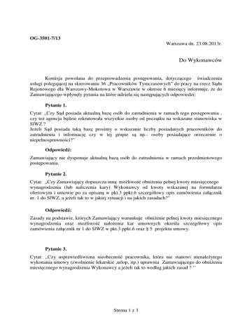 OG-3501-7/13 Warszawa dn. 23.08.2013r. Do Wykonawców Komisja powołana do przeprowadzenia postępowania, dotyczącego świadczenia usługi polegającej na skierowaniu 36 „Pracowników Tymczasowych” do pracy na rzecz Sądu Rejonowego dla Warszawy-Mokotowa w Warszawie w okresie 6 miesięcy informuje, że do Zamawiającego wpłynęły pytania na które udziela się następujących odpowiedzi: Pytanie 1. Cytat: „Czy Sąd posiada aktualną bazę osób do zatrudnienia w ramach tego postępowania , czy też agencja będzie rekrutowała wszystkie osoby od początku na wskazane stanowiska w SlWZ ? Jeżeli Sąd posiada taką bazę prosimy o wskazanie liczby posiadanych pracowników do zatrudnienia i informację czy w tej grupie są np.- osoby posiadające orzeczenie o niepełnosprawności?” Odpowiedź: Zamawiający nie dysponuje aktualną bazą osób do zatrudnienia w ramach przedmiotowego postępowania. Pytanie 2. Cytat: „Czy Zamawiający dopuszcza inną możliwość obniżenia pełnej kwoty miesięcznego wynagrodzenia (lub naliczenia kary) Wykonawcy od kwoty wskazanej na formularzu ofertowym i umowie po za opisaną w pkt.3 ppkt.6 szczegółowy opis zamówienia załącznik nr. 1 do SlWZ, a jeżeli tak to w jakiej sytuacji i na jakich zasadach?” Odpowiedź: Zasady na podstawie, których Zamawiający warunkuje obniżenie pełnej kwoty miesięcznego wynagrodzenia oraz możliwość nałożenia kar umownych określa szczegółowy opis zamówienia załącznik nr 1 do SlWZ w pkt.3 ppkt.6 oraz § 5 projektu umowy. Pytanie 3. Cytat: ,,Czy usprawiedliwiona nieobecność pracownika, która nie stanowi nienależytego wykonania umowy (zwolnienie lekarskie ,urlop, itp.) uprawnia Zamawiającego do obniżenia miesięcznego wynagrodzenia Wykonawcy a jeżeli tak to według jakich zasad ? ’’ Strona 1 z 3 Odpowiedź: Usprawiedliwiona nieobecność pracownika, która nie stanowi nienależytego wykonania umowy uprawnia Wykonawcę do obniżenia miesięcznego wynagrodzenia zgodnie z obowiązującymi przepisami prawa dotyczącymi rozliczenia przedmiotowych świadczeń. Pytanie 4. Cytat: „Po czyjej stronie leżą koszty urlopów wypoczynkowych, zwolnień lekarskich, urlopów okolicznościowych oraz innych usprawiedliwionych płatnych nieobecności w pracy?” Odpowiedź: Wykonawca pokrywa koszty urlopów wypoczynkowych, zwolnień lekarskich, urlopów okolicznościowych oraz innych usprawiedliwionych płatnych nieobecności w pracy. Pytanie 5. Cytat: „Czy Sąd udziela w naturze należnych urlopów Pracownikowi Tymczasowemu w wymiarze 2 dni za każdy miesiąc pozostawania w dyspozycji pracodawcy użytkownika?” Odpowiedź: Sąd udziela w naturze należnych urlopów Pracownikom Tymczasowym. Pytanie 6. Cytat: „Czy w przypadku nieobecności spowodowanej chorobą powyżej dni 7 agencja kierując kolejnego pracownika w zastępstwie osoby chorej otrzyma wynagrodzenie z tytułu realizacji umowy za dwie osoby czy za jedną , oraz czy w opisanej sytuacji Zamawiający będzie naliczał kary opisane w pkt.3 ppkt.6 szczegółowy opis zamówienia jeżeli okres zatrudnienia osoby chorej nie osiąga pełnego miesiąca ?” Odpowiedź: W przypadku nieobecności spowodowanej chorobą powyżej 7 dni agencja kierując kolejnego pracownika w zastępstwie osoby chorej otrzyma wynagrodzenie z tytułu realizacji umowy za jedną osobę, tego rodzaju okoliczność nie spowoduje naliczenia kary umownej wynikającej z zapisu pkt.3 ppkt.6 szczegółowego opisu zamówienia jeżeli Wykonawca zapewni zastępstwo w terminie określonym w projekcie umowy § 1 pkt.6 załącznik nr. 6 do SlWZ. Pytanie 7. Cytat: „Czy Zamawiający ma zamiar przenieść zapisy SIWZ dotyczące kar i sposobu ich naliczania do treści umowy, ze względu na istotną i kluczową w rozliczeniu zamówienia treść tych zapisów ?” Odpowiedź: Szczegółowy opis zamówienia określa między innymi sposób naliczania kar umownych i jest integralną częścią umowy. Strona 2 z 3 Komisja postanowiła: 1. Nie zmieniać terminu składania ofert. 2. Zmienić treść w załączniku numer 6 do SIWZ dopisując w § 1 pkt.7 : „Pracownik Tymczasowy” powinien przepracować na rzecz Zamawiającego okres minimum 1 miesiąca.” 3. Zmienić treść w załączniku numer 6 do SIWZ dopisując w § 5 pkt.3 : „W przypadku nieprzepracowania przez „Pracownika Tymczasowego, minimum 1 miesiąca, Wykonawca zapłaci Zamawiającemu karę w wysokości 2% miesięcznego wynagrodzenia brutto „Pracownika Tymczasowego”, o którym mowa odpowiednio w § 3 ust. 2, 3 lub 4, za każdy dzień nieobecności poniżej tego okresu.” Powyższa informacja jest wiążąca dla wszystkich wykonawców. Z poważaniem Sekretarz Komisji Tomasz Bujalski Strona 3 z 3