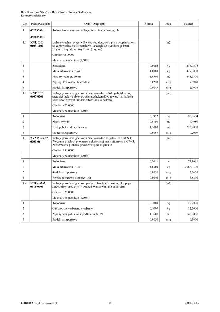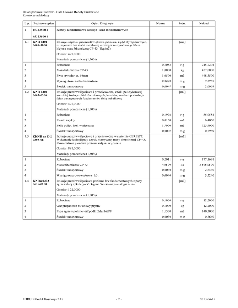 Hala Sportowa Pińczów - Hala Główna Roboty Budowlane Kosztorys nakładczy L.p. Podstawa opisu 1 45223500-1 Opis / Długi opis Norma Jedn. Nakład Roboty fundamentowe-izolacje ścian fundamentowych 45223500-1 1.1 KNR 0202 0609-1000 Izolacje cieplne i przeciwdźwiękowe, pionowe, z płyt styropianowych, na zaprawie bez siatki metalowej.-analogia ze styroduru gr 10cm klejone masą bitumiczną CP-43 (1kg/m2) [m2] Obmiar: 427,0000 Materiały pomocnicze (1,50%) 1 Robocizna 0,5052 r-g 215,7204 2 Masa bitumiczna CP-43 1,0000 kg 427,0000 3 Płyta styrodur gr. 60mm 1,0500 m2 448,3500 4 Wyciągi tow.-osob.i budowlane 0,0220 m-g 9,3940 5 Środek transportowy 0,0047 m-g 2,0069 1.2 KNR 0202 0607-0300 Izolacje przeciwwilgociowe i przeciwwodne, z folii polietylenowej szerokiej izolacje obiektów ziemnych, kanałów, rowów itp.-izolacja ścian zewnętrznych fundamentów folią kubełkową [m2] Obmiar: 427,0000 Materiały pomocnicze (1,50%) 1 Robocizna 0,1992 r-g 85,0584 2 Piasek zwykły 0,0150 m3 6,4050 3 Folia poliet. izol. wytłaczana 1,7000 m2 725,9000 Środek transportowy 0,0007 m-g 0,2989 4 1.3 ZKNR nr C-2 0303-06 Izolacje przeciwwilgociowe i przeciwwodne w systemie CERESIT. Wykonanie izolacji przy użyciu elastycznej masy bitumicznej CP-43. Powierzchnie pionowe-przeciw wilgoci w gruncie [m2] Obmiar: 881,0000 Materiały pomocnicze (1,50%) 1 Robocizna 0,2011 2 Masa bitumiczna CP-43 3 Środek transportowy 4 Wyciąg towarowo-osobowy 1.0t 1.4 KNRu 0202 0618-0100 r-g 177,1691 4,0500 kg 3 568,0500 0,0030 m-g 2,6430 0,0040 m-g 3,5240 Izolacje przeciwwilgociowe poziome ław fundamentowych z papy zgrzewalnej. (Biuletyn V Orgbud Warszawa).-analogia ścian [m2] Obmiar: 122,0000 Materiały pomocnicze (1,50%) 1 Robocizna 0,1000 r-g 12,2000 2 Gaz propanowo-butanowy płynny 0,1000 kg 12,2000 3 Papa zgrzew.polimer-asf.podkł.Zdunbit PF 1,1500 m2 140,3000 4 Środek transportowy 0,0030 m-g 0,3660 EDBUD Moduł Kosztorys 3.18 -2- 2010-04-15 Hala Sportowa Pińczów - Hala Główna Roboty Budowlane Kosztorys nakładczy L.p. Podstawa opisu 2 45223500-1 Opis / Długi opis Norma Jedn. Nakład Elementy żelbetowe-słupy, wieńce, belki, stropy, ściany, schody wewnętrzne, trybuny. 45223500-1 2.1 KNR 0202 0302-0100 Budynki z elementów typu "bloki żerańskie", stropy, schody, dachy, wieńce monolit. i ociepl. wieńców płytami styropianowymi płyty stropowe o powierzchni 2,5 do 6,0 m2.-płyty kanałowa np Consolis HC-320 zg.z dok.techn. [elem.] Obmiar: 4,0000 Materiały pomocnicze (1,50%) 1 Robotnicy budowlani I 0,3900 r-g 1,5600 2 Monter konstrukcji żelbetowych II 0,3800 r-g 1,5200 3 Monter konstrukcji żelbetowych III 0,1900 r-g 0,7600 4 Zaprawa cementowa M-4 0,0340 m3 0,1360 5 Beton zwykły B-20 (C16/20) 0,0340 m3 0,1360 6 Prefabrykaty zbrojarskie 7,3000 kg 29,2000 7 Płyta stropowa prefabrykowana kanałowa CONSOLIS HC-320 5x12,5 o wym.120*459cm 0,2500 szt. 1,0000 8 Płyta stropowa prefabrykowana kanałowa CONSOLIS HC-320 5x12,5 o wym.120*396cm 0,2500 szt. 1,0000 9 Płyta stropowa prefabrykowana kanałowa CONSOLIS HC-320 5x12,5 o wym.120*377cm 0,2500 szt. 1,0000 10 Płyta stropowa prefabrykowana kanałowa CONSOLIS HC-320 5x12,5 o wym.120*417cm 0,2500 szt. 1,0000 11 Środek transportowy 0,0100 m-g 0,0400 Żuraw wieżowy torowy 0,3400 m-g 1,3600 12 2.2 KNR 0202 0302-0200 Budynki z elem. typu "bloki żerańskie", stropy, schody, dachy, wieńce monolityczne, ocieplanie wieńców płytami styropianowymi płyty stropowe o powierzch. ponad 6,0 m.płyty kanałowa np Consolis HC-320 zg.z dok.techn. [elem.] Obmiar: 26,0000 Materiały pomocnicze (1,50%) 1 Robotnicy budowlani I 0,5500 r-g 14,3000 2 Monter konstrukcji żelbetowych II 0,3800 r-g 9,8800 3 Monter konstrukcji żelbetowych III 0,1900 r-g 4,9400 4 Beton zwykły B-20 0,0700 m3 1,8200 5 Zaprawa cementowa M-4 0,0480 m3 1,2480 6 Prefabrykaty zbrojarskie 12,5100 kg 325,2600 7 Płyta stropowa prefabrykowana kanałowa CONSOLIS HC-320 9x12,5 o wym.120*827cm 0,0385 szt. 1,0000 8 Płyta stropowa prefabrykowana kanałowa CONSOLIS HC-320 5x12,5 o wym.120*535cm 0,0385 szt. 1,0000 9 Płyta stropowa prefabrykowana kanałowa CONSOLIS HC-320 8x12,5 o wym.120*827cm 0,0769 szt. 2,0000 10 Płyta stropowa prefabrykowana kanałowa CONSOLIS HC-320 5x12,5 o wym.120*827cm 0,7308 szt. 19,0000 11 Płyta stropowa prefabrykowana kanałowa CONSOLIS HC-320 5x12,5 o wym.120*590cm 0,0385 szt. 1,0000 12 Płyta stropowa prefabrykowana kanałowa CONSOLIS HC-320 5x12,5 o wym.120*503cm 0,0385 szt. 1,0000 13 Płyta stropowa prefabrykowana kanałowa CONSOLIS HC-320 5x12,5 o wym.120*709cm 0,0385 szt. 1,0000 14 Środek transportowy 0,0200 m-g 0,5200 15 Żuraw wieżowy torowy 0,3400 m-g 8,8400 EDBUD Moduł Kosztorys 3.18 -3- 2010-04-15 Hala Sportowa Pińczów - Hala Główna Roboty Budowlane Kosztorys nakładczy L.p. Podstawa opisu 2.3 KNR 0202 0302-0100 Opis / Długi opis Norma Budynki z elementów typu "bloki żerańskie", stropy, schody, dachy, wieńce monolit. i ociepl. wieńców płytami styropianowymi płyty stropowe o powierzchni 2,5 do 6,0 m2.-płyty kanałowa np Consolis HC-265 zg.z dok.techn. Jedn. Nakład [elem.] Obmiar: 9,0000 Materiały pomocnicze (1,50%) 1 Robotnicy budowlani I 0,3900 r-g 3,5100 2 Monter konstrukcji żelbetowych II 0,3800 r-g 3,4200 3 Monter konstrukcji żelbetowych III 0,1900 r-g 1,7100 4 Zaprawa cementowa M-4 0,0340 m3 0,3060 5 Beton zwykły B-20 (C16/20) 0,0340 m3 0,3060 6 Prefabrykaty zbrojarskie 7,3000 kg 65,7000 7 Płyta stropowa prefabrykowana kanałowa CONSOLIS HC-265 4x12,5 o wym.120*401cm 0,1111 szt. 1,0000 8 Płyta stropowa prefabrykowana kanałowa CONSOLIS HC-265 4x12,5 o wym.120*358cm 0,2222 szt. 2,0000 9 Płyta stropowa prefabrykowana kanałowa CONSOLIS HC-265 4x12,5 o wym.120*393cm 0,1111 szt. 1,0000 10 Płyta stropowa prefabrykowana kanałowa CONSOLIS HC-265 4x12,5 o wym.120*480cm 0,1111 szt. 1,0000 11 Płyta stropowa prefabrykowana kanałowa CONSOLIS HC-265 4x12,5 o wym.120*323cm 0,1111 szt. 1,0000 12 Płyta stropowa prefabrykowana kanałowa CONSOLIS HC-265 4x1