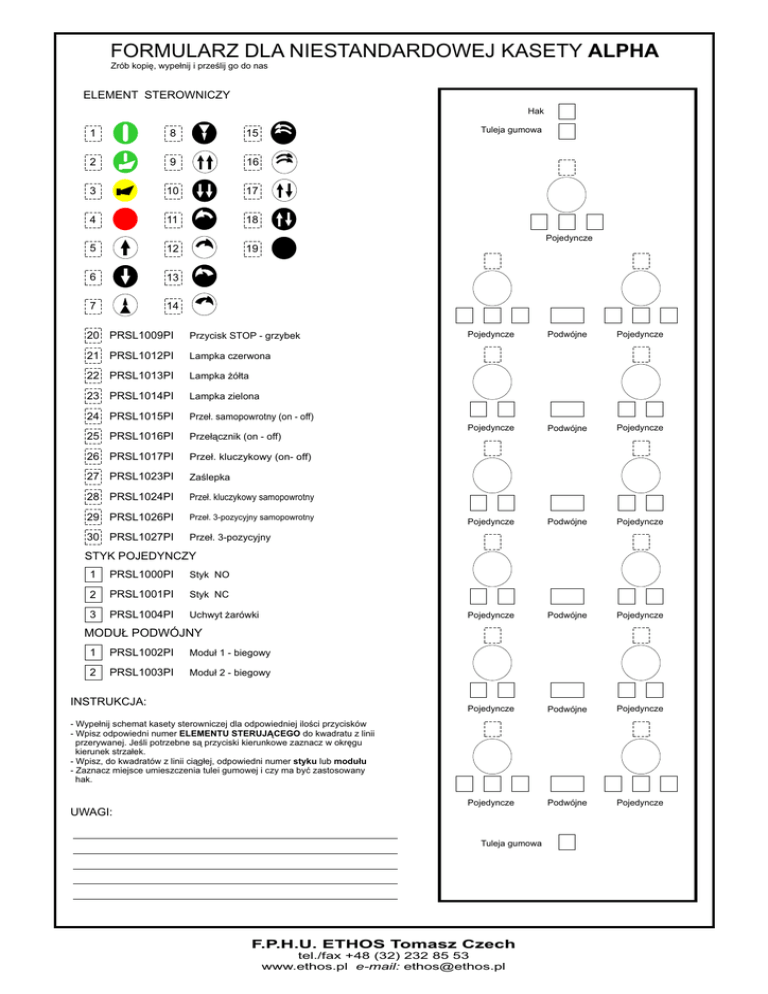 FORMULARZ DLA NIESTANDARDOWEJ KASETY ALPHA Zrób kopiê, wype³nij i przeœlij go do nas ELEMENT STEROWNICZY Hak 1 8 15 2 9 16 3 10 17 4 11 18 5 12 19 6 13 7 14 Tuleja gumowa Pojedyncze 20 PRSL1009PI Przycisk STOP - grzybek 21 PRSL1012PI Lampka czerwona 22 PRSL1013PI Lampka ¿ó³ta 23 PRSL1014PI Lampka zielona 24 PRSL1015PI Prze³. samopowrotny (on - off) 25 PRSL1016PI Prze³¹cznik (on - off) 26 PRSL1017PI Prze³. kluczykowy (on- off) 27 PRSL1023PI Zaœlepka 28 PRSL1024PI Prze³. kluczykowy samopowrotny 29 PRSL1026PI Prze³. 3-pozycyjny samopowrotny 30 PRSL1027PI Prze³. 3-pozycyjny Pojedyncze Podwójne Pojedyncze Pojedyncze Podwójne Pojedyncze Pojedyncze Podwójne Pojedyncze Pojedyncze Podwójne Pojedyncze Pojedyncze Podwójne Pojedyncze Pojedyncze Podwójne Pojedyncze STYK POJEDYNCZY 1 PRSL1000PI Styk NO 2 PRSL1001PI Styk NC 3 PRSL1004PI Uchwyt ¿arówki MODU£ PODWÓJNY 1 PRSL1002PI Modu³ 1 - biegowy 2 PRSL1003PI Modu³ 2 - biegowy INSTRUKCJA: - Wype³nij schemat kasety sterowniczej dla odpowiedniej iloœci przycisków - Wpisz odpowiedni numer ELEMENTU STERUJ¥CEGO do kwadratu z linii przerywanej. Jeœli potrzebne s¹ przyciski kierunkowe zaznacz w okrêgu kierunek strza³ek. - Wpisz, do kwadratów z linii ci¹g³ej, odpowiedni numer styku lub modu³u - Zaznacz miejsce umieszczenia tulei gumowej i czy ma byæ zastosowany hak. UWAGI: Tuleja gumowa F.P.H.U. ETHOS Tomasz Czech tel./fax +48 (32) 232 85 53 www.ethos.pl e-mail: [email protected]