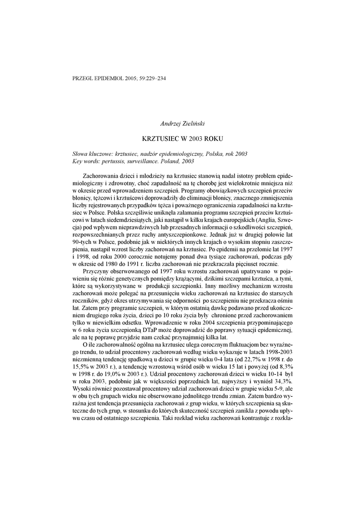 PRZEGL Nr 2 EPIDEMIOL 2005; 59:229234Krztusiec w 2003 229 Andrzej Zieliñski KRZTUSIEC W 2003 ROKU S³owa kluczowe: krztusiec, nadzór epidemiologiczny, Polska, rok 2003 Key words: pertussis, surveillance. Poland, 2003 Zachorowania dzieci i m³odzie¿y na krztusiec stanowi¹ nadal istotny problem epidemiologiczny i zdrowotny, choæ zapadalnoæ na tê chorobê jest wielokrotnie mniejsza ni¿ w okresie przed wprowadzeniem szczepieñ. Programy obowi¹zkowych szczepieñ przeciw b³onicy, tê¿cowi i krztucowi doprowadzi³y do eliminacji b³onicy, znacznego zmniejszenia liczby rejestrowanych przypadków tê¿ca i powa¿nego ograniczenia zapadalnoci na krztusiec w Polsce. Polska szczêliwie uniknê³a za³amania programu szczepieñ przeciw krztucowi w latach siedemdziesi¹tych, jaki nast¹pi³ w kilku krajach europejskich (Anglia, Szwecja) pod wp³ywem nieprawdziwych lub przesadnych informacji o szkodliwoci szczepieñ, rozpowszechnianych przez ruchy antyszczepionkowe. Jednak ju¿ w drugiej po³owie lat 90-tych w Polsce, podobnie jak w niektórych innych krajach o wysokim stopniu zaszczepienia, nast¹pi³ wzrost liczby zachorowañ na krztusiec. Po epidemii na prze³omie lat 1997 i 1998, od roku 2000 corocznie notujemy ponad dwa tysi¹ce zachorowañ, podczas gdy w okresie od 1980 do 1991 r. liczba zachorowañ nie przekracza³a piêciuset rocznie. Przyczyny obserwowanego od 1997 roku wzrostu zachorowañ upatrywano w pojawieniu siê ró¿nic genetycznych pomiêdzy kr¹¿¹cymi, dzikimi szczepami krztuca, a tymi, które s¹ wykorzystywane w produkcji szczepionki. Inny mo¿liwy mechanizm wzrostu zachorowañ mo¿e polegaæ na przesuniêciu wieku zachorowañ na krztusiec do starszych roczników, gdy¿ okres utrzymywania siê odpornoci po szczepieniu nie przekracza omiu lat. Zatem przy programie szczepieñ, w którym ostatni¹ dawkê podawano przed ukoñczeniem drugiego roku ¿ycia, dzieci po 10 roku ¿ycia by³y chronione przed zachorowaniem tylko w niewielkim odsetku. Wprowadzenie w roku 2004 szczepienia przypominaj¹cego w 6 roku ¿ycia szczepionk¹ DTaP mo¿e doprowadziæ do poprawy sytuacji epidemicznej, ale na tê poprawê przyjdzie nam czekaæ przynajmniej kilka lat. O ile zachorowalnoæ ogólna na krztusiec ulega corocznym fluktuacjom bez wyranego trendu, to udzia³ procentowy zachorowañ wed³ug wieku wykazuje w latach 1998-2003 niezmienn¹ tendencjê spadkow¹ u dzieci w grupie wieku 0-4 lata (od 22,7% w 1998 r. do 15,5% w 2003 r.), a tendencjê wzrostow¹ wród osób w wieku 15 lat i powy¿ej (od 8,3% w 1998 r. do 19,0% w 2003 r.). Udzia³ procentowy zachorowañ dzieci w wieku 10-14 by³ w roku 2003, podobnie jak w wiêkszoci poprzednich lat, najwy¿szy i wyniós³ 34,3%. Wysoki równie¿ pozostawa³ procentowy udzia³ zachorowañ dzieci w grupie wieku 5-9, ale w obu tych grupach wieku nie obserwowano jednolitego trendu zmian. Zatem bardzo wyrana jest tendencja przesuniêcia zachorowañ z grup wieku, w których szczepienia s¹ skuteczne do tych grup, w stosunku do których skutecznoæ szczepieñ zanik³a z powodu up³ywu czasu od ostatniego szczepienia. Taki rozk³ad wieku zachorowañ kontrastuje z rozk³a- L! 2JyáHP ]DFK ]DSDG ]DFK ]DSDG ]DFK ]DSDG ]DFK ]DSDG ]DFK ]DSDG Krztusiec w Polsce w latach 1998-2003. Zachorowania i zapadalnoæ na 100 000 mieszkañców i udzia³ procentowy zachorowañ wg wieku Pertussis in Poland in 1998-2003. Number of cases, incidence per 100 000 and distribution of cases according to age :LHN ZODWDFK ]DFK ]DSDG Ta b l e I . Ta b e l a I . 230 A Zieliñski Nr 2 Krztusiec w 2003 Nr 2 231 dem, jaki w populacji dzieci w Polsce wystêpowa³ przed wprowadzeniem szczepieñ, a nawet w stosunkowo d³ugim okresie po ich wprowadzeniu, a obserwacja ostatnich szeciu lat wskazuje na nasilanie siê tych tendencji. Przesuniêcie zachorowañ do starszych roczników utrzymywa³o siê nieodmiennie zarówno przy spadkach jak i przy wzrostach ogólnej zapadalnoci na krztusiec w skali kraju. W 2003 r. zarejestrowano 2034 zachorowania na krztusiec przy ogólnej zapadalnoci 5,3/100000. Stanowi to wzrost zapadalnoci w porównaniu z poprzednim rokiem. Zestawienie liczby zachorowañ i zapadalnoci w ostatnich szeciu latach w grupach wieku jest przedstawione w tabeli I. W roku 2003 r. nie odnotowano zgonów z powodu krztuca. Odnotowano 62 przypadki o ciê¿kim przebiegu klinicznym, a 1166 klasyfikowano jako rednie. Tabela II przedstawia zachorowania i zapadalnoæ na krztusiec wed³ug województw w latach 2002-2003. Najni¿sz¹ zapadalnoæ odnotowano po raz kolejny w województwie zachodniopomorskim (0,24/100000, tylko cztery zg³oszenia), a najwy¿sz¹ (16,72/100000) w województwie ³ódzkim. Ta b e l a I I . Ta b l e I I . Krztusiec w Polsce w 2003 roku. Zachorowania i zapadalnoæ na 100 000 mieszkañców wg województw Pertussis in Poland in 2003. Number of cases and incidence per 100 000 population, according to voivodeship :RMHZyG]WZR 32/6.$ OLF]ED ]DSDGDO ]DFKRUR QR ü ZD OLF]ED ]DSDGDO ]DFKRUR QR ü ZD 'ROQR O VNLH .XMDZVNR3RPRUVNLH /XEHOVNLH /XEXVNLH àyG]NLH 0DáRSROVNLH 0D]RZLHFNLH 2SROVNLH 3RGNDUSDFNLH 3RGODVNLH 3RPRUVNLH O VNLH ZL WRNU]\VNLH :DUPL VNR0D]XUVNLH :LHONRSROVNLH =DFKRGQLRSRPRUVNLH L ! 2JyáHP O ]DFK F]\ QL ]DSDG 0 ZL HNX *UXS\ O]DFK ]DSDG .REL HW\ O ]DFK ]DSDG 0L DVWR O]DFK ]DSDG :LH O ]DFK ]DSDG 2Jyá HP Ta b e l a I I I . Krztusiec w Polsce w 2003 roku. Zachorowania i zapadalnoæ na 100 000 mieszkañców i udzia³ procentowy zachorowañ wg p³ci, wieku i rodowiska Ta b l e I I I . Pertussis in Poland in 2003. Number of cases, incidence per 100 000 and distribution of cases according to sex and age in urban and rural population 232 A Zieliñski Nr 2 Nr 2 Krztusiec w 2003 233 Nale¿y po raz kolejny podkreliæ, ¿e w Polsce, kraju o du¿ej ruchliwoci spo³eczeñstwa, nierównomiernoæ terytorialnego rozk³adu zg³oszeñ jest zbyt wielka, aby móc przyj¹æ te wyniki jako odbicie rzeczywistych ró¿nic w zapadalnoci. Jest bardziej prawdopodobne, ¿e w wielkim stopniu st