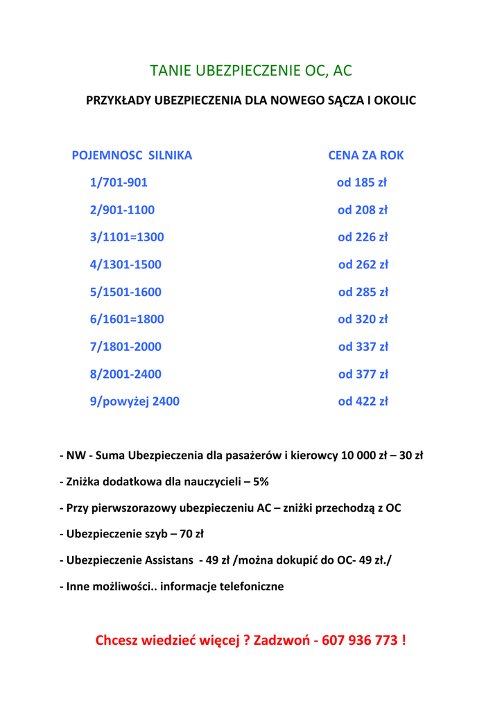 TANIE UBEZPIECZENIE OC, AC PRZYKŁADY UBEZPIECZENIA DLA NOWEGO SĄCZA I OKOLIC POJEMNOSC SILNIKA CENA ZA ROK 1/701-901 od 185 zł 2/901-1100 od 208 zł 3/1101=1300 od 226 zł 4/1301-1500 od 262 zł 5/1501-1600 od 285 zł 6/1601=1800 od 320 zł 7/1801-2000 od 337 zł 8/2001-2400 od 377 zł 9/powyżej 2400 od 422 zł - NW - Suma Ubezpieczenia dla pasażerów i kierowcy 10 000 zł – 30 zł - Zniżka dodatkowa dla nauczycieli – 5% - Przy pierwszorazowy ubezpieczeniu AC – zniżki przechodzą z OC - Ubezpieczenie szyb – 70 zł - Ubezpieczenie Assistans - 49 zł /można dokupić do OC- 49 zł./ - Inne możliwości.. informacje telefoniczne Chcesz wiedzieć więcej ? Zadzwoń - 607 936 773 !