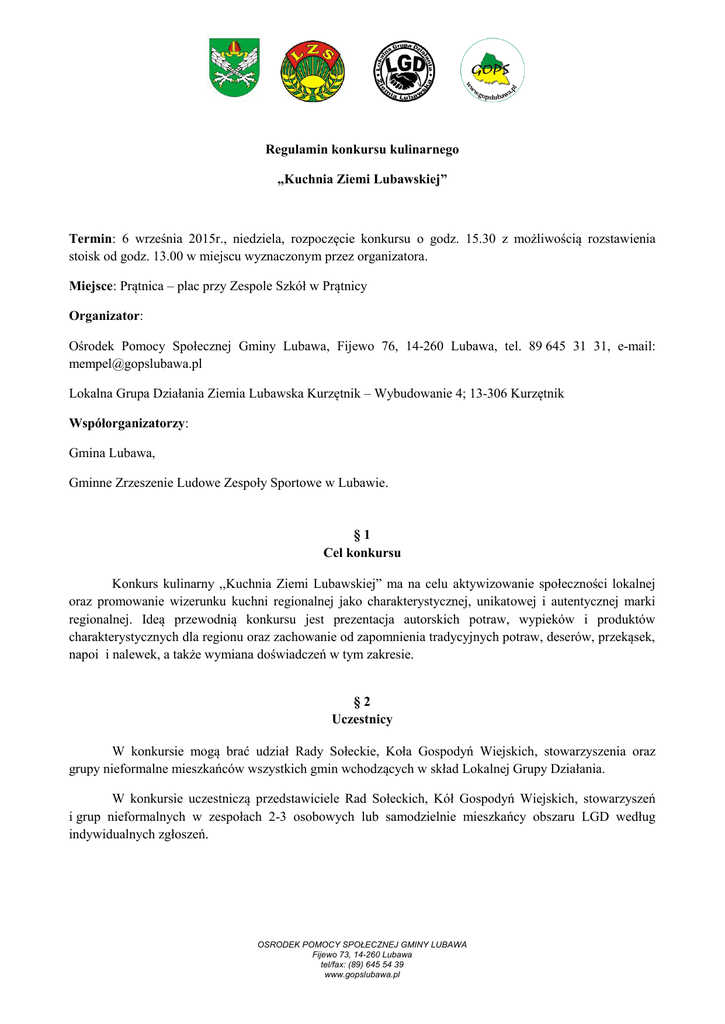 Regulamin konkursu kulinarnego „Kuchnia Ziemi Lubawskiej” Termin: 6 września 2015r., niedziela, rozpoczęcie konkursu o godz. 15.30 z możliwością rozstawienia stoisk od godz. 13.00 w miejscu wyznaczonym przez organizatora. Miejsce: Prątnica – plac przy Zespole Szkół w Prątnicy Organizator: Ośrodek Pomocy Społecznej Gminy Lubawa, Fijewo 76, 14-260 Lubawa, tel. 89 645 31 31, e-mail: [email protected] Lokalna Grupa Działania Ziemia Lubawska Kurzętnik – Wybudowanie 4; 13-306 Kurzętnik Współorganizatorzy: Gmina Lubawa, Gminne Zrzeszenie Ludowe Zespoły Sportowe w Lubawie. §1 Cel konkursu Konkurs kulinarny ,,Kuchnia Ziemi Lubawskiej” ma na celu aktywizowanie społeczności lokalnej oraz promowanie wizerunku kuchni regionalnej jako charakterystycznej, unikatowej i autentycznej marki regionalnej. Ideą przewodnią konkursu jest prezentacja autorskich potraw, wypieków i produktów charakterystycznych dla regionu oraz zachowanie od zapomnienia tradycyjnych potraw, deserów, przekąsek, napoi i nalewek, a także wymiana doświadczeń w tym zakresie. §2 Uczestnicy W konkursie mogą brać udział Rady Sołeckie, Koła Gospodyń Wiejskich, stowarzyszenia oraz grupy nieformalne mieszkańców wszystkich gmin wchodzących w skład Lokalnej Grupy Działania. W konkursie uczestniczą przedstawiciele Rad Sołeckich, Kół Gospodyń Wiejskich, stowarzyszeń i grup nieformalnych w zespołach 2-3 osobowych lub samodzielnie mieszkańcy obszaru LGD według indywidualnych zgłoszeń. OSRODEK POMOCY SPOŁECZNEJ GMINY LUBAWA Fijewo 73, 14-260 Lubawa tel/fax: (89) 645 54 39 www.gopslubawa.pl §3 Zgłoszenie uczestnictwa Rady Sołeckie, Koła Gospodyń Wiejskich, stowarzyszenia oraz grupy nieformalne zainteresowane udziałem w konkursie zobowiązani są do dokonania zgłoszenia na załączonym formularzu (Załącznik nr 1). Zgłoszenia należy: 1) przesłać pocztą na adres Ośrodek Pomocy Społecznej Gminy Lubawa, 14-260 Lubawa, Fijewo 73, 2) lub mailem w formie PDF - na adres: [email protected] 3) lub przesłać faxem: /89/ 645-54-39, 4) lub dostarczyć osobiście do siedziby OPS Gminy Lubawa (14-260 Lubawa, Fijewo 73) w terminie do dnia 1 września 2015r. O uczestnictwie w konkursie decyduje data zgłoszenia Rady Sołeckiej, Koła Gospodyń Wiejskich stowarzyszenia oraz grupy nieformalnej. Ilość ekip startujących jest limitowana i określona kolejnością zgłoszeń (12 zespołów). Organizator zastrzega sobie prawo do rozszerzenia limitu ekip, w przypadku wpłynięcia większej ilości zgłoszeń. §4 Zasady organizacyjne Organizator nie pokrywa kosztów podróży uczestników konkursu. Drobny sprzęt kuchenny oraz zastawę do prezentowania potraw, wypieków i produktów grupa zapewnia we własnym zakresie. Dopuszcza się dodatkowe akcje promujące Radę Sołecką, Koło Gospodyń Wiejskich, stowarzyszenia lub grupy nieformalne; region i potrawy w postaci osobnego stoiska degustacyjnego dla uczestników imprezy, o czym należy powiadomić organizatora wraz ze złożeniem zgłoszenia uczestnictwa w konkursie. Uczestnicy konkursu zapewniają we własnym zakresie produkty niezbędne do przygotowania potraw, wypieków i produktów kulinarnych. Uczestnicy mogą wystąpić w regionalnych strojach ludowych lub tradycyjnych strojach kucharskich. §5 Zasady przeprowadzenia konkursu Do udziału w konkursie należy przygotować maksymalnie 5 potraw, wypieków lub produktów specyficznych dla regionu, które mogą zostać przeznaczone do spożycia lub do sporządzenia potraw. Produkty muszą być związane z określonym obszarem geograficznym, charakteryzować się szczególnymi cechami, często wynikającymi ze specyficznych warunków klimatycznych i glebowych regionu, z którego pochodzą. Przygotowanie większej ilości potraw może być podstawą dyskwalifikacji uczestników. W konkursie mogą wziąć udział produkty następującego typu: pochodzenia zwierzęcego (np. mięso, ryby, drób, wędliny, mleko, sery, farsze, miód i jego przetwory), pochodzenia roślinnego (np. owoce, warzywa, konfitury, powidła, marmolady, octy, marynaty, soki, zakwasy, chleby i inne wypieki), napoje regionalne (alkoholowe i bezalkoholowe). OSRODEK POMOCY SPOŁECZNEJ GMINY LUBAWA Fijewo 73, 14-260 Lubawa tel/fax: (89) 645 54 39 www.gopslubawa.pl Każdy zespół musi przygotować po 3 porcje produktów konkursowych dla 3-osobowego jury degustacyjnego oraz ekspozycję. Wszystkie prace konkursowe powinny być oryginalne, atrakcyjne w formie i treści. Każdy członek jury może przyznać maksymalnie 40 punktów. Kryteria oceny: ciekawy wygląd , aranżacja, sposób podania – do 10 pkt. smak potrawy i różnorodny dobór składników wykorzystanych produktów – do 10 pkt. związek potrawy z tradycją i kulturą Ziemi Lubawskiej – 10 pkt. prezentacja składników, receptury i sposobu przygotowania potrawy – 10 pkt. Każdy uczestnik konkursu jest zobowiązany zaprezentować łącznie z produktem kulinarnym jego recepturę obejmującą składniki i sposób przygotowania w sposób dostępny i czytelny dla jury oraz publiczności. §6 Założenia końcowe Organizator konkursu zastrzega sobie prawo do wykorzystywania produktów kulinarnych prezentowanych w trakcie konkursu (zdjęcia, filmy, receptura i sposób przygotowania) w przedsięwzięciach promocyjnych (np. publikacje prasowe i wydawnicze, Internet, itp.) W konkursie przewidziane są nagrody w postaci bonów pieniężnych dla pierwszych trzech miejsc, z przeznaczeniem na zakup sprzętu AGD, naczyń itp. akcesoriów kuchennych. Lista laureatów zostanie www.gopslubawa.pl. zamieszczona na stronie internetowej www.lgdziemialubawska.pl, Wszystkie pytania należy kierować do Organizatora. Szczegółowych informacji udzielają: Monika Empel, Ośrodek Pomocy Społecznej Gminy Lubawa, tel. (0-89) 645 31 31, e-mail: [email protected]. OSRODEK POMOCY SPOŁECZNEJ GMINY LUBAWA Fijewo 73, 14-260 Lubawa tel/fax: (89) 645 54 39 www.gopslubawa.pl