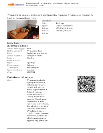 Nieruchomości we Lwowie: mieszkania, domy, budynki http://dim.lviv.ua/pl/ Wynajem na dzień, 3 pokojowe apartamenty, Knyazya Svyatoslava Square, 5, Lwów, Zaliznychnyi rejon Seller Info Imię: Spółka: Telefon: Telefon: Telefon: dimlvivua Dom Nieruchomości +38 (096) 614-5050 +38 (063) 964-2587 Listing details Informacje ogólne Numer referencyjny: Rodzaj transakcji: Pokoi: Miejsc do spania: Metrów kwadratowych: Piętro: Piętrowy dom: Typ budynku: Klasa mieszkania: Cena: 0714 Wynajem na dzień 3 pokojowe apartamenty 8 Miejsc do spania 85 m.kw. 5 podłoga 9 piętrowy Nowy budynek Standard 650 UAH Dodatkowe informacje Opis: Wynajem mieszkania 3-pokojowe w nowym budynku EuroClass w zakresie kolejowego miasta na powierzchni 5 (książę Światosław Jarosława Mądrego Circus). Neat wejście naprawy. Okrągły zegar zaopatrzenia w wodę, ogrzewanie indywidualne, dwa telewizory, telewizję satelitarną, odtwarzacz DVD, kino domowe, czajnik, żelazko, deska do prasowania, suszarka do włosów, prysznic, dwie wygodne sofy, podwójne page 1 / 2 Nieruchomości we Lwowie: mieszkania, domy, budynki http://dim.lviv.ua/pl/ łóżko. Miejsca 8 (2 + 2 + 2 + 2). Посуточно квартиры Львов Lokalizacja Kraj: Obwód: Miasto: Rejon: Ulice: Numer domu: Ukraina Obwód Lwowski Lwów Zaliznychnyi rejon Knyazya Svyatoslava Square 5 page 2 / 2 Powered by TCPDF (www.tcpdf.org)