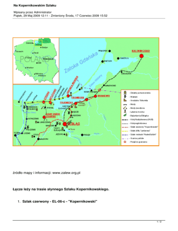 Na Kopernikowskim Szlaku Wpisany przez Administrator Piątek, 29 Maj 2009 12:11 - Zmieniony Środa, 17 Czerwiec 2009 15:52 źródło mapy i informacji: www.zalew.org.pl Łęcze leży na trasie słynnego Szlaku Kopernikowskiego. 1. Szlak czerwony - EL-06-c - "Kopernikowski" 1/2 Na Kopernikowskim Szlaku Wpisany przez Administrator Piątek, 29 Maj 2009 12:11 - Zmieniony Środa, 17 Czerwiec 2009 15:52 Szlak prowadzi z- to Torunia do Olsztyna, aMiędzynarodowego jego Próchnik, fragment na trasie Elbląg - Brani ewo Szlaku Pieszego jest ostatnim (na Przebieg odcinkiem szlaku odElbląga. Elbląga: Dalekobieżnego Elbląg Elbląg-Bażantarnia, Jagodnik, Łęcze, Suchacz, Kadyny, Tolkmicko ,-miasto, Braniewo .Frombork Elbląg - to"E-9". miasto zrazie) 750 letnią historią i ciekawymi zabytkami. - ten Bażantarnia piękny park leśny Jagodnik czci- mieszkańców wieś poległych naz terenie szlaku wholenderskiego. IDora. wojnie zgrodziska pięknym mostem światowej. zsię 1925 r. oraz obeliskiem Łęcze grodzisko. Zachowały skorupa archeologa wiatraka się- jest tu-kościół prof. jednym Roberta Na zpołowy najstarszych XVIII miejsc znajduje Zaosadnictwa wsią wieku, szlak głaz nieliczne przechodzi z inskrypcją już chaty przez naupamiętniającą ziemi podcieniowe potężne elbląskiej.ku oraz Suchacz poświęcony hotelu "Zameczek Carlowi Pudorowi. Zatoką" wieś letniskowa. (obecnie szkoła). Zachował się tu WWzgórzu pobliżu budynek budynku dawnego stoi obelisk -- wieku Kadyny zachowanymi Dąb pobliskich Wilhelma Bażyńskiego. na terenie Pagórkach zabudowaniami - -todawniej Wysoczyzny Na wieś II zachował wzgórzu w o Kadynach. bogatej folwarcznymi. Elbląskiej. odbudowywany historii, Wały ziKopernika". Tolkemita pięknym się Rośnie obelisk tu barokowym - Posiada to upamiętniający jest klasztor także grodzisko pierwszą franciszkański. wspaniały zachowane wizytę 1000-letni i Kolei cesarza W z Tolkmicko piękny budynek -głazu to dworca Kolei Nadzalewowej port na Zalewem inajwiększe kościół Wiślanym, gotycki gdzie z XIV warto wieku. zobaczyć Święty Kamień Wiślanego. Nadzalewowej. Obwód -miasto to potężny 13,80 głaz m. Jest narzutowy doskonale leżący w widoczny wodach zpałacem pociągu Zalewu Frombork XIV wahadło Foucaulta -nad to "miasto ze wok. słynnymi Wieży Radziejowskiego. organami. Ciekawostką na liczne zabytki Katedralnym m.in. katedrę jest -starego Braniewo zoologiczny kościół św. iumieszczony nowego - to miasta. miasto Katarzyny w dawnej Atrakcją i kościół fosie. Braniewa nad św.Pasłęką. Krzyża. jest najmniejszy Wśród Ciekawy zabytków jest układ godne przestrzenny w uwagi Polscesą ogród m.in. 2/2