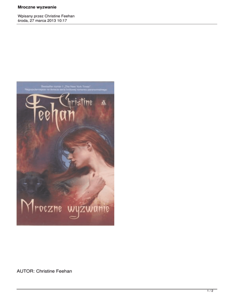 Mroczne wyzwanie Wpisany przez Christine Feehan środa, 27 marca 2013 10:17 AUTOR: Christine Feehan 1/2 Mroczne wyzwanie Wpisany przez Christine Feehan środa, 27 marca 2013 10:17 Byli panami mroku i przez całą wieczność poszukiwali przeznaczonych im pań światła... Już tylko krok dzieli Juliana od przejścia na stronę ciemności i przeistoczenia się w wampira. Nieśmiertelny karpatiański wojownik jest znużony długim samotnym życiem, w którym nie ma miejsca na uczucia. Nagle spotyka Desari - i nie ma wątpliwości, że odnalazł tę jedyną. Zniewalający głos pięknej śpiewaczki sprawia, że Julian odnajduje sens swej jałowej egzystencji i zatraca się w mrocznej namiętności. Lecz czy ta, której tak pragnie, ocali jego duszę, czy zniszczy go na zawsze? 2/2