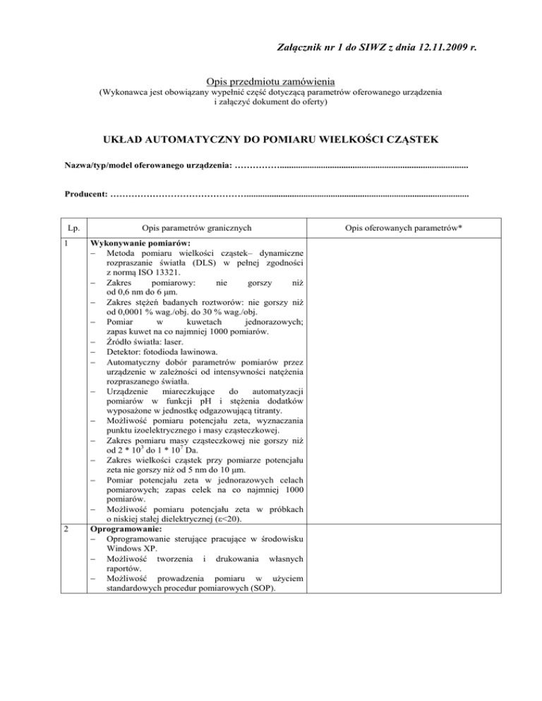 Załącznik nr 1 do SIWZ z dnia 12.11.2009 r. Opis przedmiotu zamówienia (Wykonawca jest obowiązany wypełnić część dotyczącą parametrów oferowanego urządzenia i załączyć dokument do oferty) UKŁAD AUTOMATYCZNY DO POMIARU WIELKOŚCI CZĄSTEK Nazwa/typ/model oferowanego urządzenia: ……………................................................................................... Producent: ……………………………………….................................................................................................. Lp. 1 2 Opis parametrów granicznych Wykonywanie pomiarów: Metoda pomiaru wielkości cząstek– dynamiczne rozpraszanie światła (DLS) w pełnej zgodności z normą ISO 13321. Zakres pomiarowy: nie gorszy niż od 0,6 nm do 6 μm. Zakres stężeń badanych roztworów: nie gorszy niż od 0,0001 % wag./obj. do 30 % wag./obj. Pomiar w kuwetach jednorazowych; zapas kuwet na co najmniej 1000 pomiarów. Źródło światła: laser. Detektor: fotodioda lawinowa. Automatyczny dobór parametrów pomiarów przez urządzenie w zależności od intensywności natężenia rozpraszanego światła. Urządzenie miareczkujące do automatyzacji pomiarów w funkcji pH i stężenia dodatków wyposażone w jednostkę odgazowującą titranty. Możliwość pomiaru potencjału zeta, wyznaczania punktu izoelektrycznego i masy cząsteczkowej. Zakres pomiaru masy cząsteczkowej nie gorszy niż od 2 * 103 do 1 * 107 Da. Zakres wielkości cząstek przy pomiarze potencjału zeta nie gorszy niż od 5 nm do 10 μm. Pomiar potencjału zeta w jednorazowych celach pomiarowych; zapas celek na co najmniej 1000 pomiarów. Możliwość pomiaru potencjału zeta w próbkach o niskiej stałej dielektrycznej (ε<20). Oprogramowanie: Oprogramowanie sterujące pracujące w środowisku Windows XP. Możliwość tworzenia i drukowania własnych raportów. Możliwość prowadzenia pomiaru w użyciem standardowych procedur pomiarowych (SOP). Opis oferowanych parametrów* 3 4 5 6 7 8 9 10 11 12 Notebook o parametrach nie gorszych niż: - procesor Intel Core2 Duo, częstotliwość taktowania procesora: min. 2,66 GHz, FSB 800 MHz,, (lub równoważny), - RAM: min. 2 GB z możliwością rozbudowy do 8 GB; DDR3, FSB min. 1066 MHz, - pojemność dysku twardego: min. 320 GB, - napęd: DVD +/- RW z oprogramowaniem do nagrywania, - przekątna ekranu LCD min. 15,4”, - ekran matowy (non-glare), - karta sieciowa min. 100 Mbps, - min. 3 porty USB, - min. 1 port COM, - interfejs PCMCIA, - mysz optyczna do notebooka, - torba, - Windows XP Professional. - Gwarancja na komputer min. 36 miesięcy. Instrukcje obsługi w języku polskim (pełne tłumaczenie wersji angielskojęzycznej) i angielskim w formie drukowanej i elektronicznej. Gwarancja minimum 24 miesiące od uruchomienia. Serwis w okresie gwarancji i pogwarancyjny w Polsce, czas reakcji w przypadku zgłoszenia awarii do 3 dni roboczych. Termin usunięcia awarii do 7 dni roboczych, w przypadku przekroczenia tego terminu Oferent musi dostarczyć Zamawiającemu jednostkę zastępczą. Dokumentacja walidacyjna oraz wykonanie kwalifikacji. Protokoły IQ/OQ powinny opisywać zakres, procedury i kryteria akceptacji każdego z testów. Powinny zostać dostarczone w postaci drukowanej i na nośniku. Przegląd serwisowy i ponowne wykonanie testów OQ zamawianych urządzeń w siedzibie zamawiającego w 12-tym i 24-tym miesiącu od uruchomienia, bez dodatkowych opłat. Części zamienne do zamawianych urządzeń dostępne minimum 7 lat od daty zakupu, w okresie gwarancji bezpłatnie. Instruktaż z obsługi urządzenia – co najmniej 2 dni. Deklaracja oferenta, że urządzenia są fabrycznie nowe – załączyć do oferty. Wyklucza się urządzenia używane lub składane z używanych części. Oświadczenie oferenta, że urządzenia są kompletne i po zainstalowaniu będą gotowe do pracy bez konieczności dodatkowych zakupów – załączyć do oferty. Deklaracja zgodności CE – załączyć do oferty. Niespełnienie choćby jednego z powyższych parametrów skutkować będzie odrzuceniem oferty. PARAMETRY DODATKOWO PUNKTOWANE Lp. 1. 2. Opis parametru Możliwość pomiaru w próbkach o objętości poniżej 15 μl Możliwość podłączenia analizatora jako detektora SEC (Size Exclusion Chromatography) Razem maksymalna ilość punktów …………………….. (miejscowość, data) Specyfikacja parametru Nie Tak Nie Tak Ilość punktów 0 5 0 5 Oferowane parametry* 10 punktów …………………………….. ( podpis i pieczęć)