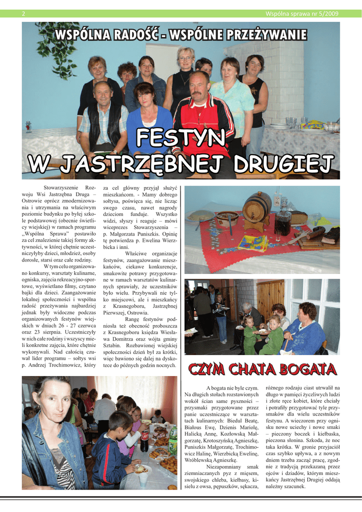 2 Wspólna sprawa nr 5/2009 WSPÓLNA RADOŚĆ - WSPÓLNE PRZEŻYWANIE FESTYN W JASTRZĘBNEJ DRUGIEJ Stowarzyszenie Rozwoju Wsi Jastrzębna Druga – Ostrowie oprócz zmodernizowania i utrzymania na właściwym poziomie budynku po byłej szkole podstawowej (obecnie świetlicy wiejskiej) w ramach programu ,,Wspólna Sprawa” postawiło za cel znalezienie takiej formy aktywności, w której chętnie uczestniczyłyby dzieci, młodzież, osoby dorosłe, starsi oraz całe rodziny. W tym celu organizowano konkursy, warsztaty kulinarne, ogniska, zajęcia rekreacyjno-sportowe, wyświetlano filmy, czytano bajki dla dzieci. Zaangażowanie lokalnej społeczności i wspólna radość przeżywania najbardziej jednak były widoczne podczas organizowanych festynów wiejskich w dniach 26 - 27 czerwca oraz 23 sierpnia. Uczestniczyły w nich całe rodziny i wszyscy mieli konkretne zajęcia, które chętnie wykonywali. Nad całością czuwał lider programu – sołtys wsi p. Andrzej Trochimowicz, który za cel główny przyjął służyć mieszkańcom. - Mamy dobrego sołtysa, poświęca się, nie licząc swego czasu, nawet nagrody dzieciom funduje. Wszystko widzi, słyszy i reaguje – mówi wiceprezes Stowarzyszenia – p. Małgorzata Puniszkis. Opinię tę potwierdza p. Ewelina Wierzbicka i inni. Właściwe organizacje festynów, zaangażowanie mieszkańców, ciekawe konkurencje, smakowite potrawy przygotowane w ramach warsztatów kulinarnych sprawiały, że uczestników było wielu. Przybywali nie tylko miejscowi, ale i mieszkańcy z Krasnegoboru, Jastrzębnej Pierwszej, Ostrowia. Rangę festynów podniosła też obecność proboszcza z Krasnegoboru księdza Wiesława Domitrza oraz wójta gminy Sztabin. Rozbawionej wiejskiej społeczności dzień był za krótki, więc bawiono się dalej na dyskotece do późnych godzin nocnych. Czym chata bogata A bogata nie byle czym. Na długich stołach rozstawionych wokół ścian same pyszności – przysmaki przygotowane przez panie uczestniczące w warsztatach kulinarnych: Biedul Beatę, Białous Ewę, Dzienis Mariolę, Halicką Annę, Kozłowską Małgorzatę, Krotoszyńską Agnieszkę, Puniszkis Małgorzatę, Trochimowicz Halinę, Wierzbicką Ewelinę, Wróblewską Agnieszkę. Niezapomniany smak ziemniaczanych pyz z mięsem, swojskiego chleba, kiełbasy, kisielu z owsa, pępuszków, sękacza, różnego rodzaju ciast utrwalił na długo w pamięci życzliwych ludzi i złote ręce kobiet, które chciały i potrafiły przygotować tyle przysmaków dla wielu uczestników festynu. A wieczorem przy ognisku nowe uciechy i nowe smaki – pieczony boczek i kiełbaska, pieczona słonina. Szkoda, że noc taka krótka. W gronie przyjaciół czas szybko upływa, a z nowym dniem trzeba zacząć pracę, zgodnie z tradycją przekazaną przez ojców i dziadów, którym mieszkańcy Jastrzębnej Drugiej oddają należny szacunek.