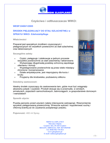 MDM GLASPLANET Czyściwa i odtłuszczacze WIKO: WESP.D400/1/2005 ŚRODEK PIĘLĘGNUJĄCY DO STALI SZLACHETNEJ w SPRAYU/ WIKO- Edehstahlpflege Właściwości Preparat jest specjalnym środkiem czyszczącym i pielęgnacyjnym do wszelkich powierzchni ze stali szlachetnej oraz lakierowanych Szczególne zalety: • • • • • Czyści, pielęgnuje i zalakowuje w jednym procesie wszystkie powierzchnie ze stali szlachetnej i lakierowane. Wytwarzając długotrwałą powłokę ochronną zapobiega utlenianiu i korozji Wypielęgnowane powierzchnie są przez wiele miesięcy chronione i konserwowane Działa antystatycznie, jest nieprzyjazny dla kurzu i brudu Przyjazny dla środowiska, pozbawiony silikonu Dziedziny zastosowań: Idealny środek czyszczący do zastosowania tam, gdzie musi być osiągnięty absolutny połysk i czystość. Produkt stosuje się w przemyśle, w windach, armaturach, pojazdach samochodowych, taśmociągach, w gospodarstwie domowym i warsztatach Sposób użycia: Puszką aerozolu przed użyciem należy intensywnie wstrząsnąć. Równomiernie spryskać pielęgnowaną powierzchnię. Wreszcie wytrzeć i wypolerować suchą i chłonną ścierką aż do uzyskania pożądanego połysku. Pojemność:: 400 ml Spray. MDM GLASPLANET Mirosław Dąbek Grębów 464, 39-410 Grębów REGON: 180016122, NIP: 8671903940 Tel. 0048 502-735-814 www.glasplanet.pl E-mail: [email protected] -1- MDM GLASPLANET WMO.D500/1/2005 CZYŚCIWO MONTAŻOWE / WIKO- Montagereiniger Właściwości Preparat jest wysokiej jakości czyściwem i odtłuszczaczem (nie jest rozcieńczony) przeznaczonym do wszelkich prac naprawczych i montażowych. Szczególne zalety • • • • Działa mocno, silnie i głęboko wnika w pory materiału Nie pozostawia osadu i resztek (w porównaniu z rozcieńczalnikami) Nie korodujący (nie jest żrący) Pozwala uzyskiwać czyste jak łza powierzchnie Dziedziny zastosowań: • • • • • Idealny do stosowania w całym przemyśle, rzemiośle przy reperacjach i remontach. Likwidacja plam olei, tłuszczu, żywicy, resztek kleju, startego metalu z hamulców i sprzęgieł. Odtłuszczenia przed klejeniem powierzchni lakierowanych oraz z tworzyw sztucznych. Czyszczenie części silnika, resorów, urządzeń elektrycznych, rozruszników, łożysk walcowych i prowadnic Oczyszczanie trudnych plam z tapicerki, tekstyliów Sposób użycia: Pojemnik mocno wstrząsnąć. Nanieść porządnie preparat na zabrudzone części i pozwolić mu odparować. Pozwolić części wyschnąć na powietrzu lub wytrzeć suchą szmatką. Przy silnych zabrudzeniach ewentualnie proces powtórzyć. Przy tworzywach sztucznych, gumie, farbach, tekstyliach oraz tapicerce przetestować działanie w niewidocznym miejscu. Pojemność::500 ml Spray/5 / 10 / 30 / 60 / 200 Litrowy pojemnik. MDM GLASPLANET Mirosław Dąbek Grębów 464, 39-410 Grębów REGON: 180016122, NIP: 8671903940 Tel. 0048 502-735-814 www.glasplanet.pl E-mail: [email protected] -2- MDM GLASPLANET WO7K06.D400/1/2005 CZYŚCIWO BŁYSKAWICZNE PRZEMYSŁOWE WIKO- Industrieschnellreiniger Właściwości Preparat składa się z rozpuszczalników węglowodoru, alkoholi i eteru oraz zawiera aż ponad 90% wysoce skutecznych biokatalizatorów Szczególne zalety: • • • • Nie pozostawia błony, ani innych pozostałości Szybko odparowuje Nie koroduje (nie jest żrący w krótkotrwałym kontakcie) Usuwa ślady wilgoci z powierzchni metali Dziedziny zastosowań: Przystosowany szczególnie do czyszczenia hamulców tarczowych, części hamulców, np. klocków hamulcowych, płyt, okładzin. Czyści z oleju, brudu, wytartego metalu. Nie pozostawia absolutnie żadnych pozostałości, nie jest żrący. Przy przypadkowym, krótkotrwałym kontakcie nie niszczy skóry, gumy, manszetów, ponieważ szybko odparowuje. Poza tym to doskonały środek do czyszczenia i odtłuszczania szkła, ceramiki i metali w warsztatach, zakładach i gospodarstwie domowym. Przydatny szczególnie do przygotowywania powierzchni metali do lakierowania klejenia i gruntowania, jak również do usuwania resztek silikonów z metali. Sposób użycia: Popryskać części przeznaczone do oczyszczenia, aż brud i tłuszcz się zmyją albo nanieść preparat i zmyć czystą ścierką. Jeśli zajdzie taka potrzeba proces czyszczenia powtórzyć. Uwaga: Nie czyścić tworzyw sztucznych oraz powierzchni lakierowanych! Pojemność::400 ml Spray/5 / 10/ 30 / 60 / 200 Litrowe pojemniki MDM GLASPLANET Mirosław Dąbek Grębów 464, 39-410 Grębów REGON: 180016122, NIP: 8671903940 Tel. 0048 502-735-814 www.glasplanet.pl E-mail: [email protected] -3- MDM GLASPLANET WBR.D600/1/2005 CZYŚCIWO DO HAMULCÓW / WIKO- Bremsenreiniger Właściwości Preparat bazuje na specjalnym typie benzyny. Dzięki szczególnej szybkości odparowywania uzyskiwany jest bardzo szybko optymalny efekt czyszczący. Czyściwo nie jest żrące i nie niszczy gumy i tworzyw sztucznych (zalecany każdorazowo test działania) Nie zawiera FCKW, HCKW oraz pozbawiony żrących substancji. Szczególne zalety • • • Nie korodujący (nie żrący) Nie pozostawia błony, ani innych pozostałości Szybko odparowuje Dziedziny zastosowań: Stosowany do szybkiego czyszczenia bębnów, tarcz, okładzin, klocków hamulcowych a także części sprzęgła. Poza tym to doskonały środek do czyszczenia silnie zaoliwionych i zabrudzonych części maszyn, także z zestarzałego brudu. Sposób użycia: Z około 20 cm spryskać części przeznaczone do oczyszczenia i pozwolić odparować. Przy silnych zabrudzeniach proces czyszczenia kilkakrotnie powtórzyć. Pojemność::600 ml Spray/5 / 10 / 30 / 60 / 200 Litrowy pojemnik MDM GLASPLANET Mirosław Dąbek Grębów 464, 39-410 Grębów REGON: 180016122, NIP: 8671903940 Tel. 0048 502-735-814 www.glasplanet.pl E-mail: [email protected] -4- MDM GLASPLANET WSS.D400/1/2005 SUPER PIANKA CZYSZCZĄCA / WIKO-Superschaum Właściwości Środek o bardzo szerokim zastosowaniu, wysoce skuteczny, czyści i usuwa pla