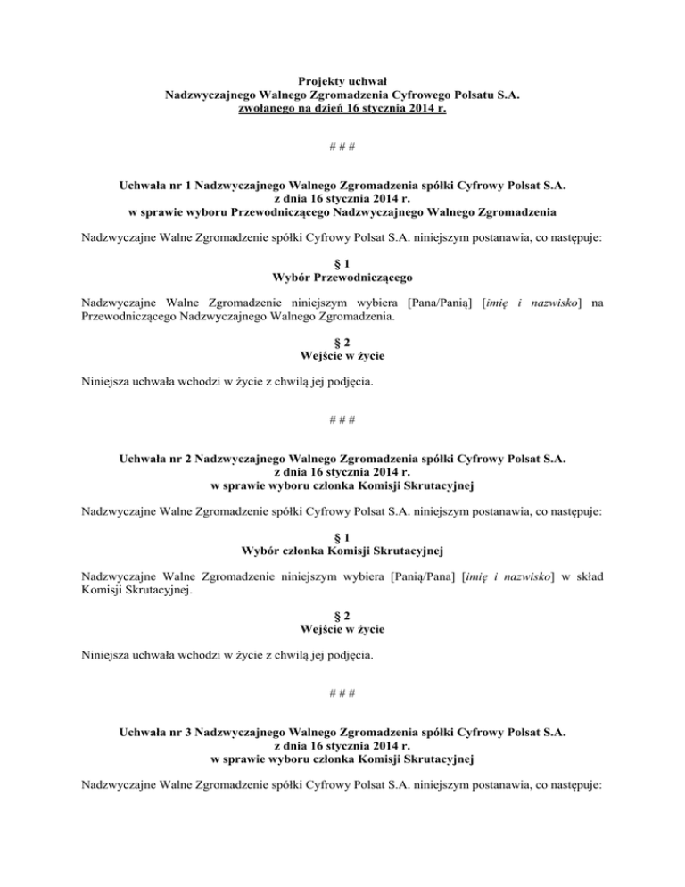 Projekty uchwał Nadzwyczajnego Walnego Zgromadzenia Cyfrowego Polsatu S.A. zwołanego na dzień 16 stycznia 2014 r. ### Uchwała nr 1 Nadzwyczajnego Walnego Zgromadzenia spółki Cyfrowy Polsat S.A. z dnia 16 stycznia 2014 r. w sprawie wyboru Przewodniczącego Nadzwyczajnego Walnego Zgromadzenia Nadzwyczajne Walne Zgromadzenie spółki Cyfrowy Polsat S.A. niniejszym postanawia, co następuje: §1 Wybór Przewodniczącego Nadzwyczajne Walne Zgromadzenie niniejszym wybiera [Pana/Panią] [imię i nazwisko] na Przewodniczącego Nadzwyczajnego Walnego Zgromadzenia. §2 Wejście w życie Niniejsza uchwała wchodzi w życie z chwilą jej podjęcia. ### Uchwała nr 2 Nadzwyczajnego Walnego Zgromadzenia spółki Cyfrowy Polsat S.A. z dnia 16 stycznia 2014 r. w sprawie wyboru członka Komisji Skrutacyjnej Nadzwyczajne Walne Zgromadzenie spółki Cyfrowy Polsat S.A. niniejszym postanawia, co następuje: §1 Wybór członka Komisji Skrutacyjnej Nadzwyczajne Walne Zgromadzenie niniejszym wybiera [Panią/Pana] [imię i nazwisko] w skład Komisji Skrutacyjnej. §2 Wejście w życie Niniejsza uchwała wchodzi w życie z chwilą jej podjęcia. ### Uchwała nr 3 Nadzwyczajnego Walnego Zgromadzenia spółki Cyfrowy Polsat S.A. z dnia 16 stycznia 2014 r. w sprawie wyboru członka Komisji Skrutacyjnej Nadzwyczajne Walne Zgromadzenie spółki Cyfrowy Polsat S.A. niniejszym postanawia, co następuje: §1 Wybór członka Komisji Skrutacyjnej Nadzwyczajne Walne Zgromadzenie niniejszym wybiera [Panią/Pana] [imię i nazwisko] w skład Komisji Skrutacyjnej. §2 Wejście w życie Niniejsza uchwała wchodzi w życie z chwilą jej podjęcia. ### Uchwała nr 4 Nadzwyczajnego Walnego Zgromadzenia spółki Cyfrowy Polsat S.A. z dnia 16 stycznia 2014 r. w sprawie wyboru członka Komisji Skrutacyjnej Nadzwyczajne Walne Zgromadzenie spółki Cyfrowy Polsat S.A. niniejszym postanawia, co następuje: §1 Wybór członka Komisji Skrutacyjnej Nadzwyczajne Walne Zgromadzenie niniejszym wybiera [Panią/Pana] [imię i nazwisko] w skład Komisji Skrutacyjnej. §2 Wejście w życie Niniejsza uchwała wchodzi w życie z chwilą jej podjęcia. ### Uchwała nr 5 Nadzwyczajnego Walnego Zgromadzenia spółki Cyfrowy Polsat S.A. z dnia 16 stycznia 2014 r. w sprawie przyjęcia porządku obrad Nadzwyczajnego Walnego Zgromadzenia Nadzwyczajne Walne Zgromadzenie spółki Cyfrowy Polsat S.A. („Spółka”) niniejszym postanawia, co następuje: §1 Przyjęcie porządku obrad Nadzwyczajne Walne Zgromadzenie postanawia niniejszym przyjąć porządek obrad w następującym brzmieniu: (1) Otwarcie obrad Nadzwyczajnego Walnego Zgromadzenia. (2) Wybór Przewodniczącego Nadzwyczajnego Walnego Zgromadzenia. (3) Sporządzenie listy obecności, stwierdzenie prawidłowości zwołania Nadzwyczajnego Walnego Zgromadzenia oraz jego zdolności do podejmowania uchwał. (4) Wybór członków Komisji Skrutacyjnej. (5) Przyjęcie porządku obrad Nadzwyczajnego Walnego Zgromadzenia. (6) Podjęcie uchwały w sprawie warunkowego podwyższenia kapitału zakładowego Spółki w drodze emisji akcji zwykłych na okaziciela serii I. (7) Podjęcie uchwały w sprawie pozbawienia w całości prawa poboru dotychczasowych akcjonariuszy Spółki w odniesieniu do wszystkich akcji serii I. (8) Podjęcie uchwały w sprawie emisji warrantów subskrypcyjnych serii I. (9) Podjęcie uchwały w sprawie pozbawienia w całości prawa poboru dotychczasowych akcjonariuszy Spółki w odniesieniu do wszystkich warrantów subskrypcyjnych serii I. (10) Podjęcie uchwały w sprawie upoważnienia Zarządu Spółki do podjęcia wszelkich czynności niezbędnych do dematerializacji oraz do dopuszczenia akcji zwykłych na okaziciela serii I wyemitowanych w ramach warunkowego podwyższenia kapitału zakładowego Spółki do obrotu na rynku regulowanym prowadzonym przez Giełdę Papierów Wartościowych w Warszawie S.A. (11) Zamknięcie obrad Nadzwyczajnego Walnego Zgromadzenia. §2 Wejście w życie Niniejsza uchwała wchodzi w życie z chwilą jej podjęcia. ### Uchwała nr 6 Nadzwyczajnego Walnego Zgromadzenia spółki Cyfrowy Polsat S.A. z dnia 16 stycznia 2014 r. w sprawie warunkowego podwyższenia kapitału zakładowego Spółki w drodze emisji akcji serii I Nadzwyczajne Walne Zgromadzenie spółki Cyfrowy Polsat S.A. („Spółka”) niniejszym postanawia, co następuje: §1 Warunkowe podwyższenie kapitału zakładowego Działając na podstawie art. 448 Kodeksu spółek handlowych („KSH”), Nadzwyczajne Walne Zgromadzenie Spółki niniejszym postanawia, co następuje: (1) podwyższa się warunkowo kapitał zakładowy Spółki o kwotę nie wyższą niż 11.647.727,20 złotych („zł”) (jedenaście milionów sześćset czterdzieści siedem tysięcy siedemset dwadzieścia siedem złotych i dwadzieścia groszy); (2) podwyższenie kapitału zakładowego Spółki następuje w drodze emisji nie więcej niż 291.193.180 (dwustu dziewięćdziesięciu jeden milionów stu dziewięćdziesięciu trzech tysięcy stu osiemdziesięciu) akcji zwykłych na okaziciela serii I o wartości nominalnej 4 (cztery) grosze (0,04 zł) każda („Akcje Serii I”); (3) cena emisyjna 1 (jednej) Akcji Serii I wynosi 21,12 zł (dwadzieścia jeden złotych i dwanaście groszy); (4) wszystkie Akcje Serii I zostaną przeznaczone do objęcia przez Argumenol Investment Company Limited, Europejski Bank Odbudowy i Rozwoju, Karswell Limited oraz Sensor Overseas Limited – wspólników spółki Metelem Holding Company Limited („Metelem”) z siedzibą w Nikozji, Cypr, i pokryte w całości wkładem niepieniężnym w postaci udziałów spółki Metelem o łącznej szacunkowej wartości w kwocie 6.150.000.000 zł (sześć miliardów sto pięćdziesiąt milionów złotych) w ten sposób, że: (5) (6) (i) Argumenol Investment Company Limited w zamian za 398.865 (trzysta dziewięćdziesiąt osiem tysięcy osiemset sześćdziesiąt pięć) posiadanych przez siebie udziałów spółki Metelem obejmie 58.063.948 (pięćdzies