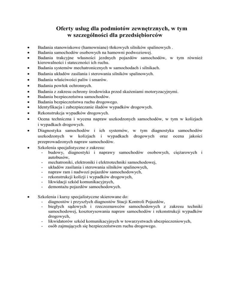 Oferty usług dla podmiotów zewnętrznych, w tym w szczególności dla przedsiębiorców Badania stanowiskowe (hamowniane) tłokowych silników spalinowych . Badania samochodów osobowych na hamowni podwoziowej. Badania trakcyjne własności jezdnych pojazdów samochodów, w tym również kierowalności i stateczności ich ruchu. Badania systemów mechatronicznych w samochodach i silnikach. Badania układów zasilania i sterowania silników spalinowych. Badania właściwości paliw i smarów. Badania powłok ochronnych. Badania z zakresu ochrony środowiska przed skażeniami motoryzacyjnymi. Badania bezpieczeństwa samochodów. Badania bezpieczeństwa ruchu drogowego. Identyfikacja i zabezpieczanie śladów wypadków drogowych. Rekonstrukcja wypadków drogowych. Ocena techniczna i wycena napraw uszkodzonych samochodów, w tym w kolizjach i wypadkach drogowych. Diagnostyka samochodów i ich systemów, w tym diagnostyka samochodów uszkodzonych w kolizjach i wypadkach drogowych oraz ocena jakości przeprowadzonych napraw samochodów. Szkolenia specjalistyczne z zakresu: - budowy, diagnostyki i naprawy samochodów osobowych, ciężarowych i autobusów, - mechatroniki, elektroniki i elektrotechniki samochodowej, - układów zasilania i sterowania silników spalinowych, - napraw ram i nadwozi pojazdów samochodowych, - rekonstrukcji kolizji i wypadków drogowych, - likwidacji szkód komunikacyjnych, - demontażu pojazdów samochodowych. Szkolenia i kursy specjalistyczne skierowane do: - diagnostów i przyszłych diagnostów Stacji Kontroli Pojazdów, - biegłych sądowych i rzeczoznawców samochodowych z zakresu techniki samochodowej, kosztorysowania napraw samochodów i rekonstrukcji wypadków drogowych, - likwidatorów szkód komunikacyjnych w towarzystwach ubezpieczeniowych, - osób zajmujących się bezpieczeństwem ruchu drogowego.
