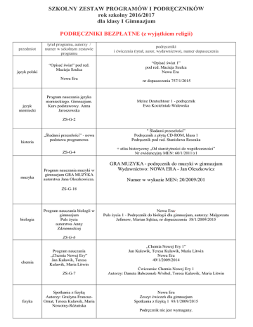 SZKOLNY ZESTAW PROGRAMÓW I PODRĘCZNIKÓW rok szkolny 2016/2017 dla klasy I Gimnazjum PODRĘCZNIKI BEZPŁATNE (z wyjątkiem religii) przedmiot język polski tytuł programu, autorzy / numer w szkolnym zestawie programu podręczniki i ćwiczenia (tytuł, autor, wydawnictwo), numer dopuszczenia “Opisać świat” pod red. Macieja Szulca “Opisać świat 1” pod red. Macieja Szulca Nowa Era Nowa Era język niemiecki Program nauczania języka niemieckiego. Gimnazjum. Kurs podstawowy. Anna Jaroszewska nr dopuszczenia 757/1/2015 Meine Deutschtour 1 - podręcznik Ewa Kocielniak-Walewska ZS-G-2 historia muzyka „Śladami przeszłości” - nowa podstawa programowa " Śladami przeszłości” Podręcznik z płytą CD-ROM, klasa 1 Podręcznik pod red. Stanisława Roszaka ZS-G-4 + atlas historyczny „Od starożytności do współczesności” Nr ewidencyjny MEN: 60/1/2011/z1 Program nauczania muzyki w gimnazjum GRA MUZYKA autorstwa Jana Oleszkowicza. GRA MUZYKA - podręcznik do muzyki w gimnazjum Wydawnictwo: NOWA ERA - Jan Oleszkowicz Numer w wykazie MEN: 20/2009/201 ZS-G-18 biologia Program nauczania biologii w gimnazjum Puls życia autorstwa Anny Zdziennickiej Nowa Era: Puls życia 1 - Podręcznik do biologii dla gimnazjum, autorzy: Małgorzata Jefimow, Marian Sęktas, nr dopuszczenia 58/1/2009/2015 ZS-G-6 chemia Program nauczania „Chemia Nowej Ery” Jan Kulawik, Teresa Kulawik, Maria Litwin ZS-G-7 fizyka Spotkania z fizyką Autorzy: Grażyna FrancuzOrnat, Teresa Kulawik, Maria Nowotny-Różańska „Chemia Nowej Ery 1” Jan Kulawik, Teresa Kulawik, Maria Litwin Nowa Era 49/1/2009/2014 Ćwiczenia: Chemia Nowej Ery 1 Autorzy: Danuta Babczonek-Wróbel, Teresa Kulawik, Maria Litwin Nowa Era Zeszyt ćwiczeń dla gimnazjum Spotkania z fizyką 1 93/1/2009/2015 Podręcznik nie jest wymagany. ZS-G-8 matematyka Matematyka z plusem. Program nauczania matematyki w gimnazjum M. Jucewicz, M. Karpiński, J. Lech wyd. GWO Podręcznik autorzy: praca zbiorowa pod redakcją M. Dobrowolskiej nr w wykazie MEN: 168/1/2015/z1 ZS-G-9 plastyka Marta Ipczyńska Natalia Mrozkowiak Sztuka tworzenia Program nauczania przedmiotu plastyka w gimnazjum Sztuka Tworzenia Autor: Natalia Mrozkowiak NOWA ERA MEN 725/2014 ZS-G-19 Tytuł programu: Informatyka nie tylko dla uczniów informatyka Autorzy: Krawczyński Edward, Wilk Maria, Talaga Zbigniew Podręcznik nie jest wymagany. Wydawnictwo: Wydawnictwo Szkolne PWN (WszPWN) ZS-G-10 wychowanie do życia w rodzinie Program nauczania: Wędrując ku dorosłości, Teresa Król Podręcznik nie jest wymagany. ZS-G-12 Spotkanie ze Słowem. religia J. Szpet D. Jackowiak ZS-G-13 technika „Zajęcia techniczne” U. Białka wyd. Operon Spotkanie ze Słowem. Tylko podręcznik Św. Wojciech AZ-31-01/10-PO-1/11 Podręcznik nie jest wymagany. ZS-G-14 język angielski Program nauczania języka angielskiego. Kurs kontynuacyjny dla klas 1-3 gimnazjum. Poziom III.1 Autorzy: Melanie Ellis, Marianna Niesobska Oxford University Press New English Plus 2 Ben Wetz, James Styring, Nicholas Tims, Jenny Quintana, Alicja Gałązka Oxford University Press 732/2/2015 + ćwiczenia ZS-G-3 geografia Program nauczania geografii dla gimnazjum - Planeta Nowa, Ewa Maria Tuz,Dawid Podręcznik – Planeta Nowa 1, Roman Malarz, Nowa Era, Ćwiczenia - Planeta Nowa 1,Ewa Ćwiklińska, Anna Wawrzkowicz, Justyna Knopik, Kamila Skomoroko , Nowa Era 7/1/2009/2015 Szczypiński, Nowa Era ZS-G-16 wychowanie fizyczne Koncepcja edukacji fizycznej Zdrowie- sport- rekreacja(gimnazjum) Urszula Kierczak Janusz Jonta ZS-G-17