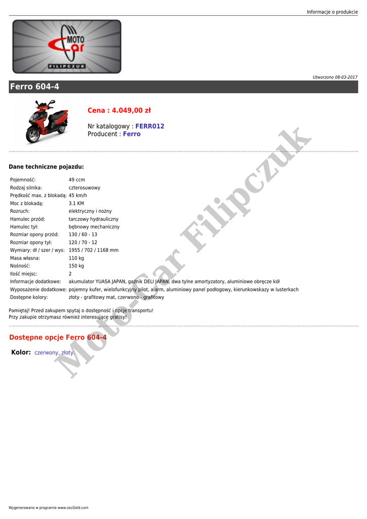 Informacje o produkcie Utworzono 08-03-2017 Ferro 604-4 Cena : 4.049,00 zł zu k Nr katalogowy : FERR012 Producent : Ferro Pojemność: 49 ccm Rodzaj silnika: czterosuwowy lip c Dane techniczne pojazdu: Moc z blokadą: 3.1 KM Rozruch: elektryczny i nożny Hamulec przód: tarczowy hydrauliczny Hamulec tył: bębnowy mechaniczny Rozmiar opony przód: 130 / 60 - 13 Rozmiar opony tył: 120 / 70 - 12 Fi Prędkość max. z blokadą: 45 km/h Wymiary: dł / szer / wys: 1955 / 702 / 1168 mm 110 kg Nośność: 150 kg Ilość miejsc: 2 Informacje dodatkowe: akumulator YUASA JAPAN, gaźnik DELI JAPAN, dwa tylne amortyzatory, aluminiowe obręcze kół ar Masa własna: Dostępne kolory: oC Wyposażenie dodatkowe: pojemny kufer, wielofunkcyjny pilot, alarm, aluminiowy panel podłogowy, kierunkowskazy w lusterkach złoty - grafitowy mat, czerwono - grafitowy ot Pamiętaj! Przed zakupem spytaj o dostępność i opcje transportu! Przy zakupie otrzymasz również interesujące gratisy! Dostępne opcje Ferro 604-4 M Kolor: czerwony, złoty. Wygenerowano w programie www.oscGold.com