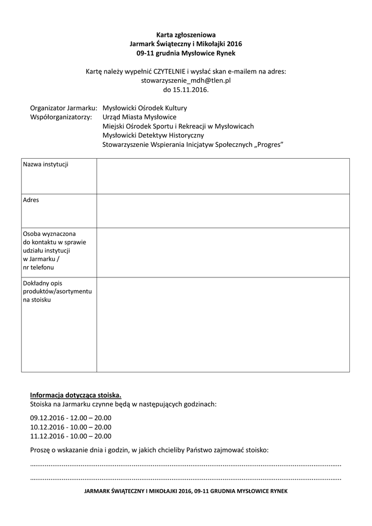 Karta zgłoszeniowa Jarmark Świąteczny i Mikołajki 2016 09-11 grudnia Mysłowice Rynek Kartę należy wypełnić CZYTELNIE i wysłać skan e-mailem na adres: [email protected] do 15.11.2016. Organizator Jarmarku: Mysłowicki Ośrodek Kultury Współorganizatorzy: Urząd Miasta Mysłowice Miejski Ośrodek Sportu i Rekreacji w Mysłowicach Mysłowicki Detektyw Historyczny Stowarzyszenie Wspierania Inicjatyw Społecznych „Progres” Nazwa instytucji Adres Osoba wyznaczona do kontaktu w sprawie udziału instytucji w Jarmarku / nr telefonu Dokładny opis produktów/asortymentu na stoisku Informacja dotycząca stoiska. Stoiska na Jarmarku czynne będą w następujących godzinach: 09.12.2016 - 12.00 – 20.00 10.12.2016 - 10.00 – 20.00 11.12.2016 - 10.00 – 20.00 Proszę o wskazanie dnia i godzin, w jakich chcieliby Państwo zajmować stoisko: …............................................................................................................................................................…... …............................................................................................................................................................…... JARMARK ŚWIĄTECZNY I MIKOŁAJKI 2016, 09-11 GRUDNIA MYSŁOWICE RYNEK Oświadczam, że nasza instytucja zobowiązuje się do zajmowania stoiska we wskazanych dniach i godzinach. W innym przypadku przyjmuję do wiadomości, że nasza instytucja nie zostanie zaproszona do udziału w kolejnych Jarmarkach. …................................................................. Data i podpis zgodnie z reprezentacją JARMARK ŚWIĄTECZNY I MIKOŁAJKI 2016, 09-11 GRUDNIA MYSŁOWICE RYNEK
