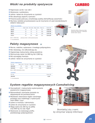 Wózki na produkty spożywcze Pojemności od 81 l do 140 l Wykonane z polietylenu Lekkie i łatwe do utrzymania w czystości Nie absorbują zapachu żywności Przezroczyste pokrywy umożliwiają szybką identyfikację zawartości Wymiary wózków przystosowane są do trzymania ich pod standardowymi stołami roboczymi Wózek na produkty Nr. kat. Szer. (cm) Dł. (cm) Wys. (cm) Poj. (L) Cena (zł) IBS20 33 75 71 81 1205,00 IBS27 42 75 71 102 1320,00 IBS37 55 75 71 140 1287,00 CC32* 56 61 58,5 121 1914,00 kolor: (148) biały IBS20 IBS27 IBS37 CC32 Szerokie kółka z litej gumy dają doskonałą stabilność i udźwigną bardzo duże ciężary. pokrywa kolor: (135) przezroczysta *- na zamówienie Palety magazynowe Mocne, stabilne, wykonane z trwałego polipropylenu Nie rdzewieją, nie odkształcają się Zapewniają maksymalny obieg powietrza Wytrzymują ciężar do 680 kg lub 1360 kg Nie wymagają montażu Lekkie i łatwe do utrzymania w czystości Paleta magazynowa Nr. kat. Szer. (cm) Dł. (cm) Wys. (cm) Waga nośna (kg) Cena (zł) DRS300 76 53,3 30 680 726,00 DRS600 152,5 53,3 30 1360 1089,00 kolor: (480) nakrapiany szary Camlink* Nr. kat. Cena (zł) DRLINK 8,00 *- na zamówienie System regałów magazynowych Camshelving Oszczędność i maksymalne wykorzystanie powierzchni magazynowej Różnorodność rozmiarów pozwala na dopasowanie do pomieszczenia Możliwość stworzenia regału narożnego, prostego oraz mobilnego z wykorzystaniem kółek i szyn Łatwe w montażu i demontażu Łatwe do utrzymania w czystości Waga nośna do 200 kg na półkę oraz 800 kg na cały regał Wykonane ze stalowego profilu powlekanego polipropylenem Skontaktuj się z nami, by otrzymać więcej informacji - sztaplowane 29