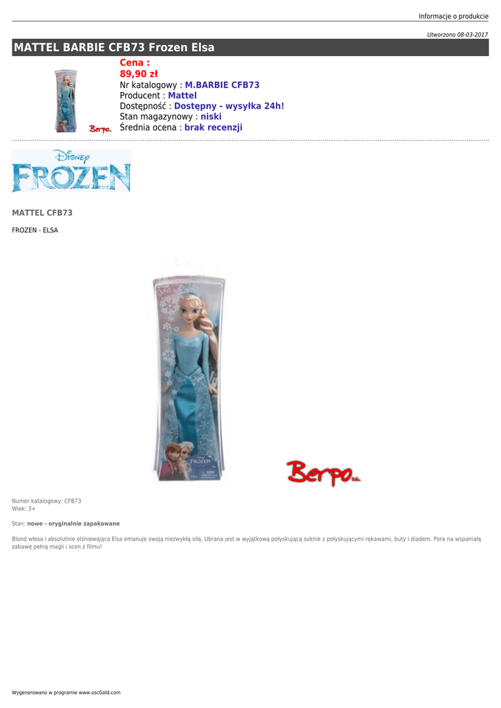 Informacje o produkcie Utworzono 08-03-2017 MATTEL BARBIE CFB73 Frozen Elsa Cena : 89,90 zł Nr katalogowy : M.BARBIE CFB73 Producent : Mattel Dostępność : Dostępny - wysyłka 24h! Stan magazynowy : niski Średnia ocena : brak recenzji MATTEL CFB73 FROZEN - ELSA Numer katalogowy: CFB73 Wiek: 3+ Stan: nowe - oryginalnie zapakowane Blond włosa i absolutnie olśniewająca Elsa emanuje swoją niezwykłą siłą. Ubrana jest w wyjątkową połyskującą suknie z połyskującymi rękawami, buty i diadem. Pora na wspaniałą zabawę pełną magii i scen z filmu! Wygenerowano w programie www.oscGold.com Informacje o produkcie Dostępność w salonach: Ilość sztuk: Sklep - Złotniki: 1 Sklep - zlikwidowany: 0 Sklep - Szczepankowo: 0 Dostępne opcje MATTEL BARBIE CFB73 Frozen Elsa » Wiek: 3 - 4 lat, 5 - 7 lat, 8 - 11 lat. Wygenerowano w programie www.oscGold.com