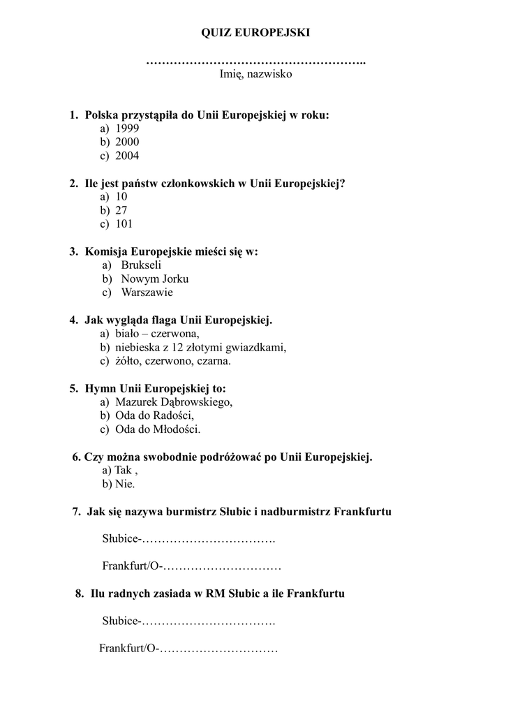 QUIZ EUROPEJSKI ……………………………………………….. Imię, nazwisko 1. Polska przystąpiła do Unii Europejskiej w roku: a) 1999 b) 2000 c) 2004 2. Ile jest państw członkowskich w Unii Europejskiej? a) 10 b) 27 c) 101 3. Komisja Europejskie mieści się w: a) Brukseli b) Nowym Jorku c) Warszawie 4. Jak wygląda flaga Unii Europejskiej. a) biało – czerwona, b) niebieska z 12 złotymi gwiazdkami, c) żółto, czerwono, czarna. 5. Hymn Unii Europejskiej to: a) Mazurek Dąbrowskiego, b) Oda do Radości, c) Oda do Młodości. 6. Czy można swobodnie podróżować po Unii Europejskiej. a) Tak , b) Nie. 7. Jak się nazywa burmistrz Słubic i nadburmistrz Frankfurtu Słubice-……………………………. Frankfurt/O-………………………… 8. Ilu radnych zasiada w RM Słubic a ile Frankfurtu Słubice-……………………………. Frankfurt/O-………………………… 9. Ile gwiazdek znajduje się na fladze Unii Europejskiej? a)15 b)25 c)12 d)10 10. W którym z tych krajów nie wprowadzono waluty Euro? a) NIEMCY b) HOLANDIA c) BELGIA d)SZEWCJA 11. Jakie kolory są na niemieckiej fladze od góry? a. czarny, czerwony, żółty b. niebieski, żółty, czerwony c. czarny, żółty, czerwony 12. W której stolicy europejskiej znajduje sie najstarsze metro w Europie? a. w Pradze b. w Paryżu c. w Lizbonie d. w Londynie 13.Nikozja jest stolicą a. Cypru b. Grecji c. Rumunii d. Bułgarii 14.Największy obszarowo kraj Unii Europejskiej to: a. Polska b. Hiszpania c. Niemcy d. Francja
