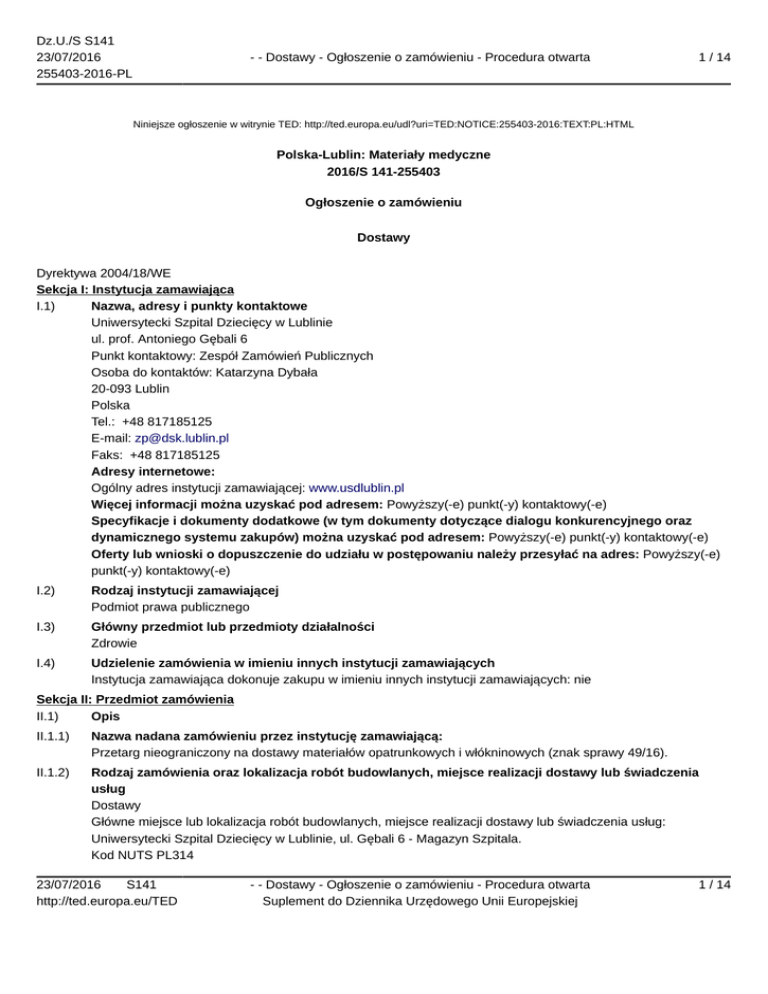 Dz.U./S S141 23/07/2016 255403-2016-PL - - Dostawy - Ogłoszenie o zamówieniu - Procedura otwarta 1 / 14 Niniejsze ogłoszenie w witrynie TED: http://ted.europa.eu/udl?uri=TED:NOTICE:255403-2016:TEXT:PL:HTML Polska-Lublin: Materiały medyczne 2016/S 141-255403 Ogłoszenie o zamówieniu Dostawy Dyrektywa 2004/18/WE Sekcja I: Instytucja zamawiająca I.1) Nazwa, adresy i punkty kontaktowe Uniwersytecki Szpital Dziecięcy w Lublinie ul. prof. Antoniego Gębali 6 Punkt kontaktowy: Zespół Zamówień Publicznych Osoba do kontaktów: Katarzyna Dybała 20-093 Lublin Polska Tel.: +48 817185125 E-mail: [email protected] Faks: +48 817185125 Adresy internetowe: Ogólny adres instytucji zamawiającej: www.usdlublin.pl Więcej informacji można uzyskać pod adresem: Powyższy(-e) punkt(-y) kontaktowy(-e) Specyfikacje i dokumenty dodatkowe (w tym dokumenty dotyczące dialogu konkurencyjnego oraz dynamicznego systemu zakupów) można uzyskać pod adresem: Powyższy(-e) punkt(-y) kontaktowy(-e) Oferty lub wnioski o dopuszczenie do udziału w postępowaniu należy przesyłać na adres: Powyższy(-e) punkt(-y) kontaktowy(-e) I.2) Rodzaj instytucji zamawiającej Podmiot prawa publicznego I.3) Główny przedmiot lub przedmioty działalności Zdrowie I.4) Udzielenie zamówienia w imieniu innych instytucji zamawiających Instytucja zamawiająca dokonuje zakupu w imieniu innych instytucji zamawiających: nie Sekcja II: Przedmiot zamówienia II.1) Opis II.1.1) Nazwa nadana zamówieniu przez instytucję zamawiającą: Przetarg nieograniczony na dostawy materiałów opatrunkowych i włókninowych (znak sprawy 49/16). II.1.2) Rodzaj zamówienia oraz lokalizacja robót budowlanych, miejsce realizacji dostawy lub świadczenia usług Dostawy Główne miejsce lub lokalizacja robót budowlanych, miejsce realizacji dostawy lub świadczenia usług: Uniwersytecki Szpital Dziecięcy w Lublinie, ul. Gębali 6 - Magazyn Szpitala. Kod NUTS PL314 23/07/2016 S141 http://ted.europa.eu/TED - - Dostawy - Ogłoszenie o zamówieniu - Procedura otwarta Suplement do Dziennika Urzędowego Unii Europejskiej 1 / 14 Dz.U./S S141 23/07/2016 255403-2016-PL - - Dostawy - Ogłoszenie o zamówieniu - Procedura otwarta 2 / 14 II.1.3) Informacje na temat zamówienia publicznego, umowy ramowej lub dynamicznego systemu zakupów (DSZ) Ogłoszenie dotyczy zamówienia publicznego II.1.4) Informacje na temat umowy ramowej II.1.5) Krótki opis zamówienia lub zakupu Materiały opatrunkowe i włókninowe. II.1.6) Wspólny Słownik Zamówień (CPV) 33140000 II.1.7) Informacje na temat Porozumienia w sprawie zamówień rządowych (GPA) Zamówienie jest objęte Porozumieniem w sprawie zamówień rządowych (GPA): nie II.1.8) Części To zamówienie podzielone jest na części: tak Oferty można składać w odniesieniu do jednej lub więcej części II.1.9) Informacje o ofertach wariantowych Dopuszcza się składanie ofert wariantowych: nie II.2) Wielkość lub zakres zamówienia II.2.1) Całkowita wielkość lub zakres: Pow. 134 000 tys EUR. II.2.2) Informacje o opcjach Opcje: nie II.2.3) Informacje o wznowieniach Jest to zamówienie podlegające wznowieniu: nie II.3) Czas trwania zamówienia lub termin realizacji Okres w miesiącach: 36 (od udzielenia zamówienia) Informacje o częściach zamówienia Część nr: 1 Nazwa: Plaster na skórne rany pooperacyjne 1) Krótki opis 2) Wspólny Słownik Zamówień (CPV) 33140000 3) Wielkość lub zakres 4) Informacje o różnych datach dotyczących czasu trwania lub rozpoczęcia/realizacji zamówienia 5) Informacje dodatkowe na temat części zamówienia Część nr: 2 Nazwa: Podkład pod opatrunek syntetyczny (podkład pod gips) 1) Krótki opis 2) Wspólny Słownik Zamówień (CPV) 33140000 3) Wielkość lub zakres 4) Informacje o różnych datach dotyczących czasu trwania lub rozpoczęcia/realizacji zamówienia 5) Informacje dodatkowe na temat części zamówienia 23/07/2016 S141 http://ted.europa.eu/TED - - Dostawy - Ogłoszenie o zamówieniu - Procedura otwarta Suplement do Dziennika Urzędowego Unii Europejskiej 2 / 14 Dz.U./S S141 23/07/2016 255403-2016-PL - - Dostawy - Ogłoszenie o zamówieniu - Procedura otwarta 3 / 14 Część nr: 3 Nazwa: Folie chirurgiczne 1) Krótki opis 2) Wspólny Słownik Zamówień (CPV) 33140000 3) Wielkość lub zakres 4) Informacje o różnych datach dotyczących czasu trwania lub rozpoczęcia/realizacji zamówienia 5) Informacje dodatkowe na temat części zamówienia Część nr: 4 Nazwa: Elastyczna opaska podtrzymująca 1) Krótki opis 2) Wspólny Słownik Zamówień (CPV) 33140000 3) Wielkość lub zakres 4) Informacje o różnych datach dotyczących czasu trwania lub rozpoczęcia/realizacji zamówienia 5) Informacje dodatkowe na temat części zamówienia Część nr: 5 Nazwa: Szyny aluminiowe do unieruchamiania palców 1) Krótki opis 2) Wspólny Słownik Zamówień (CPV) 33140000 3) Wielkość lub zakres 4) Informacje o różnych datach dotyczących czasu trwania lub rozpoczęcia/realizacji zamówienia 5) Informacje dodatkowe na temat części zamówienia Część nr: 6 Nazwa: Sprzęt medyczny 1) Krótki opis 2) Wspólny Słownik Zamówień (CPV) 33140000 3) Wielkość lub zakres 4) Informacje o różnych datach dotyczących czasu trwania lub rozpoczęcia/realizacji zamówienia 5) Informacje dodatkowe na temat części zamówienia Część nr: 7 Nazwa: Opaski opatrunkowe dziane, opaski elastyczne tkane 1) Krótki opis 2) Wspólny Słownik Zamówień (CPV) 33140000 3) Wielkość lub zakres 4) Informacje o różnych datach dotyczących czasu trwania lub rozpoczęcia/realizacji zamówienia 5) Informacje dodatkowe na temat części zamówienia 23/07/2016 S141 http://ted.europa.eu/TED - - Dostawy - Ogłoszenie o zamówieniu - Procedura otwarta Suplement do Dziennika Urzędowego Unii Europejskiej 3 / 14 Dz.U./S S141 23/07/2016 255403-2016-PL - - Dostawy - Ogłoszenie o zamówieniu - Procedura otwarta 4 / 14 Część nr: 8 Nazwa: Pieluchy dla dzieci 1) Krótki opis 2) Wspóln